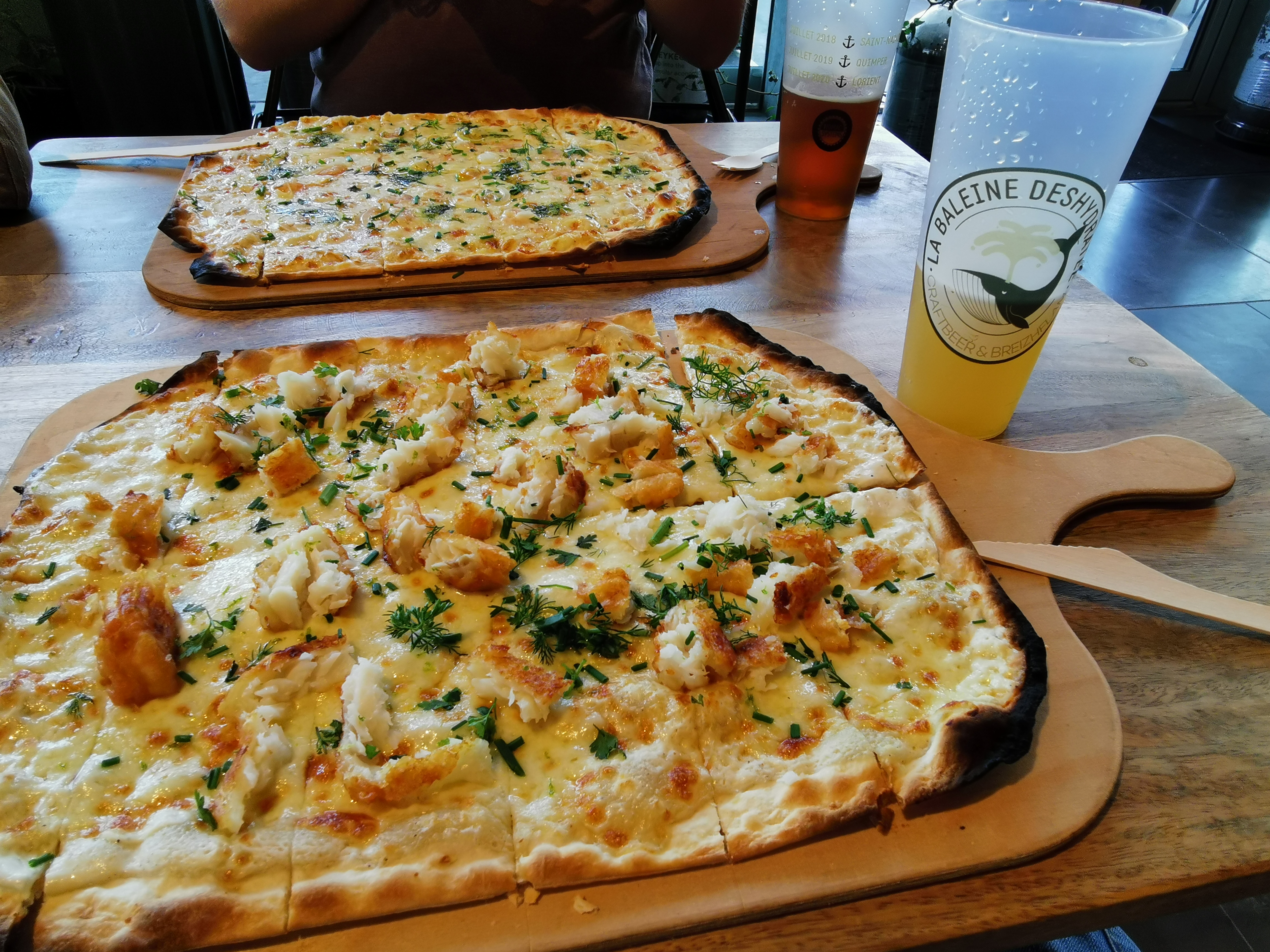 bonjour, resto bien agréable, adapté aux familles. cuisine BreizhFlam et autres hamburgers maisons copieux et très bon ! nous avons été pris en main de suite et servis en 20 min par une équipe dynamique de 3 personnels alors que la salle était déjà bien remplie. Le temps pour nous de découvrir à notre rythme qq bières - une trentaine présente - en libre accès grâce à notre carte la baleine. ( vous prenez ce que vous voulez dans la quantité que vous souhaitez ) Le décor ... voyez les photos, elles parlent d'elles-mêmes ( mention spéciale pour les toilettes ! ) les + : la qualité des plats , des desserts et des bières . et l'acoustique de la grande pièce, on se parle aisément sans être assourdi. les ++ : une équipe dynamique et souriante et même un doggy bag maison parce que je n'avais plus faim ( en fait, j'avais surtout soif...) bref : nous avons très bien mangé et découvert des bières fort sympathiques ! hâte d'y retourner, la baleine a toujours soif !