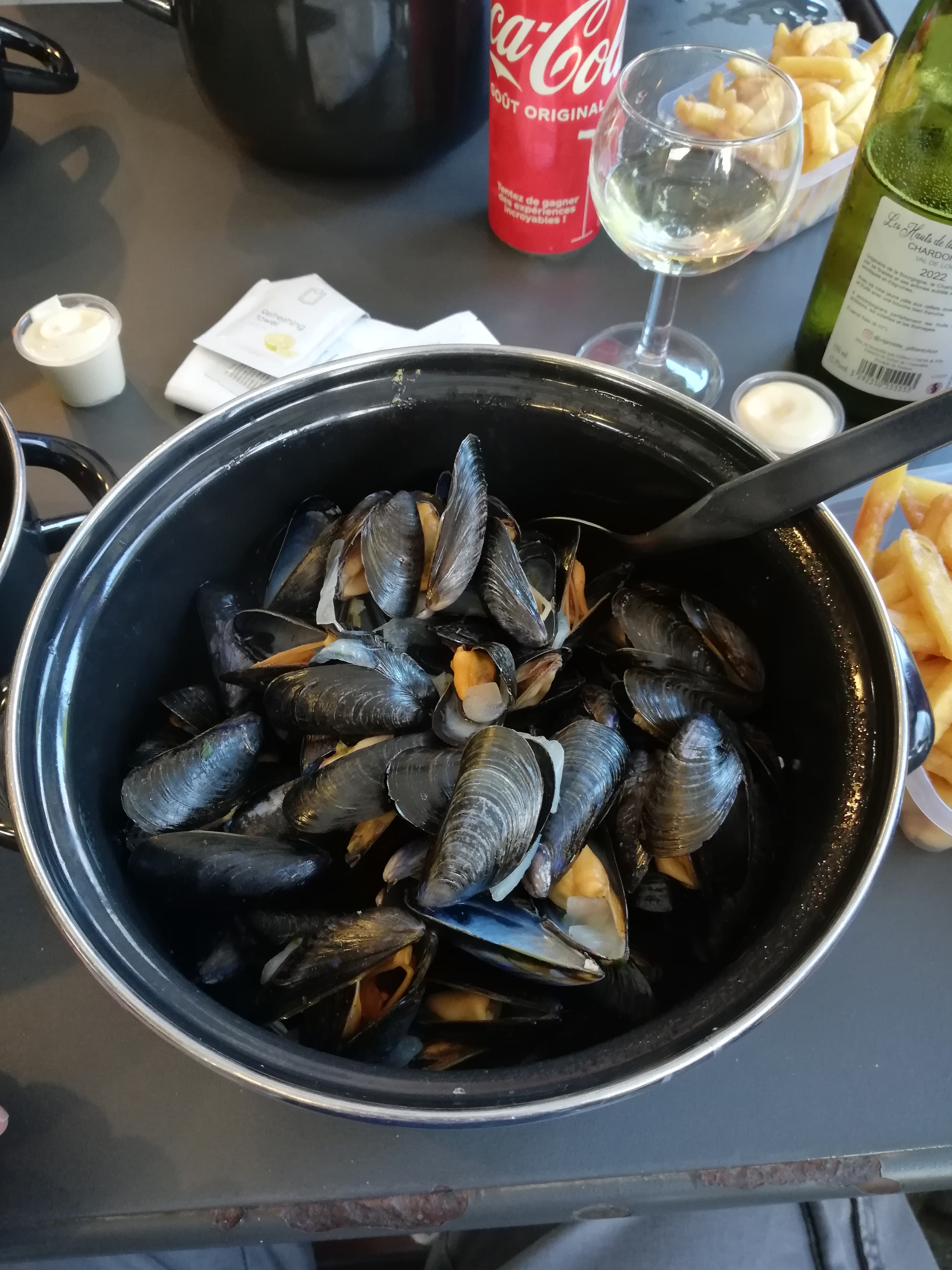 Debut mai 2023.Arret au hasard car estomacs dans les talons .Moules frites et kir bretons pour 3 que nous avons déguster avec délice ! ! Les premières moules bouchots nous a indiqué le patron merciii à bientôt j'espère 🤩😘🤗 vive nounours sont trop choux😍