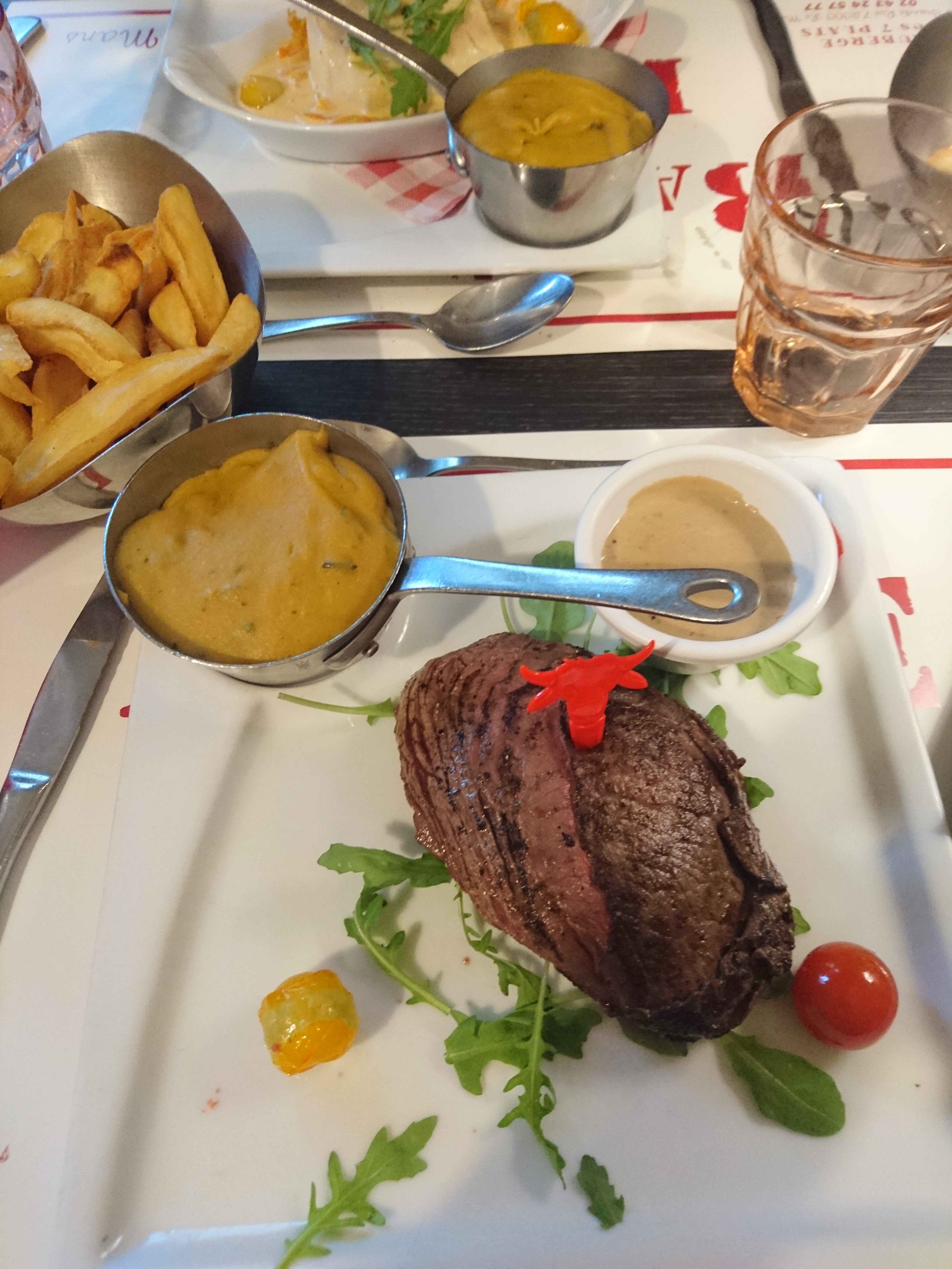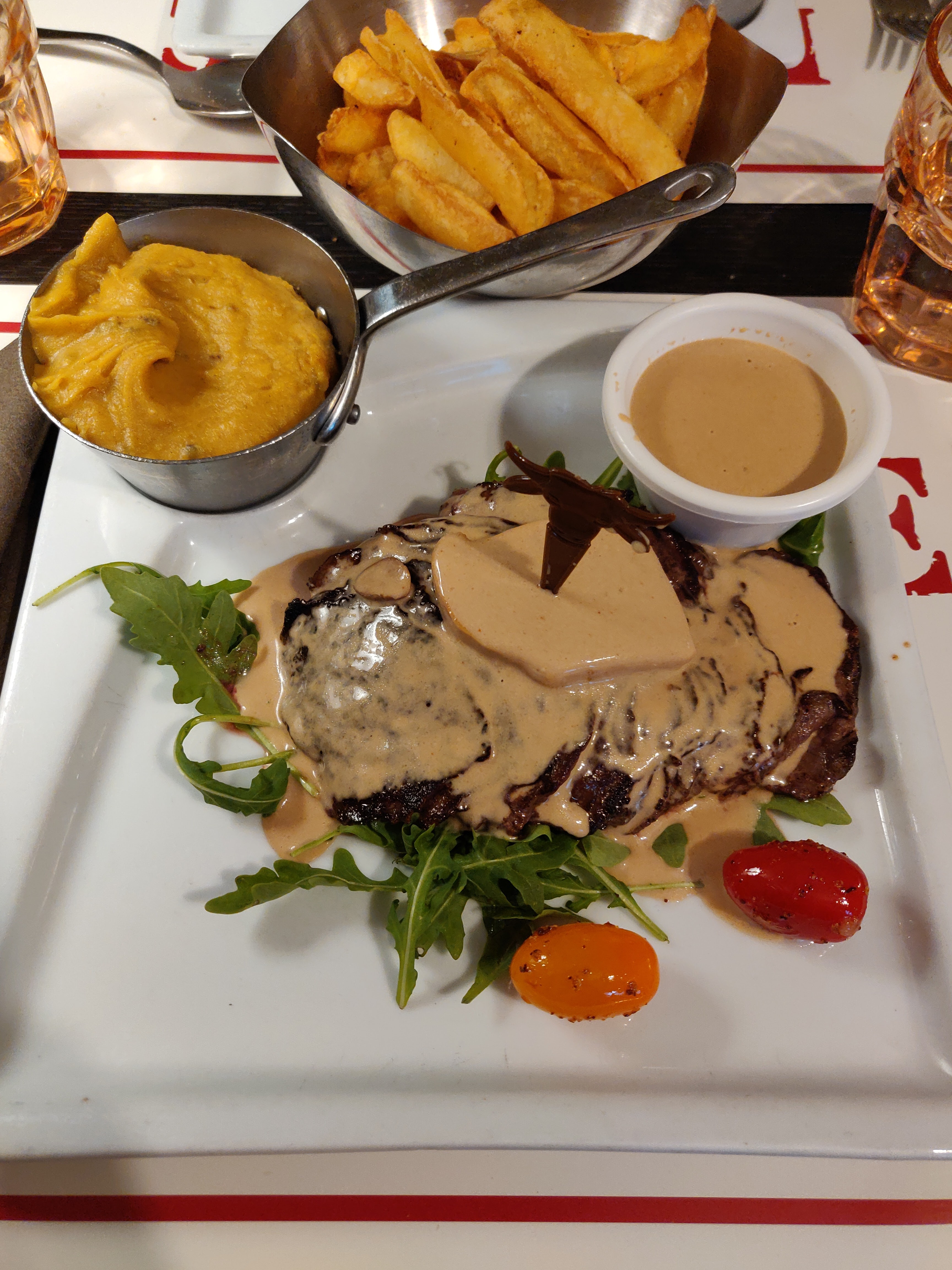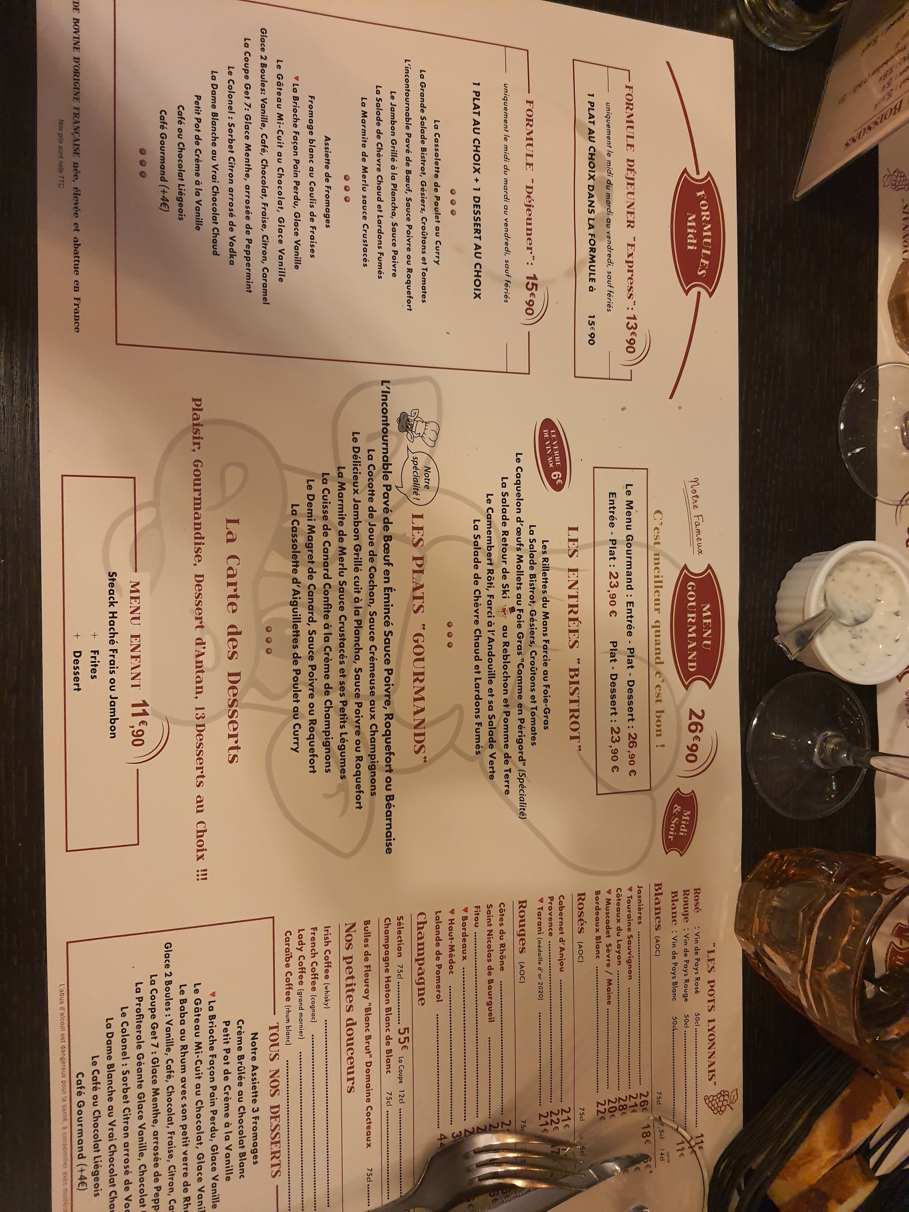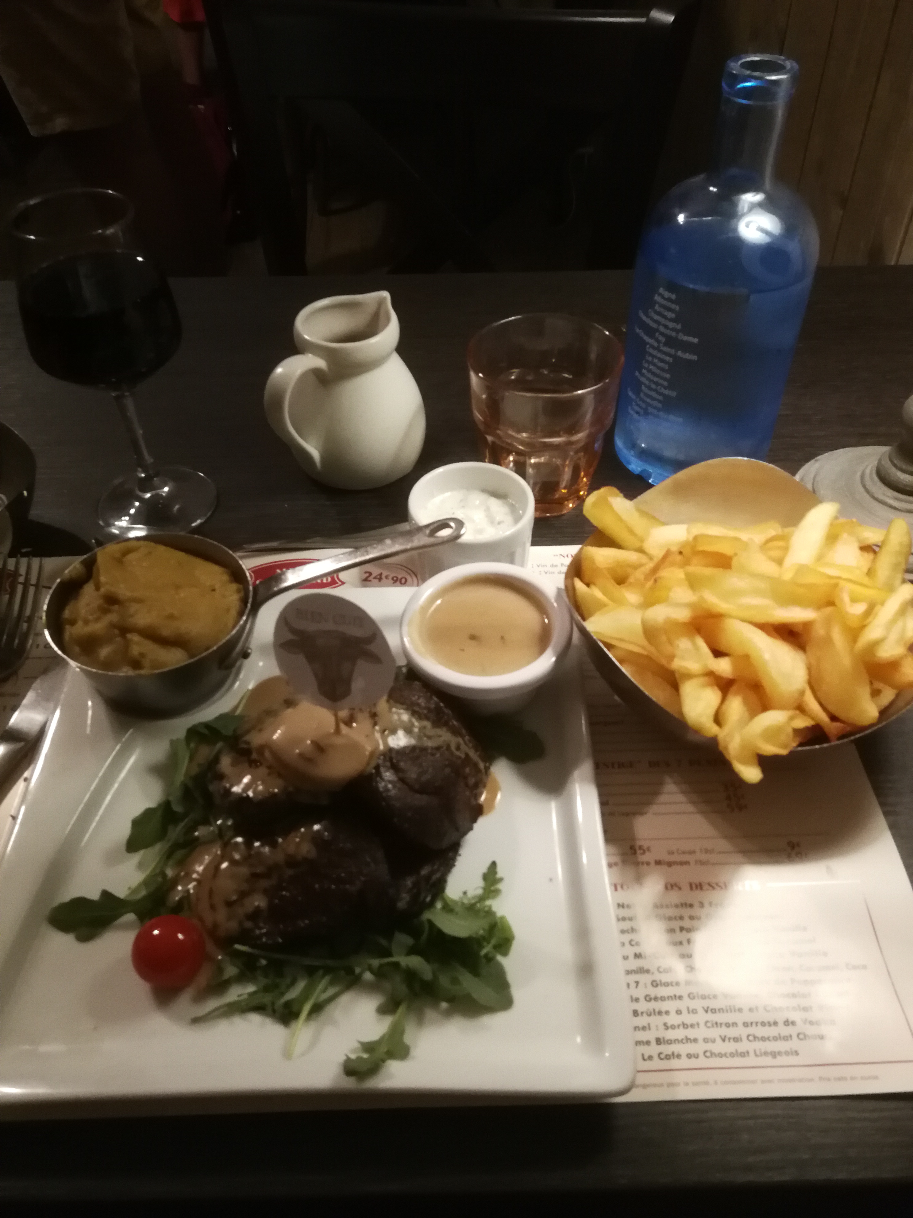 Ambiance de fous, serveurs adorable , il nous ont offert un coca et une verines de chantilly pour mon Birthday hyper bourratif j’ai pris un lève de bœuf façon Rossini galère à manger mais bon purée venue assez froide mais la purée et les frites sont maisons et à volonté donc après tout étais chaud mais faites attention la carte en ligne n’ai pas trop au norme. Carte qui change jamais mais ceci n’est pas dérangeant . Bref une tuerie, tu a plus faim après ,et serveurs trop drôles et charmants 👏🏻