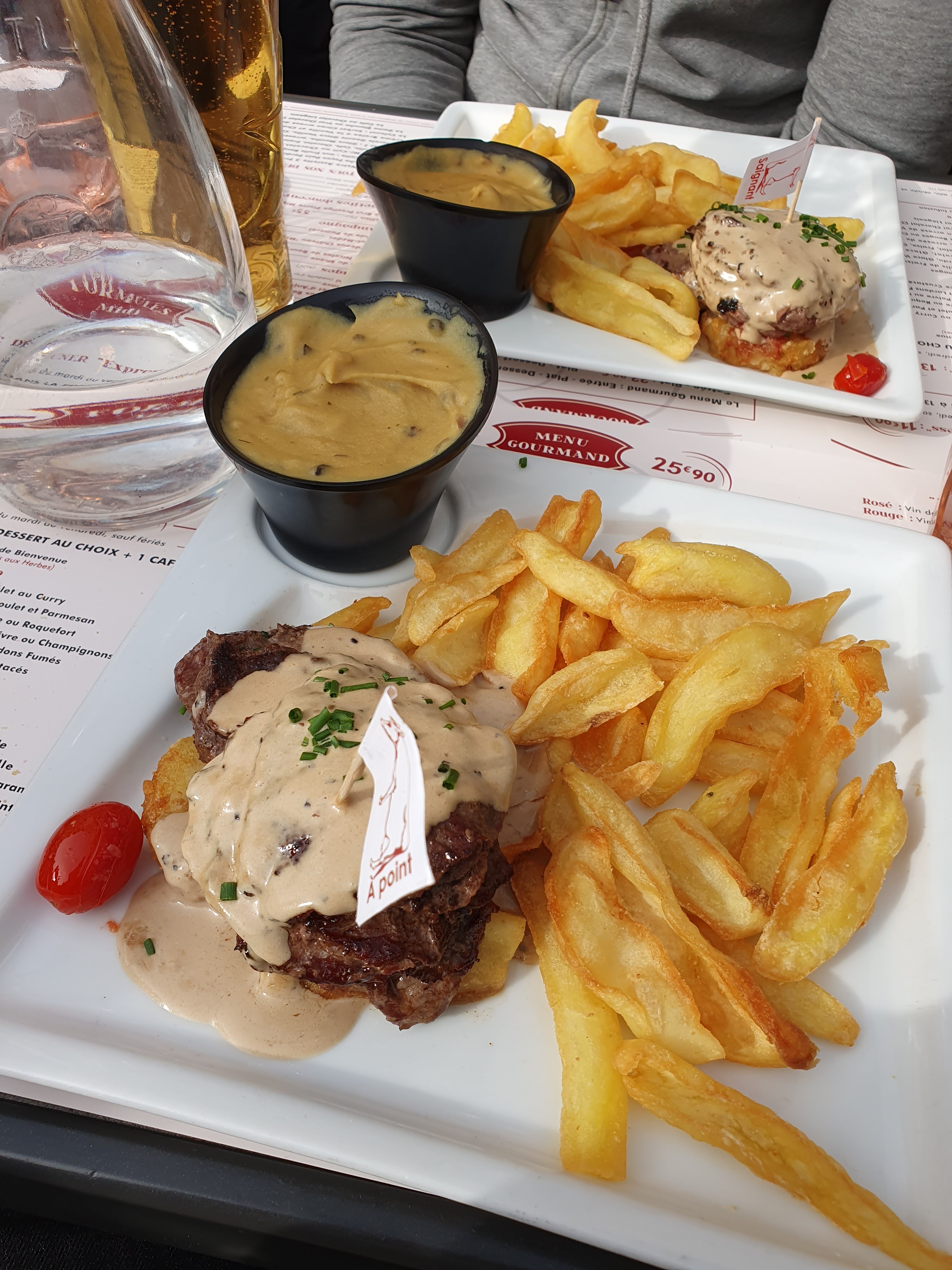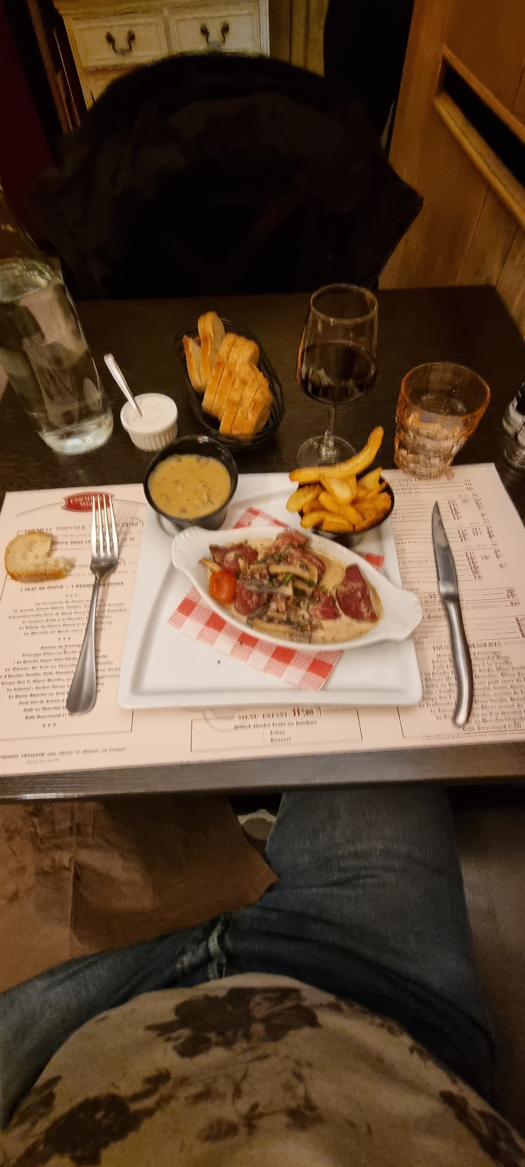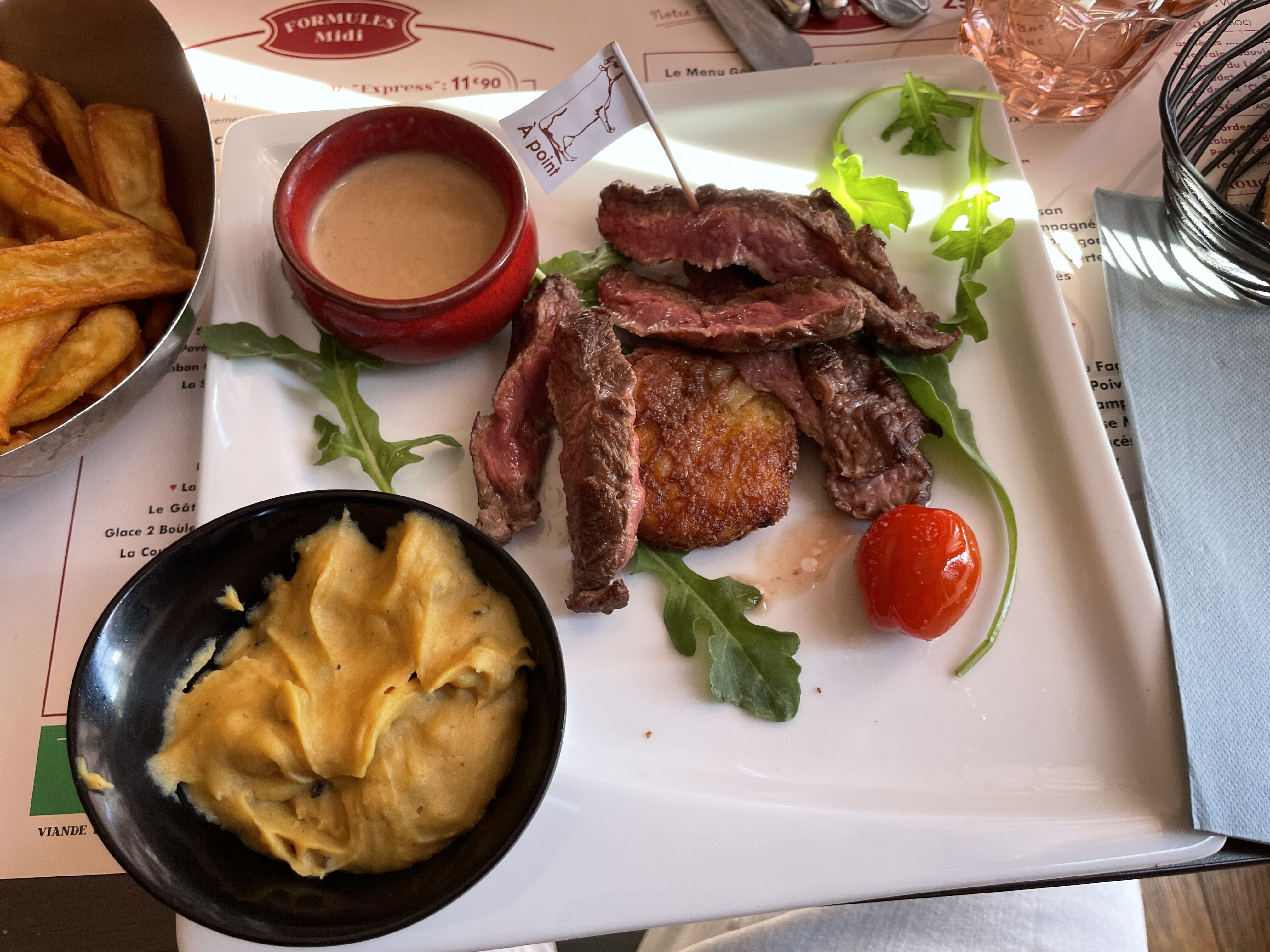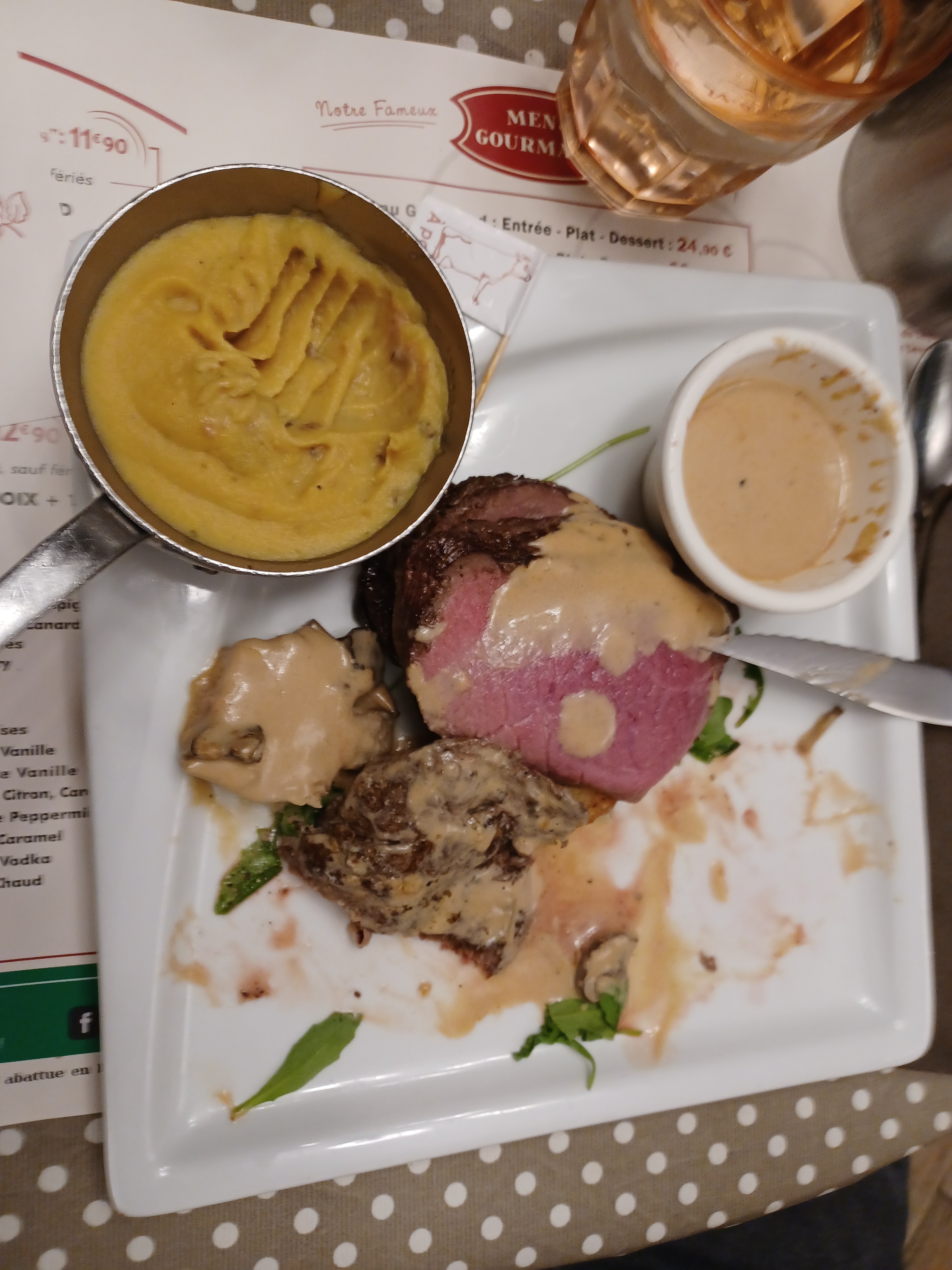Ambiance de fous, serveurs adorable , il nous ont offert un coca et une verines de chantilly pour mon Birthday hyper bourratif j’ai pris un lève de bœuf façon Rossini galère à manger mais bon purée venue assez froide mais la purée et les frites sont maisons et à volonté donc après tout étais chaud mais faites attention la carte en ligne n’ai pas trop au norme. Carte qui change jamais mais ceci n’est pas dérangeant . Bref une tuerie, tu a plus faim après ,et serveurs trop drôles et charmants 👏🏻