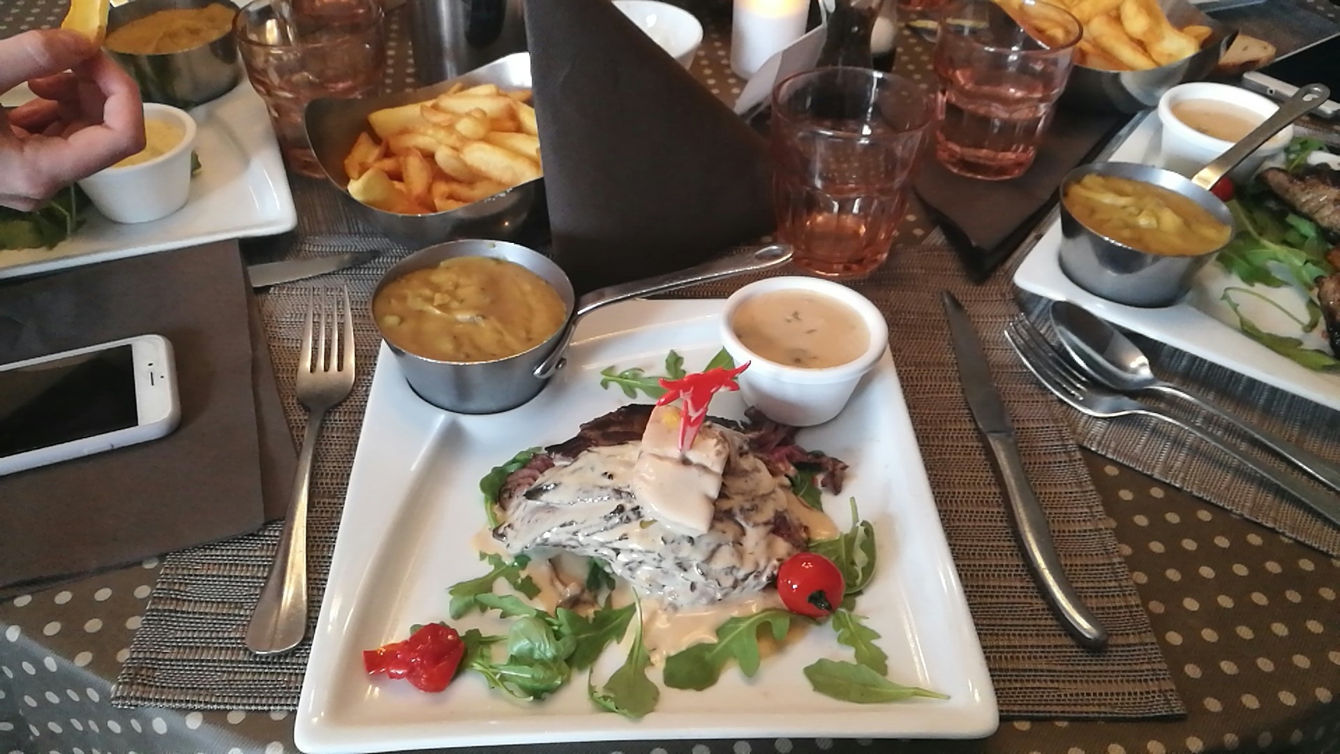 Le bœuf était fantastique. Cuit à la perfection puis tranché très finement, presque comme un carpaccio de bœuf. Les chips et la purée de pommes de terre aux champignons étaient également délicieuses. Même s'ils ont réussi à nous accueillir, il est probablement préférable de réserver à l'avance car le restaurant était très fréquenté. Je le recommanderais certainement!