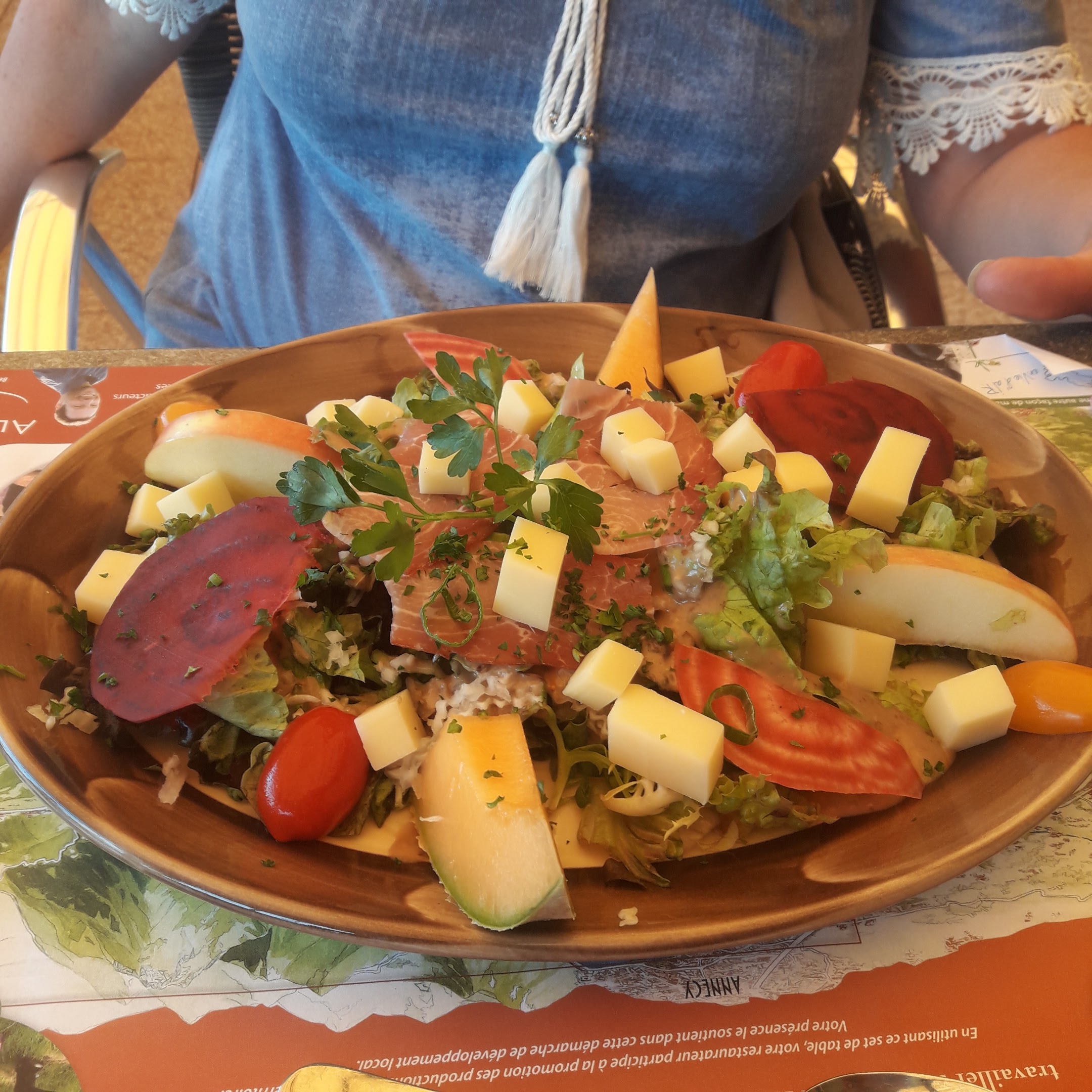 Bonne impression au téléphone lors de la prise de rendez-vous, mais une fois sur place le contact client n'était pas le même. Nous avons été assez déçus. Le restaurant ayant changé de propriétaires, nous n'avions trouvé aucune carte des menus récents sur Internet, ni photo des plats (si ce n'est les menus spéciaux fêtes des pères et des mères, mais obsolètes). Je joins donc les photos du moment pour ceux que ça intéresseraient de savoir ce qu'on peut y trouver et à quel prix. Les produits étaient frais. La salade un peu chère pour ce qu'il y avait dans l'assiette (3 petites tartines chèvre miel, beaucoup de salade, quelques bouts de tomates et quelques tranches de jambon sec pour ... 18€). Tartiflette nikel (18€ également). Pour un restaurant de terroir il est dommage de proposer une viande black Angus en provenance d'Argentine (par effet de mode sûrement) quand on sait que la Savoie a de très bonnes variétés de ce côté là. A plusieurs reprises la serveuse a regardé notre table sans juger bon de venir nous voir pour nous demander si tout se passait bien ou débarrasser la table alors que nous avions terminé depuis 30min. Une table de 14 personnes a eu le temps d'être servie après nous et pourtant débarrassée avant nous. Visiblement il est préférable de venir à plusieurs plutôt qu'à deux pour qu'on s'occupe de vous. Nous n'avons pas eu la patience d'attendre pour un dessert qui nous aurait pourtant bien tenté... Mais personne du service ne s'en est soucié. La personne de la caisse avait l'air réticente à ce que nous payions une partie en Ticket restaurant (alors que nous voulions mettre juste 18 €) et sans savoir combien nous souhaitions utilisé, elle nous a imposé un montant à ne pas dépasser en Ticket restaurant (19€ maximum) par addition et non par personne... Bons plats, joli cadre, mais service clientèle et amabilité à revoir.