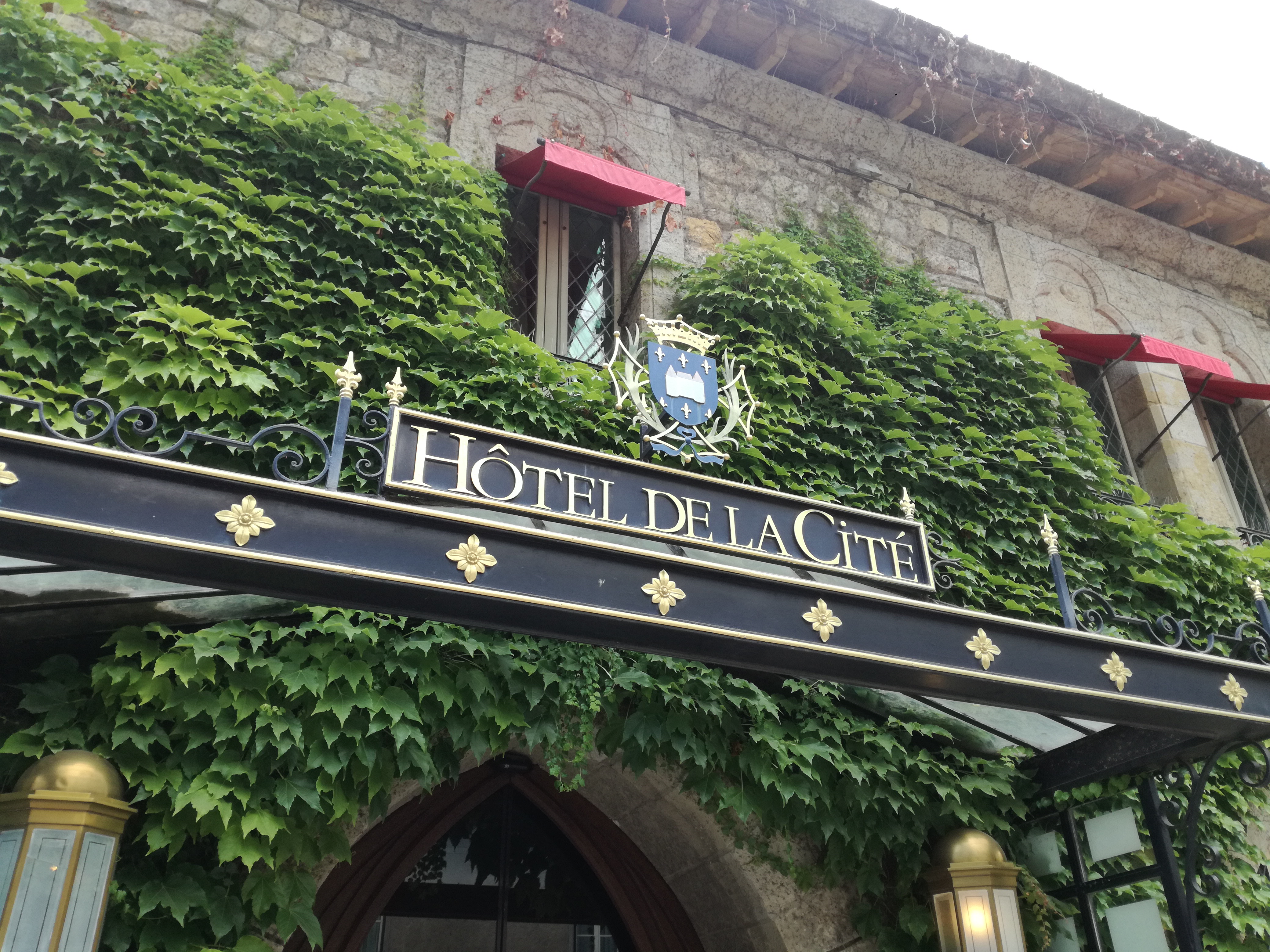 La cité médiévale en plein mois d’août c’est un peu le métro à l’heure de pointe les marchands du temple et de boissons couleur fluo. Heureusement il existe un îlot de luxe, de calme et de volupté ( spa ) avec l’Hôtel de la Cité. Nous avons pris le déjeuner en terrasse au restaurant la Barbacane. Sous les arbres centenaires avec une vue imprenable sur les remparts et la ville, un menu fixe savoureux et copieux ( amuse bouche, entrée, plat, fromage, dessert, café, mignardises et 2 verres de vin ) à un prix hallucinant pour moi qui vient de Paris ( 41 Euros ). Le maître d’hôtel, le sommelier, les serveurs sont tous très largement à la hauteur du lieu pour faire de ce repas à un moment mémorable