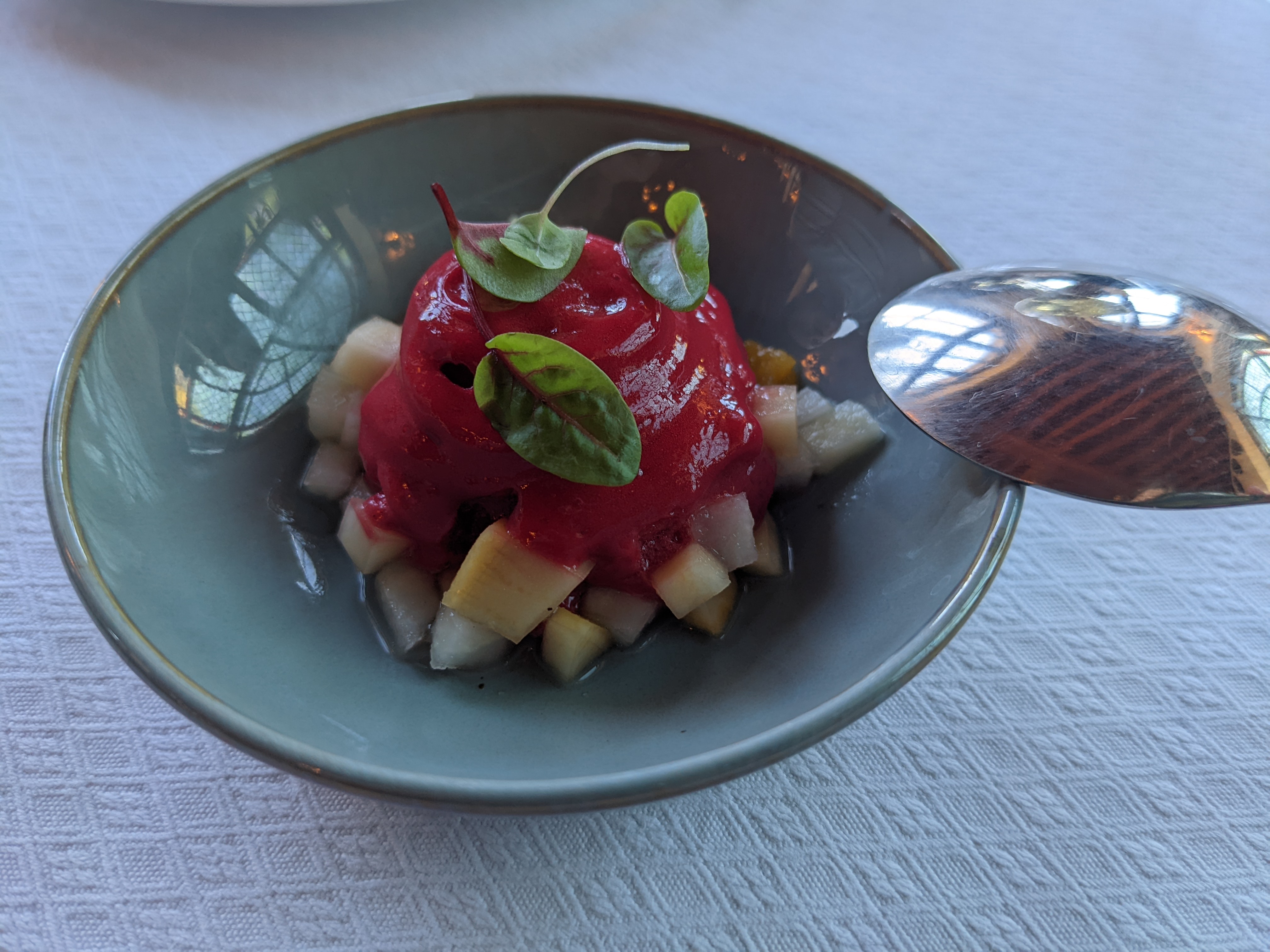 Nous avons déjeuné il y a 3 semaines chez Georges Blanc à Vonnas 3* Michelin. Et ben ici pour un 1* Bravo !!! Tout était parfait le menu midi en semaine à 49€ avec 2 verres de vin ,eau minérale et café, c'est du rapport/qualité/ exceptionnel !!! Je recommande ! Et le personnel top de chez top , mention spéciale au sommelier...👌