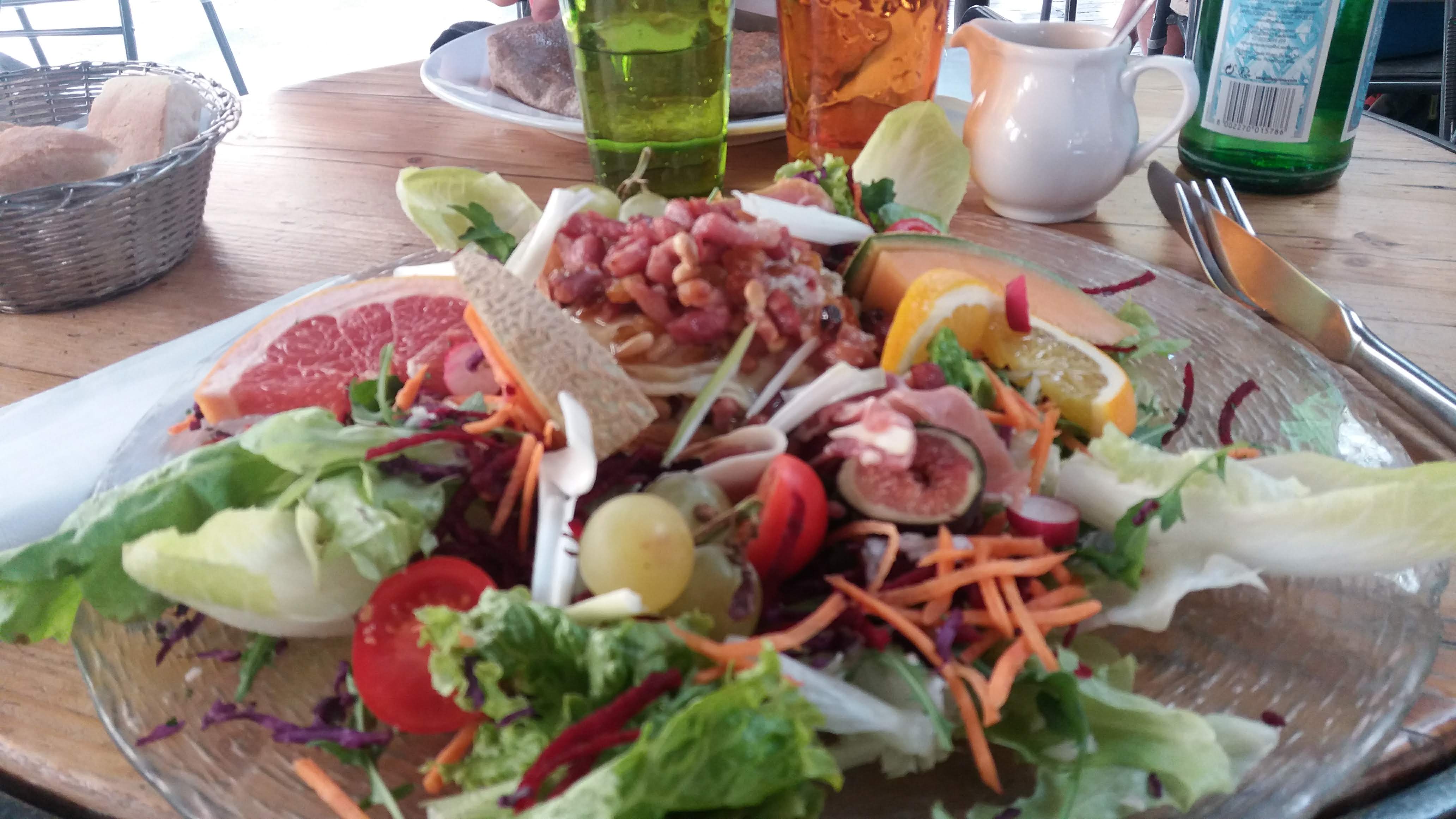 Nous avons mangé une tarte aux poivrons thon emmenthal extra accompagnée d'une salade très complète agrémentée d' agrumes et groseilles, le tout pour 14 euros!