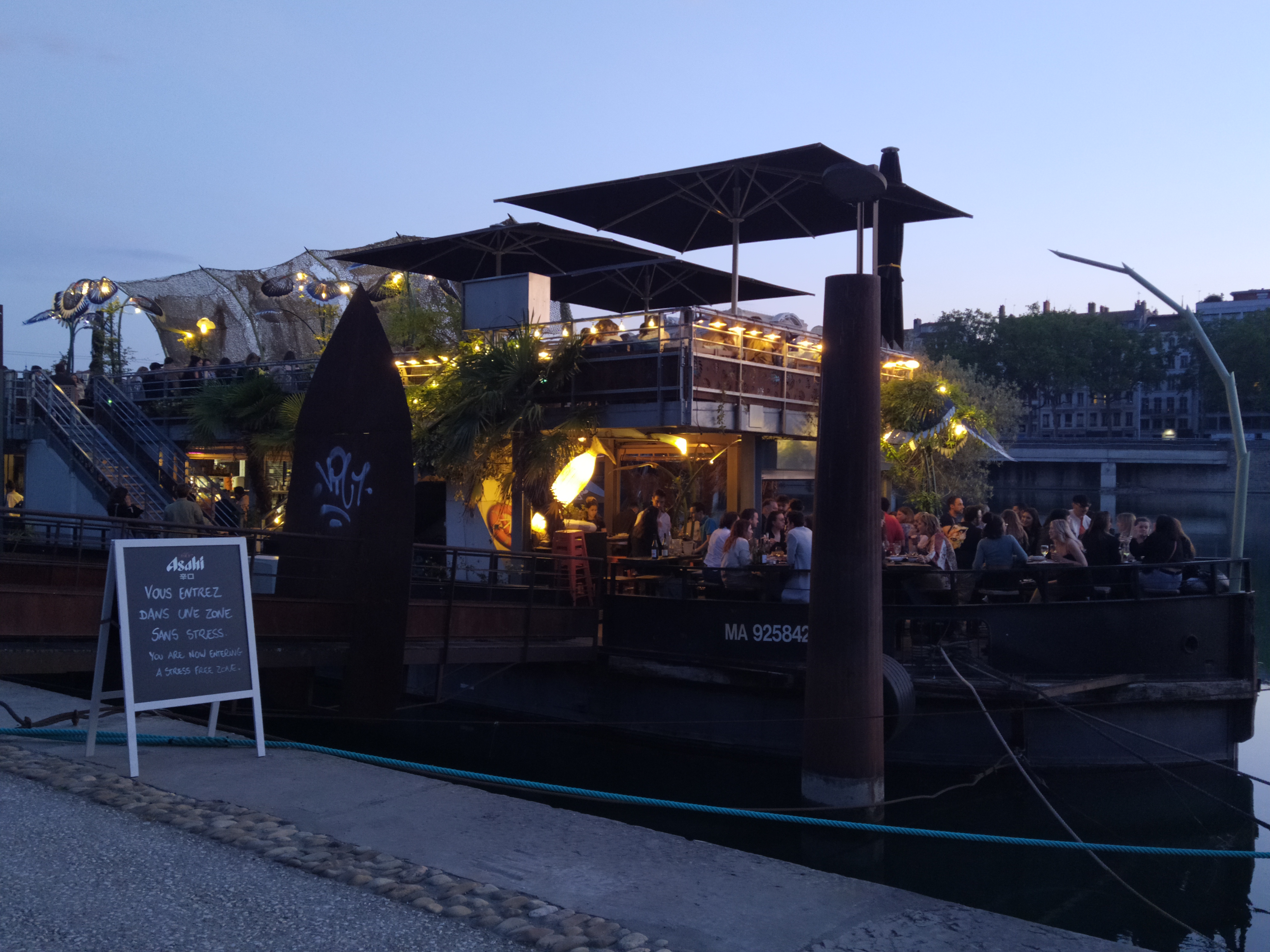 Cher (comme partout sur les bateaux à quais). Mais très sympa, il faut prévoir arriver tôt pour avoir de la place. Belle vue, un de mes coin préféré pour boire à Lyon