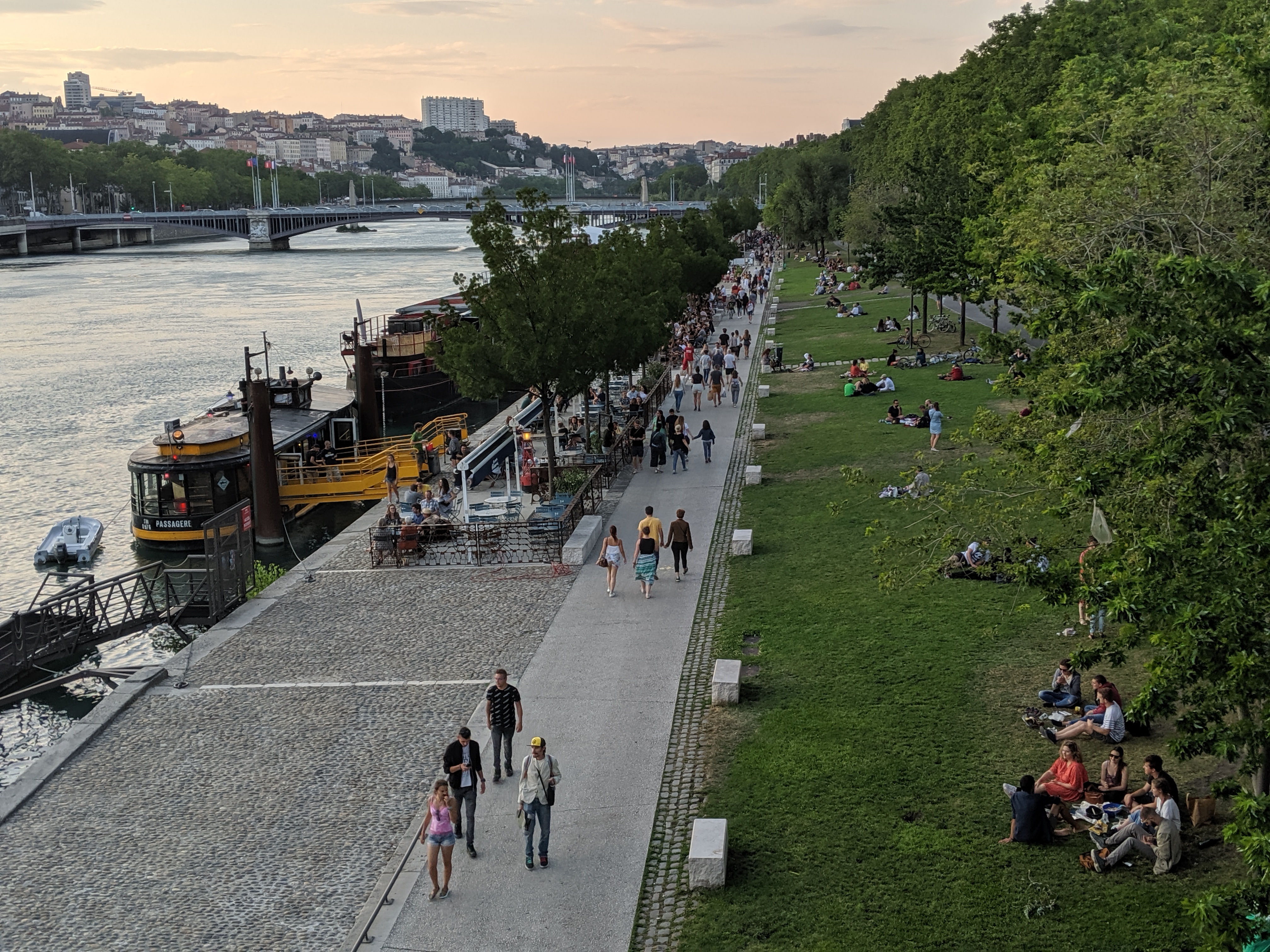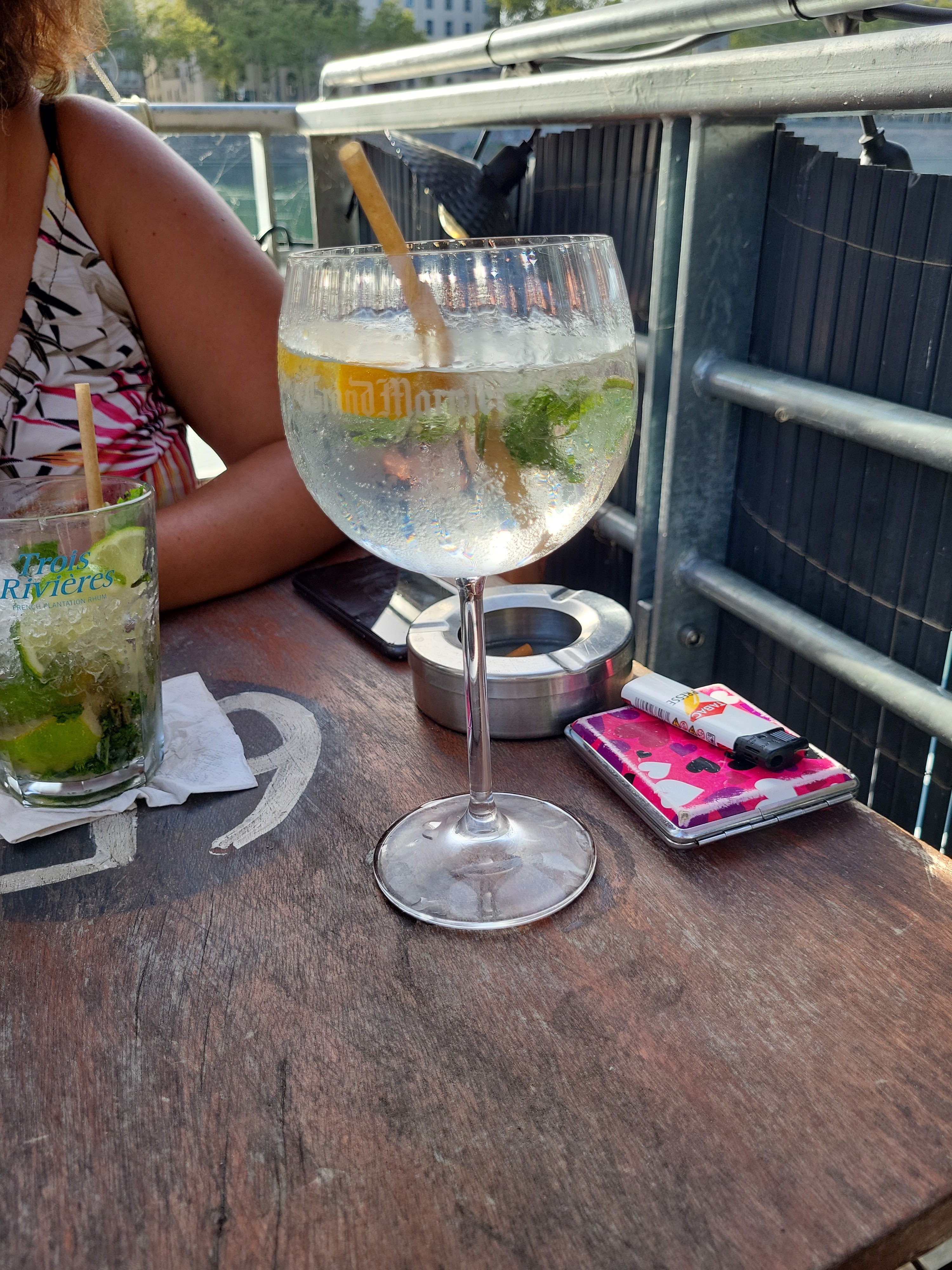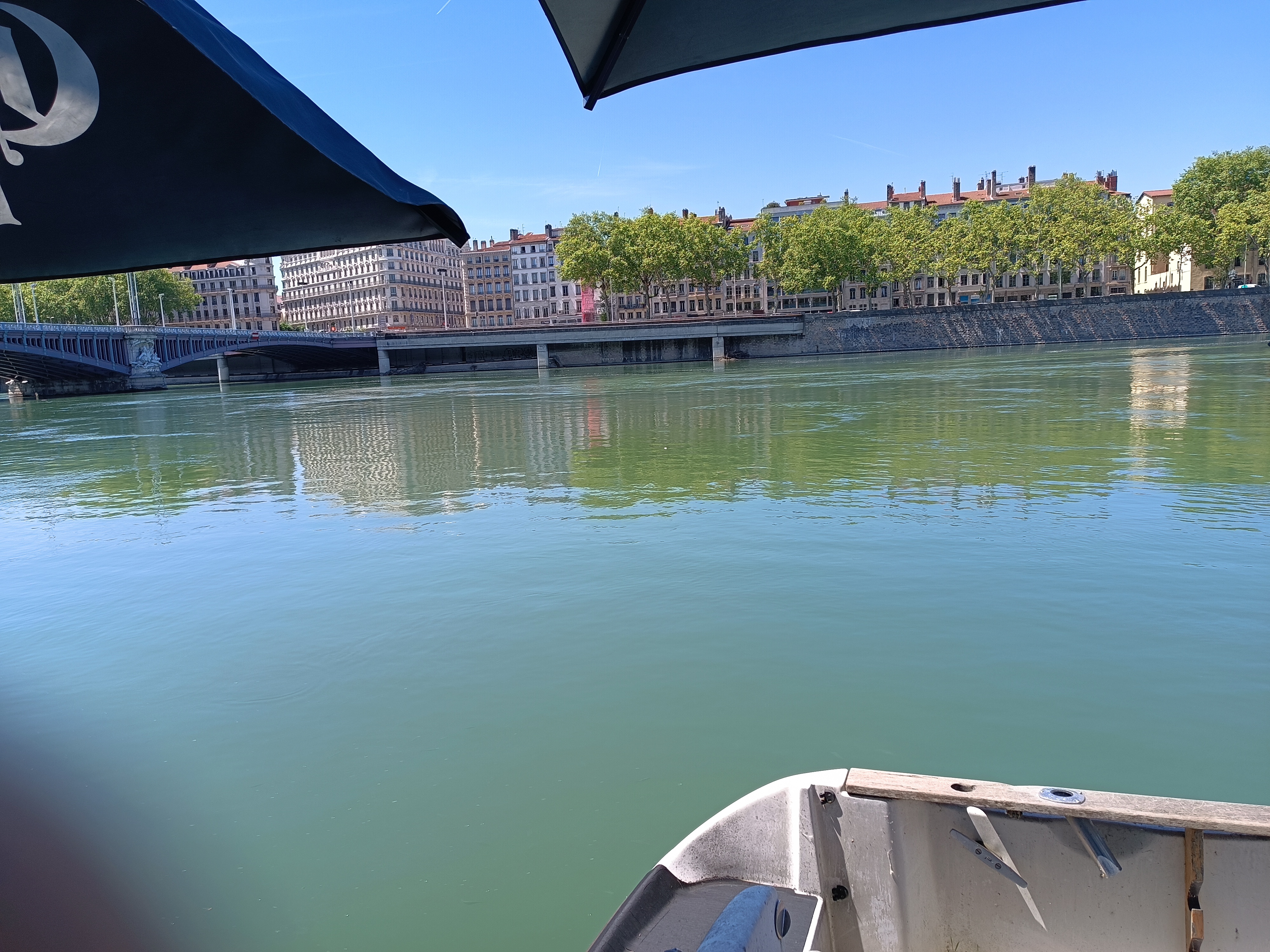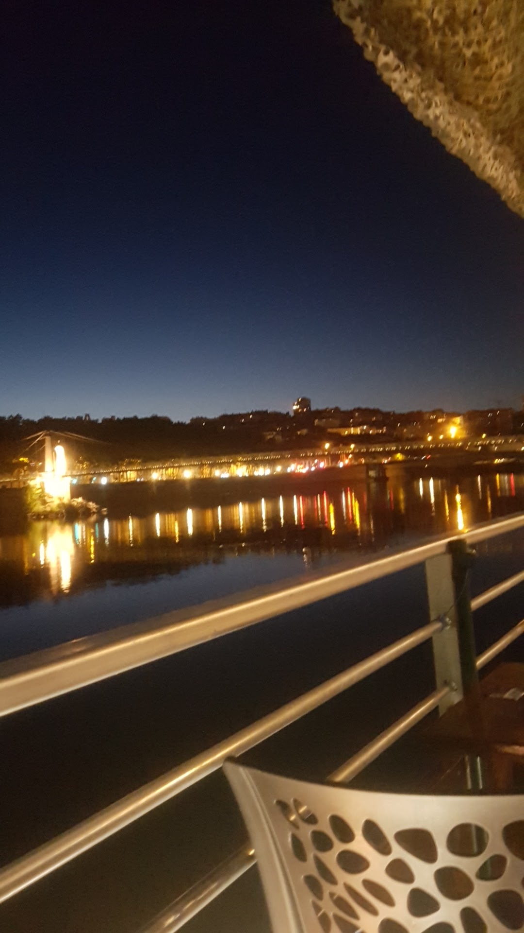 Un verre face au soleil de fin de journée qui se reflète dans le Rhône. La musique live et les chants brésiliens, Joyeux. De la bonne humeur pour le palais, les yeux et les oreilles