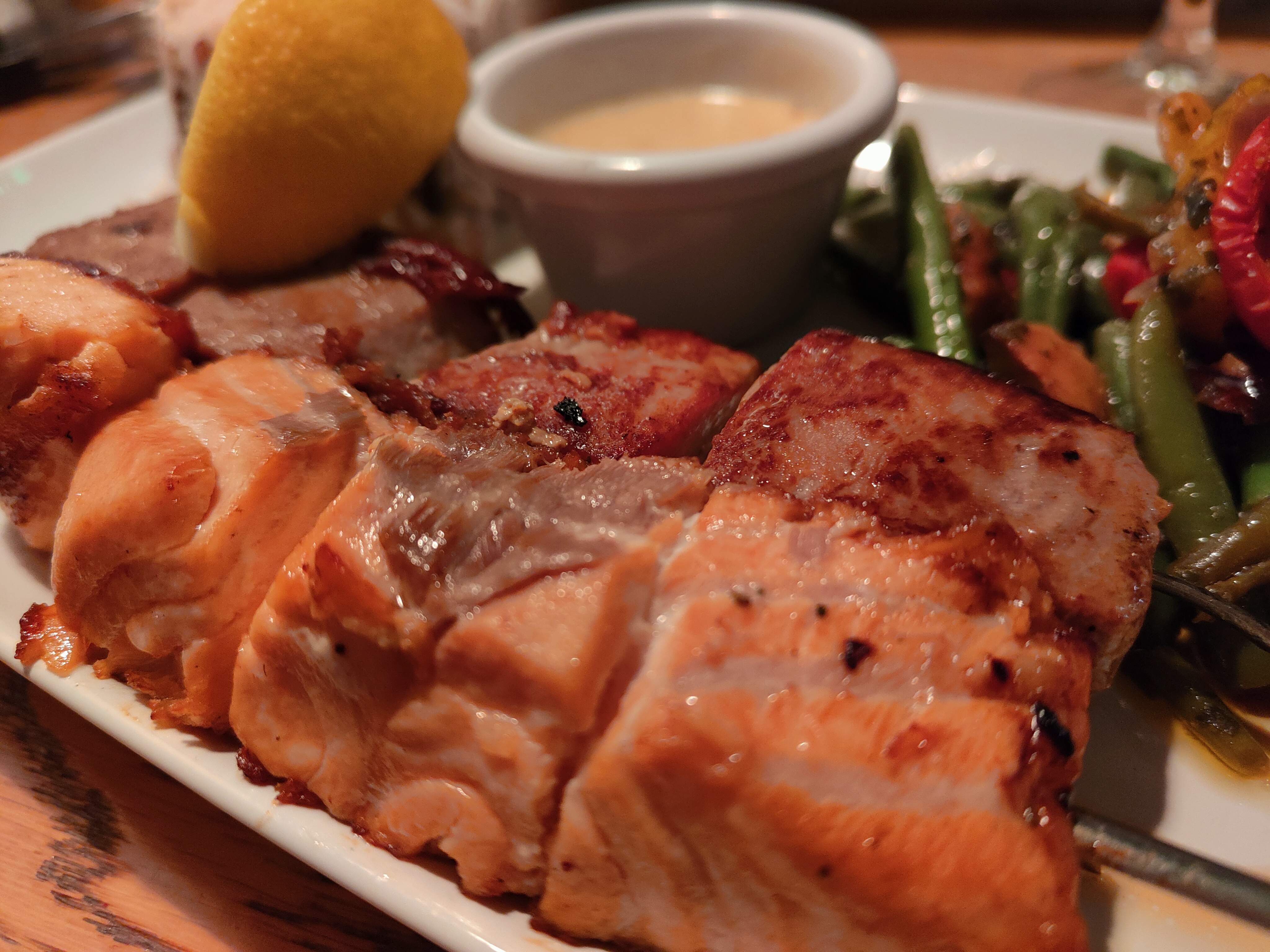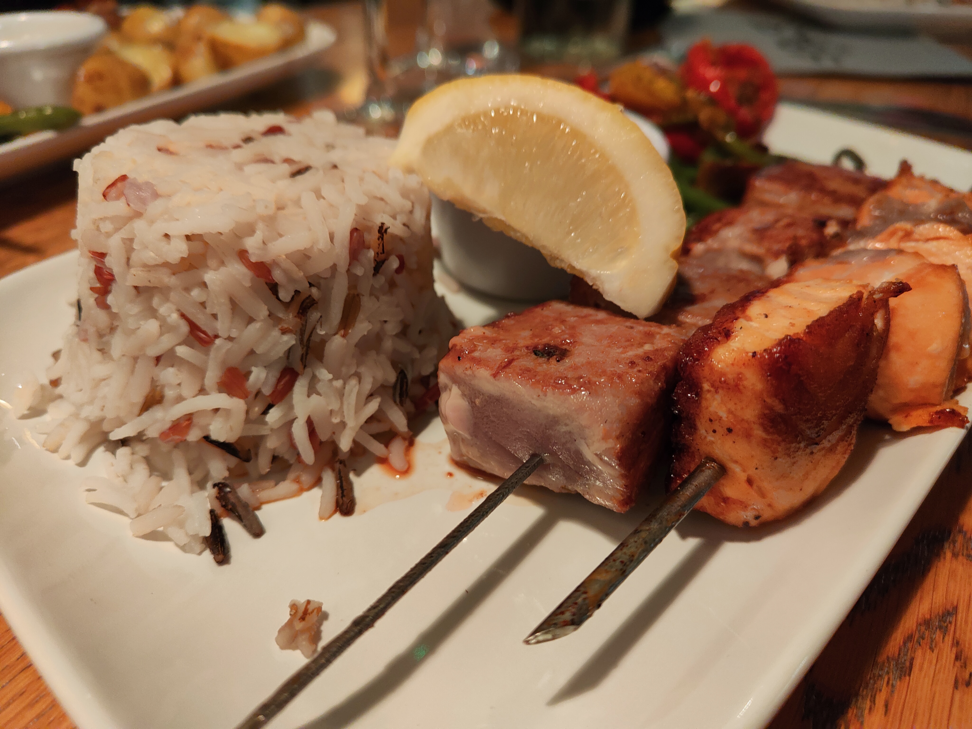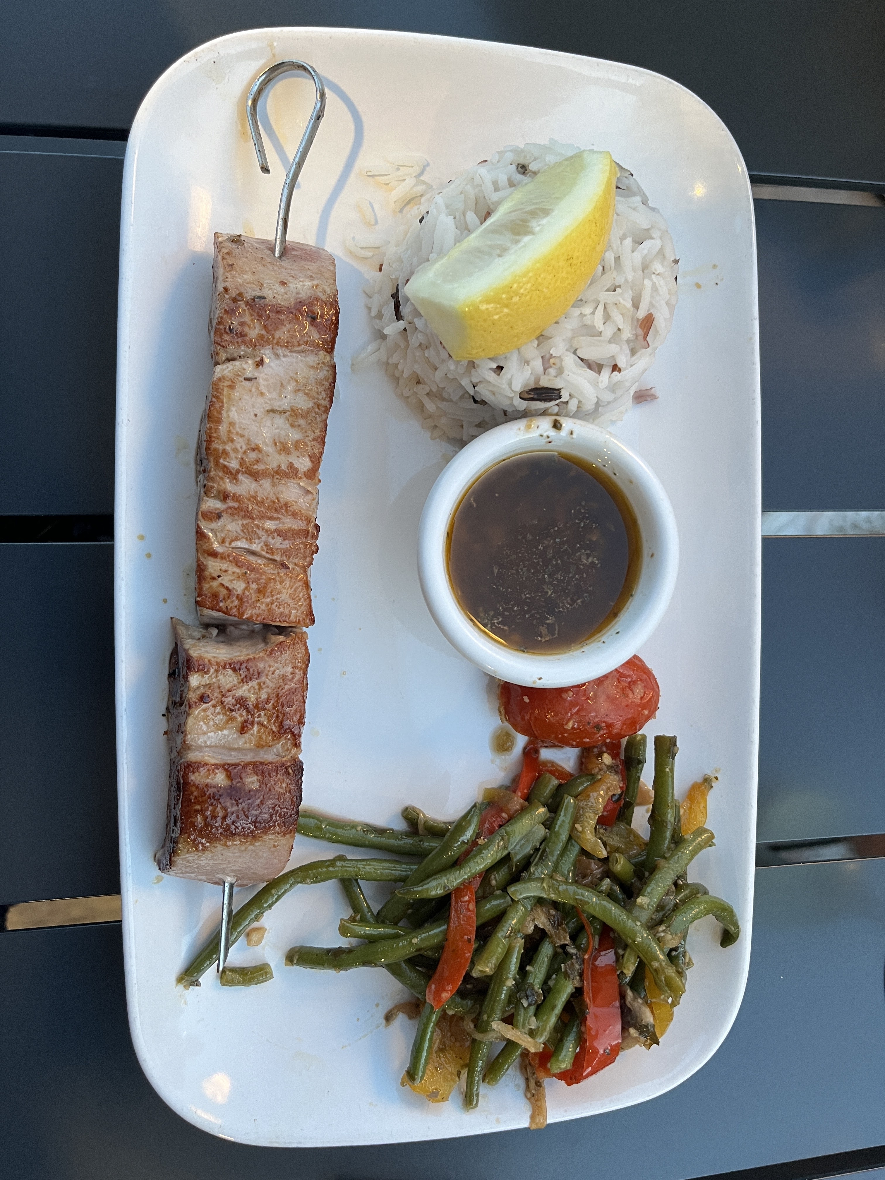 Un vrai délice! J'ai mangé une brochette de saumon et une de magret et c'était un régale! La cuisson était parfaite pour les 2 😍 Et en dessert le brownie était moelleux... à tomber! Merci pour ce délicieux repas! Je recommande vivement!
