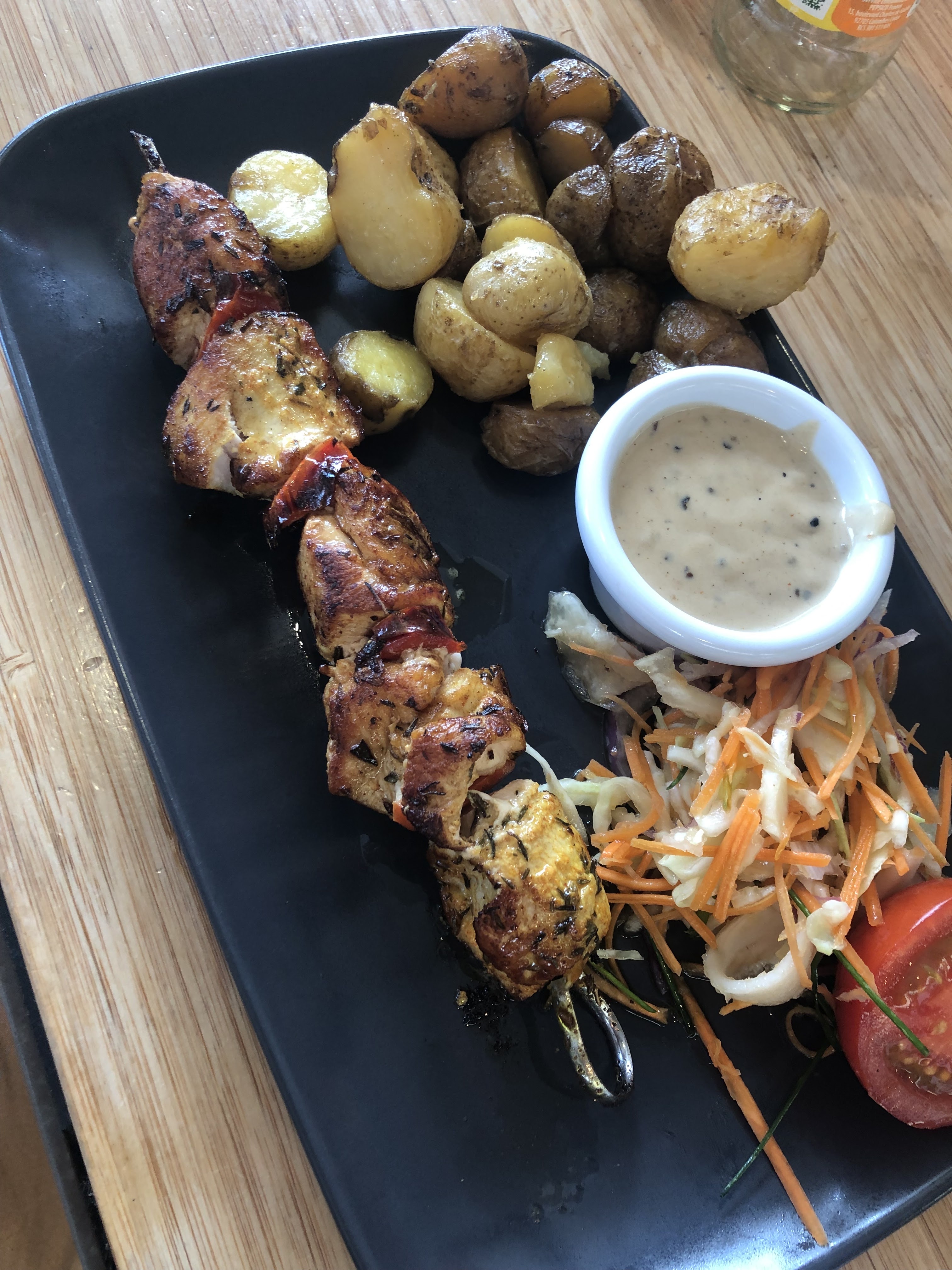 Trois bouts de viande desséchée accompagnées de quelques patates (avec peau) cuites des heures plus tôt .. bravo. Même pas un morceau de poivron ou autre pour égayer la brochette .. c'est n'importe quoi. Une pure arnaque. Table salle, menu collant, la grande classe.