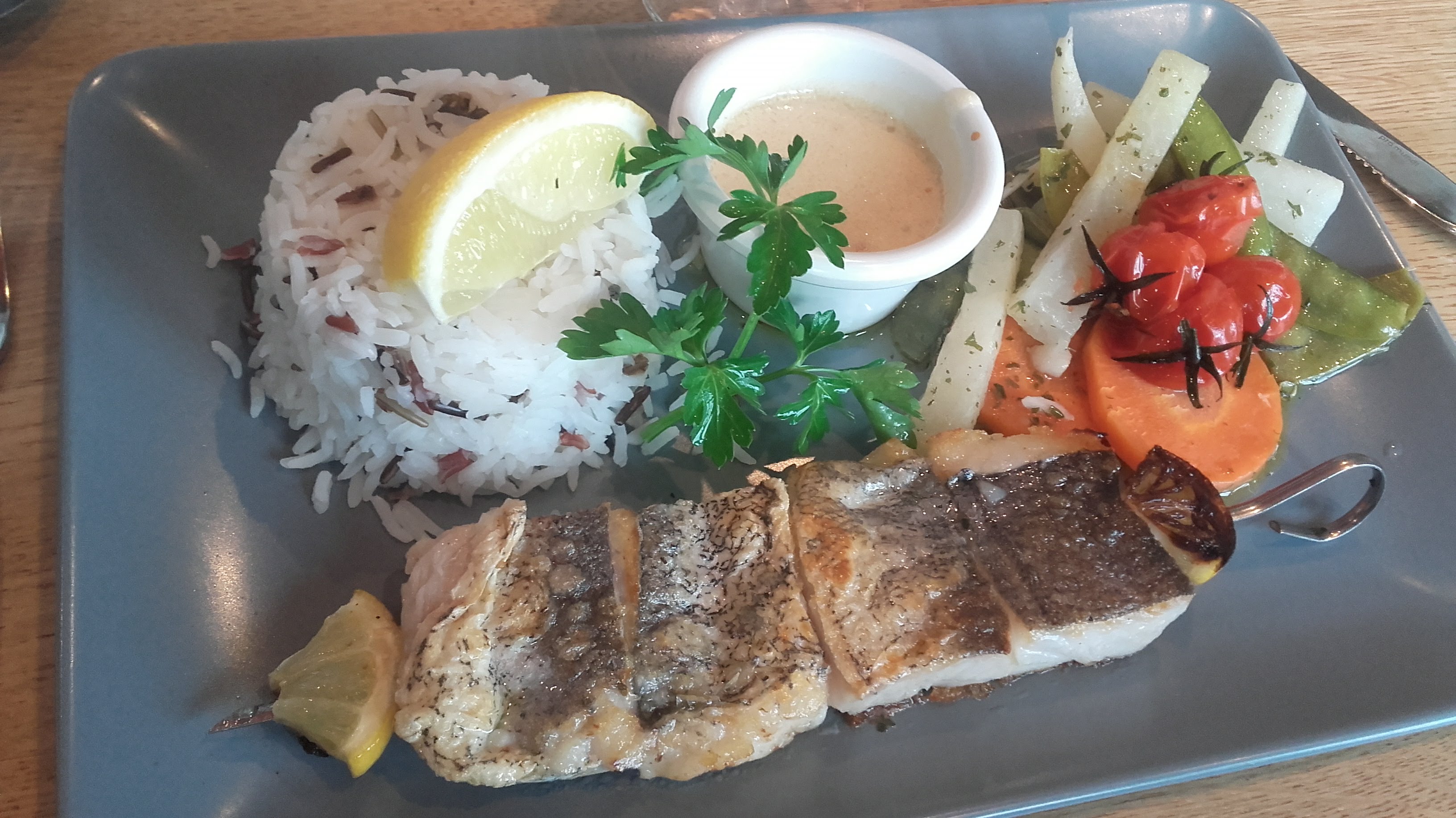 Plat décevant et trop cher pour la qualité de la cuisine. Les légumes se sont transformés en salade non asaisonnée. Nous avons pris les assortiments de brochettes saumon et noix de Saint Jacques. Qualité très moyenne. L'attente était très longue et nous sommes partis avant le dessert. Plus de 100€ pour un plat et une bouteille