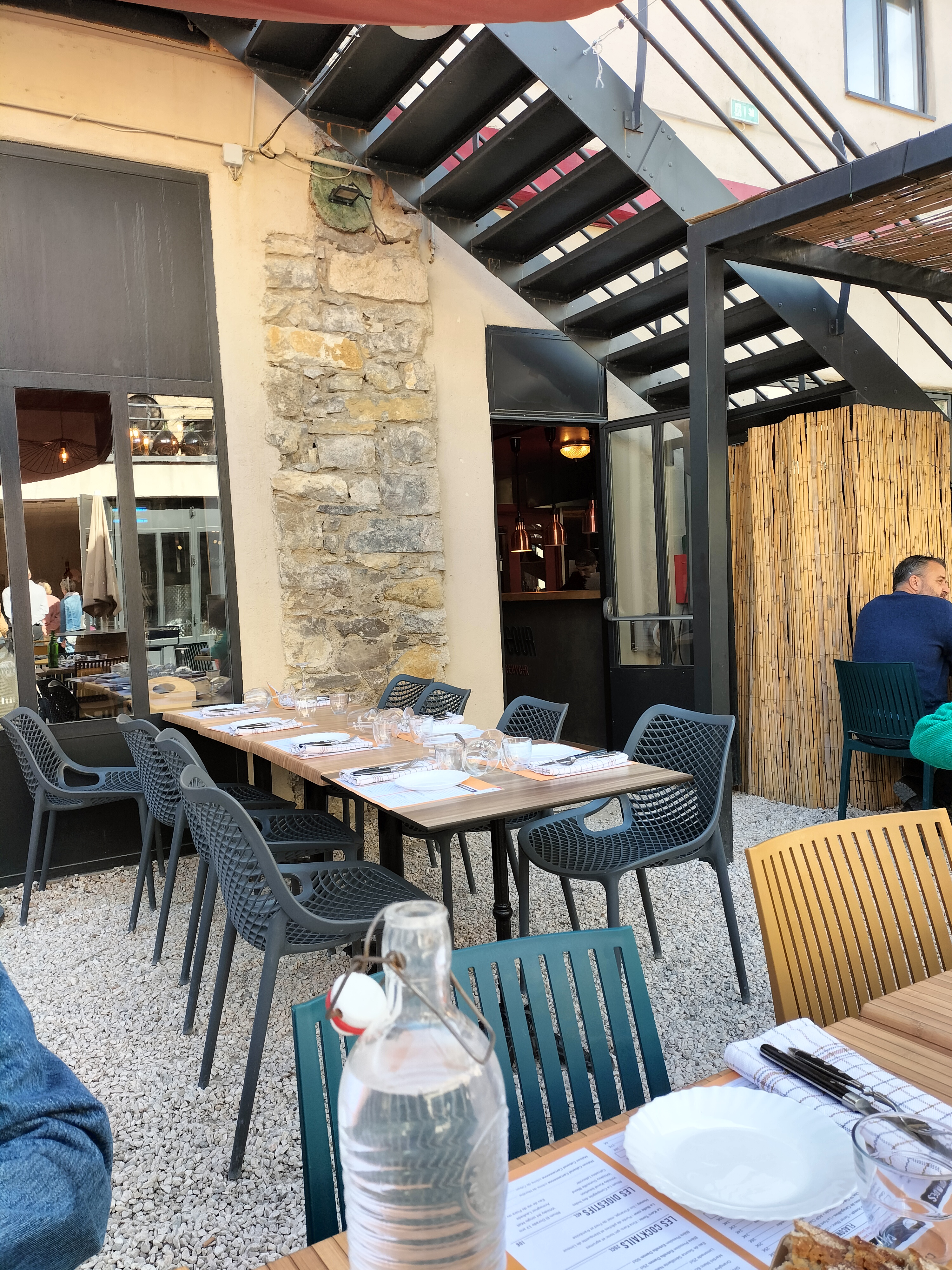 un bon petit moment en famille !!! restaurant qui partage la court intérieur de la vinaigrerie de Cyril Codina, déco atypique , une petite carte 3 entrées , 3 plats et 3 desserts qui annonce en principe des produits frais et de qualités , belle cuisine ouverte qui donne sur la salle avec un service rapide par des personnes très gentille et patientes au service de leurs clients !!! entrée + plat pour 24€ un vrai plaisir pour les yeux et les papilles plutôt rare dans le sud de la France . Je recommande vivement à ceux qui visite ce beau village !