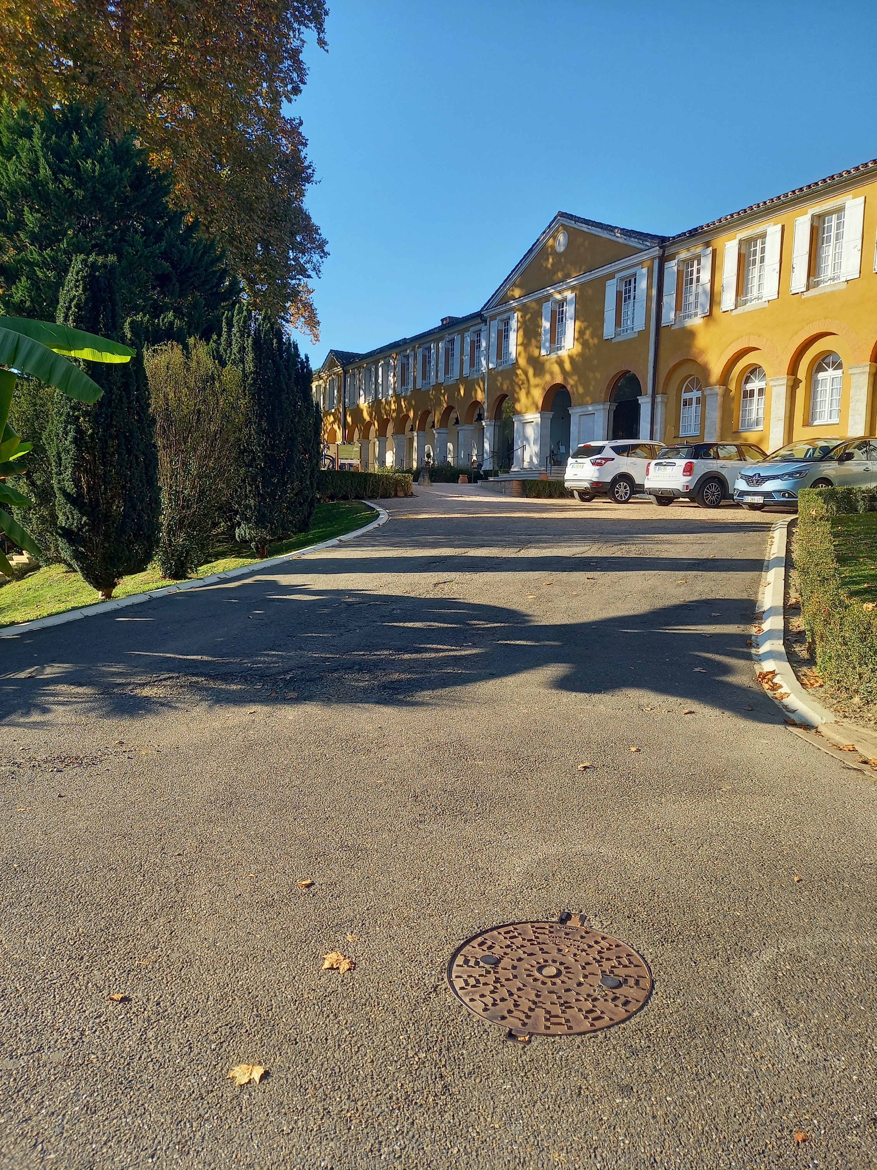 Vue de l'hôtel la Bastide à Barbotan les thermes. Fermé pour cause de pandémie. Mais superbe de l'extérieur et cette vue sur l'entrée de la ville. Ça donne envie !
