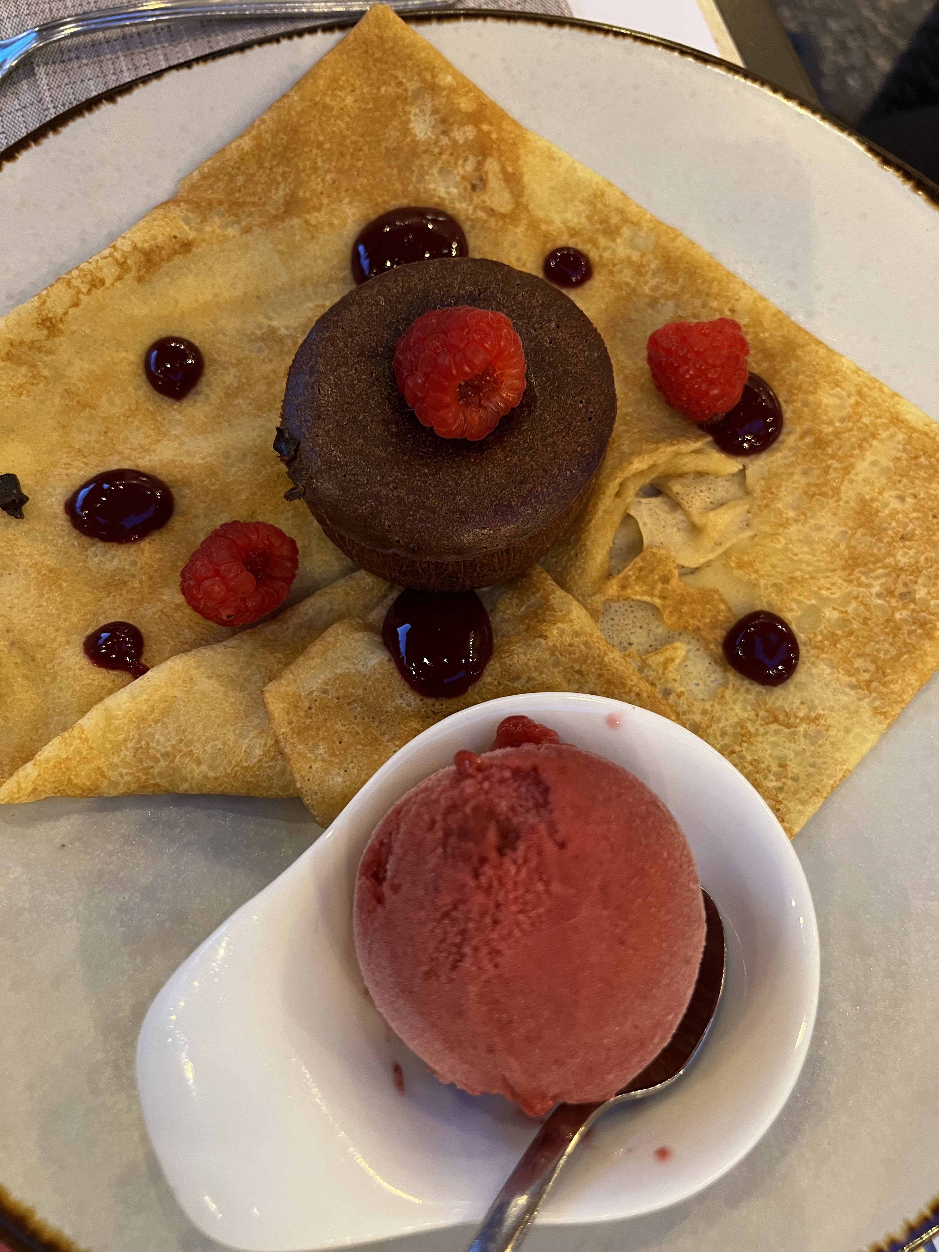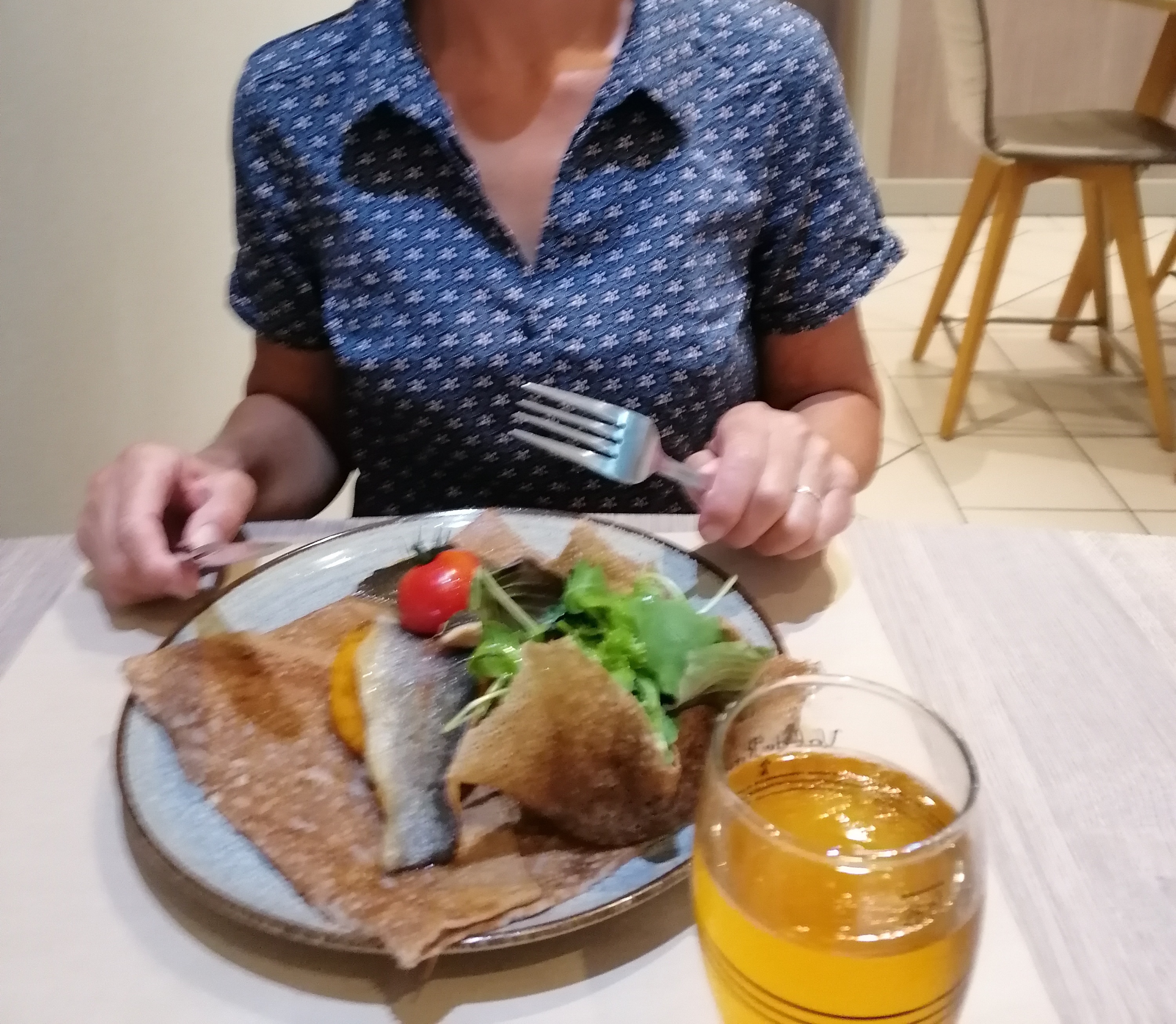 Déjeuner ce dimanche, accueil agréable et attentionné du personnel et propriétaire. Salle lumineuse et tables espacées. Assiette du turbo sauce vanille gustative. Salade de gésiers œuf poché etc... un peu trop de salade et plus de garniture. Pavé de boeuf cuit à ma convenance, quelque peu déçu des frites maison absentes et remplacées. La propriétaire nous a expliqué le pourquoi. Desserts de crêpes excellents. La prochaine fois nous goûterons les galettes. Au plaisir.