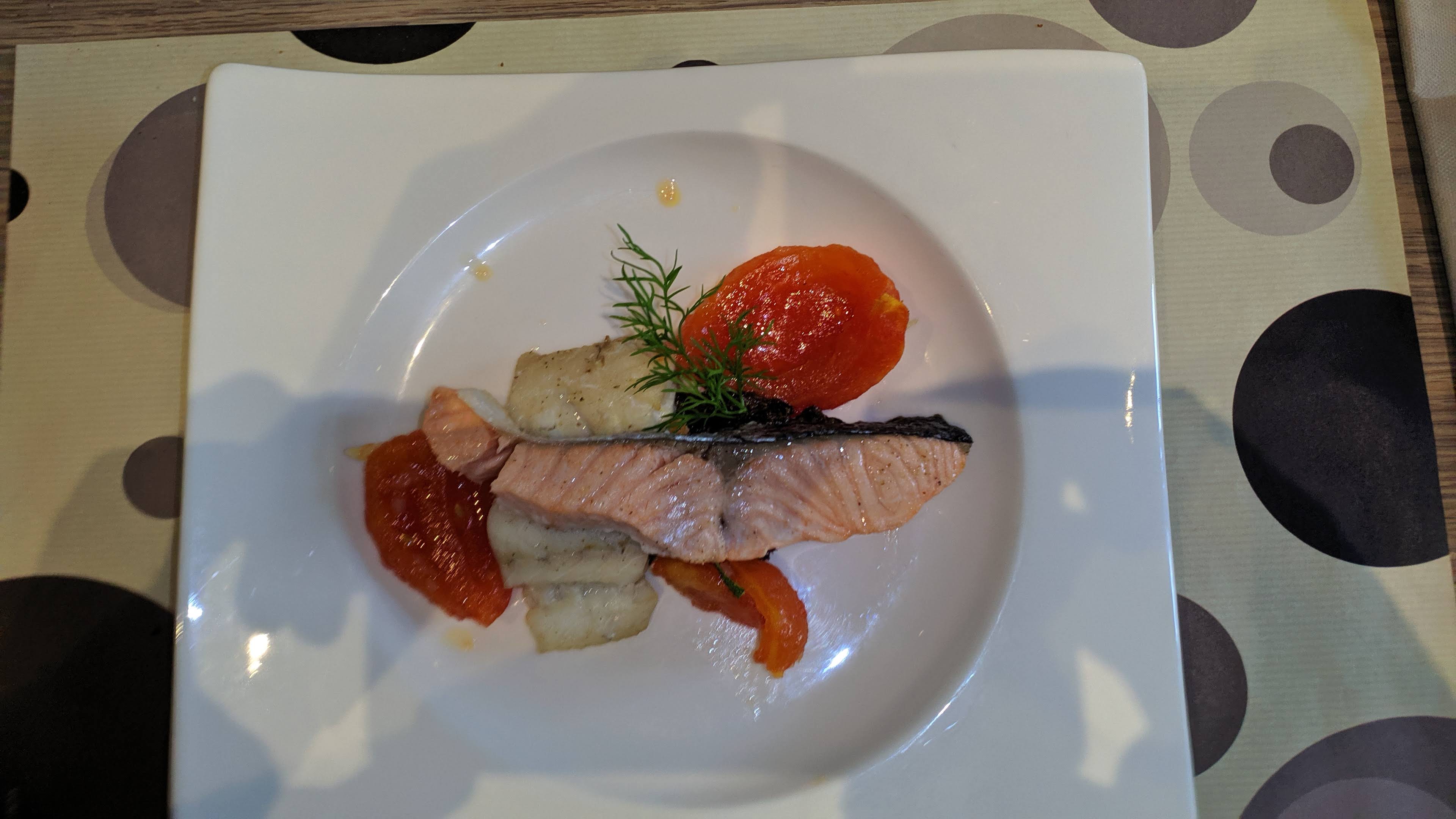 Comme il faisait beau, nous avons mangé en terrasse. Elle est ombragée et très agréable. Le menu du jour était adapté à la saison et toujours très bon