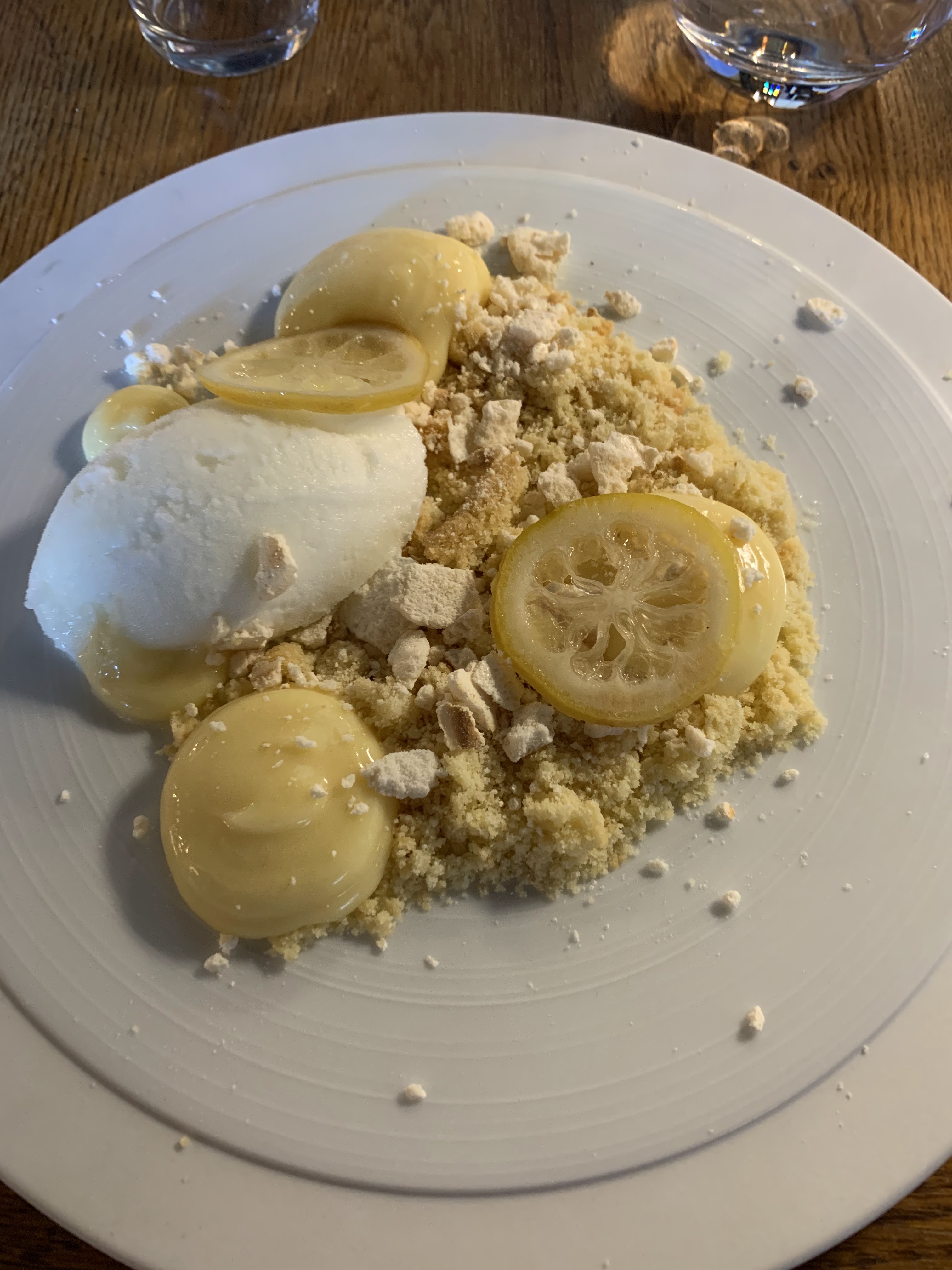 Plat : bien goûteux Dessert : tarte au citron déstructurée 😱😱le gâteau est écrasé grossièrement dans l’assiette Bon mais pas appétissant. Faut changer de pâtissier. Prix élevés au final pour une prestation moyenne.