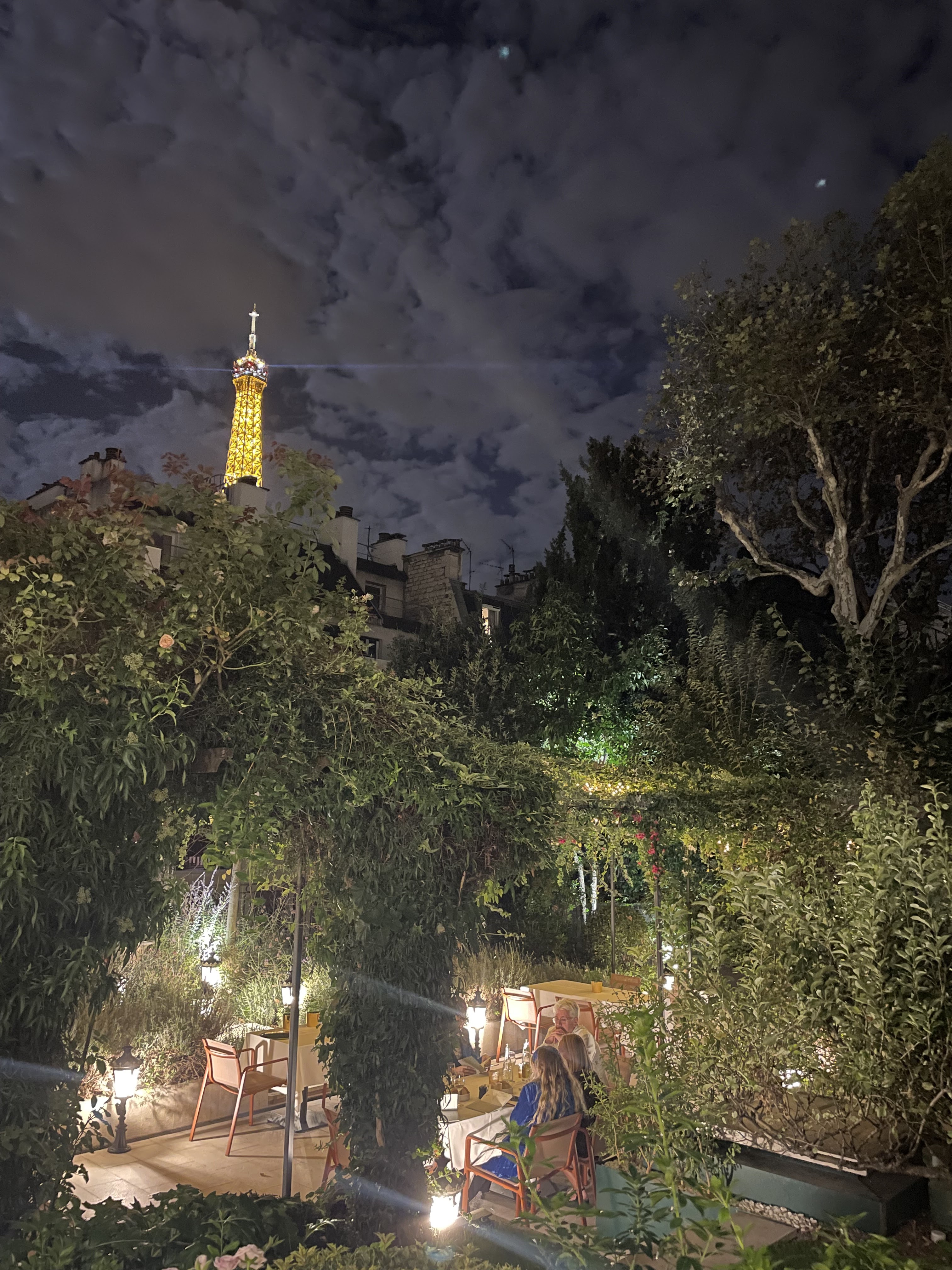 Pendant l'été, il est possible d'accéder aux tables extérieures disposées le long d'un magnifique jardin avec vue sur la Tour Eiffel. Les plats sont délicieux, le service est impeccable et aux petits soins pour les clients. Nous avons passé un très bon moment, je recommande chaleureusement ce cocon d'exception.
