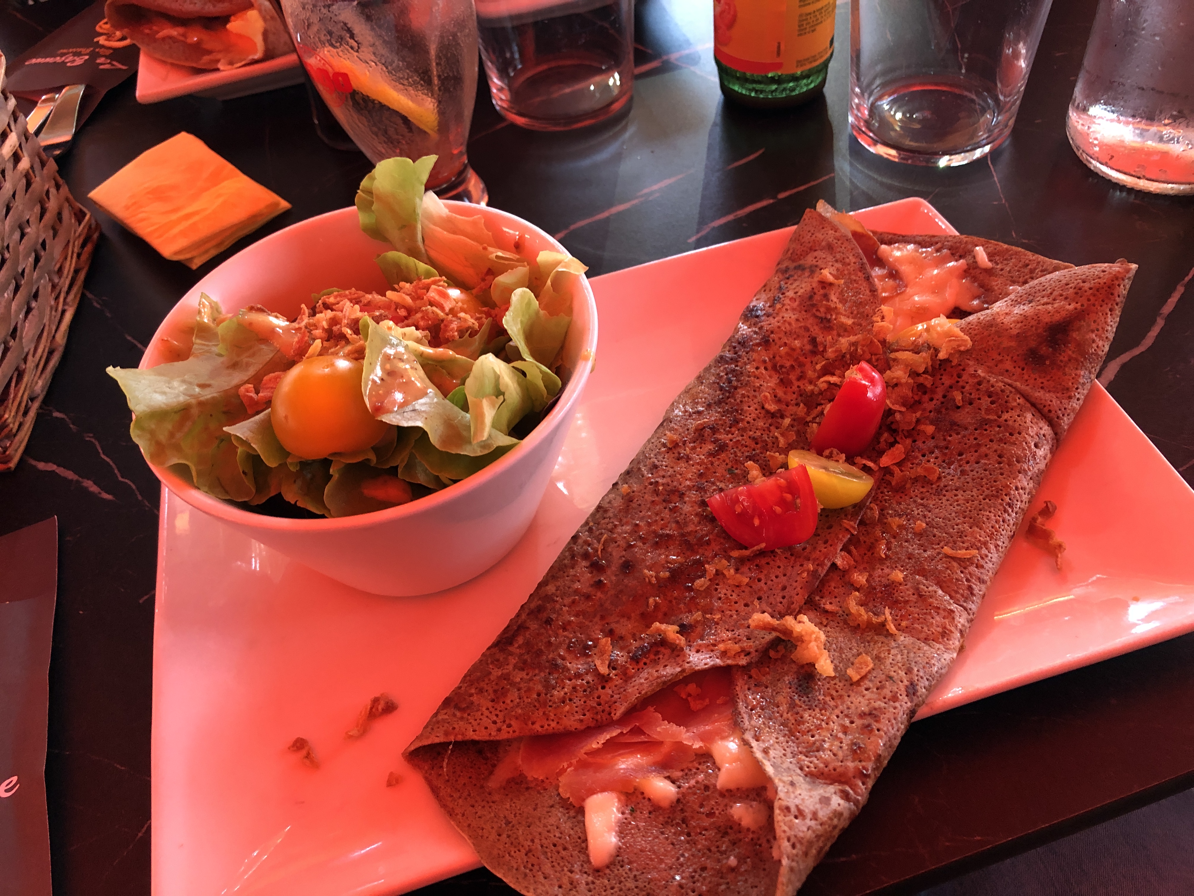 Galette arrivée froide et ramenée apres un second passage dans la poêle donc oeuf presque dur coca renversé par la serveuse et non remplacé crepe qui devait etre au beurre doux est en fait une crepe beurre salé le bien etre des clients ne semble pas être au coeur xe leur preoccuption