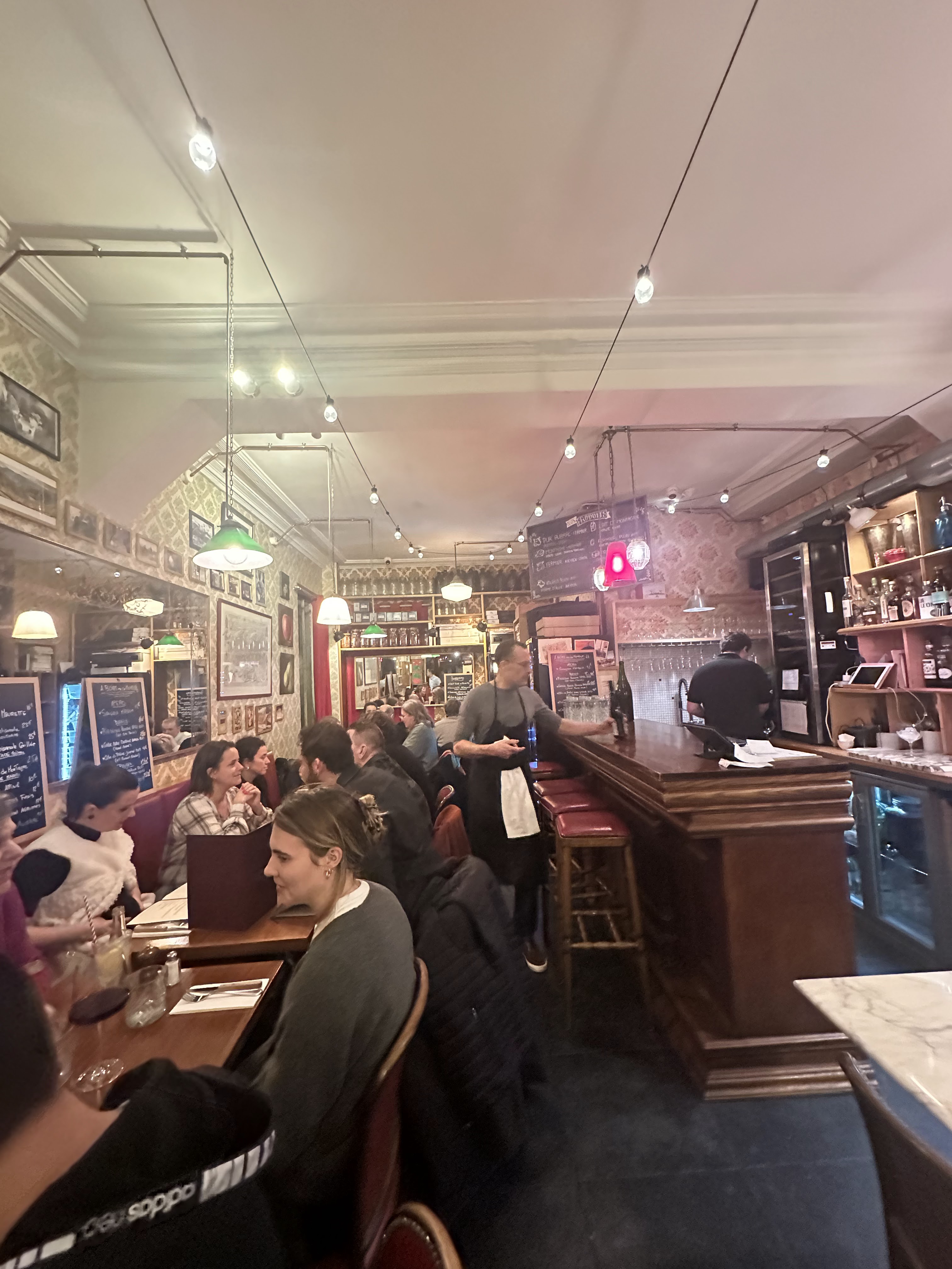 C'était le dernier jour de Paris, nous avons décidé d'aller à La Belécane à Gaston où nous avions essayé d'aller la veille mais n'avions pas pu car nous avions besoin de réserver. Nous avons commencé avec une incroyable bruscheta accompagnée d'un vin rouge fruité suggéré par le serveur. Pour le plat principal, nous avons opté pour le poulet qui était spécial ce jour-là et le porc avec un autre type de vin rouge, cette fois un peu plus fort. Pour terminer cette expérience nous avons partagé un délicieux tiramisu. La nourriture et le vin sont incroyables et les serveurs sont super sympas. J'ai hâte de revenir à Paris et de réessayer !