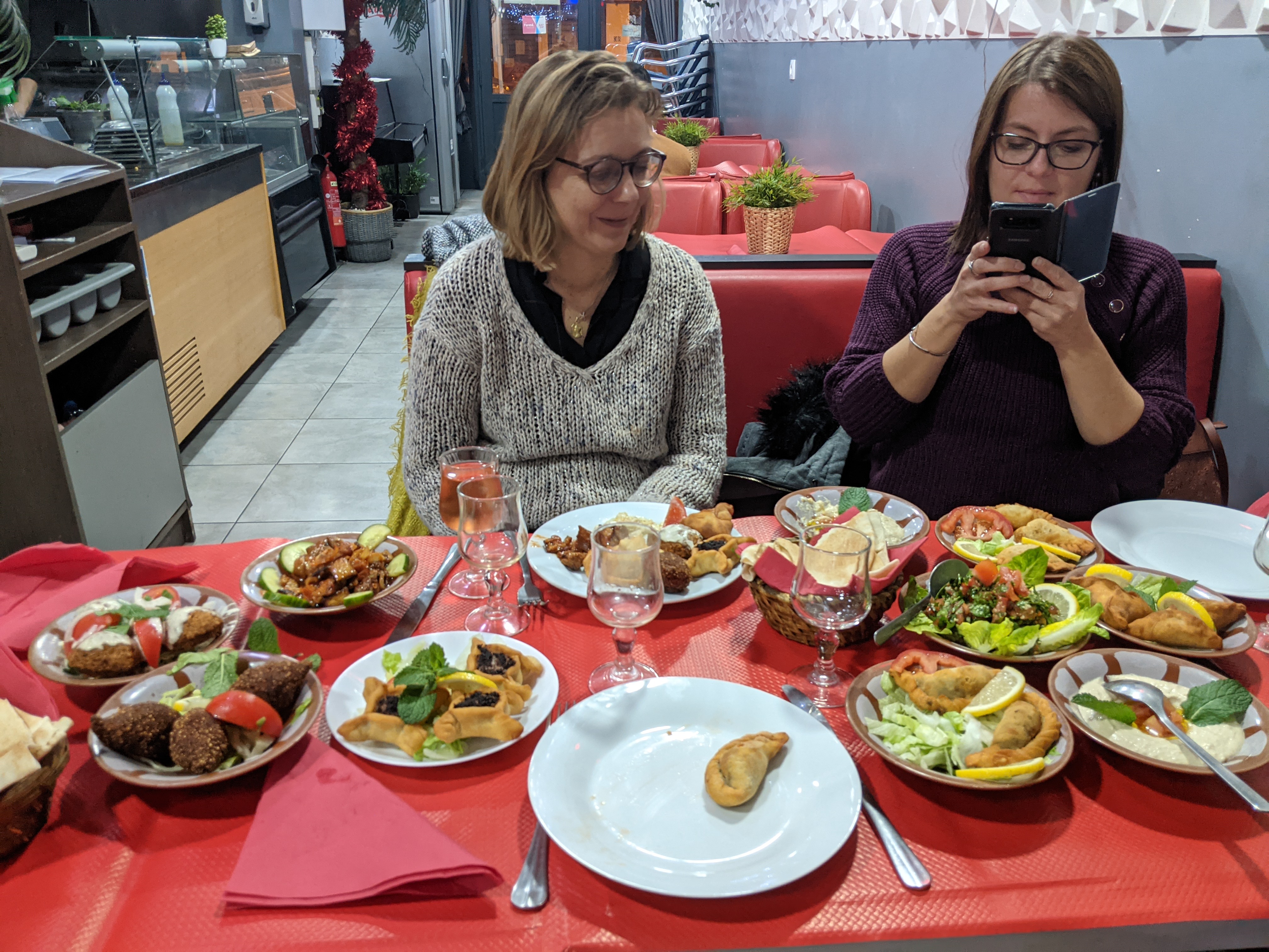Accueillies comme des reines! Sympathique et d'une gentillesse incroyable. La nourriture est faite maison, produits frais, tout est excellent, houmous, caviar d' aubergine, falafels, mezzés... Et le thé exquis et pâtisseries toutes en delicatesse qui viennent finir ce repas copieux.... Endroit calme, très propre et personnel au petit soin, ayant à coeur de nous faire découvrir la gastronomie libanaise. Proportion généreuse et prix plus que correct. Une adresse que je garde précieusement et dont on m'y verra souvent. Un vrai plaisir d'y être allée !