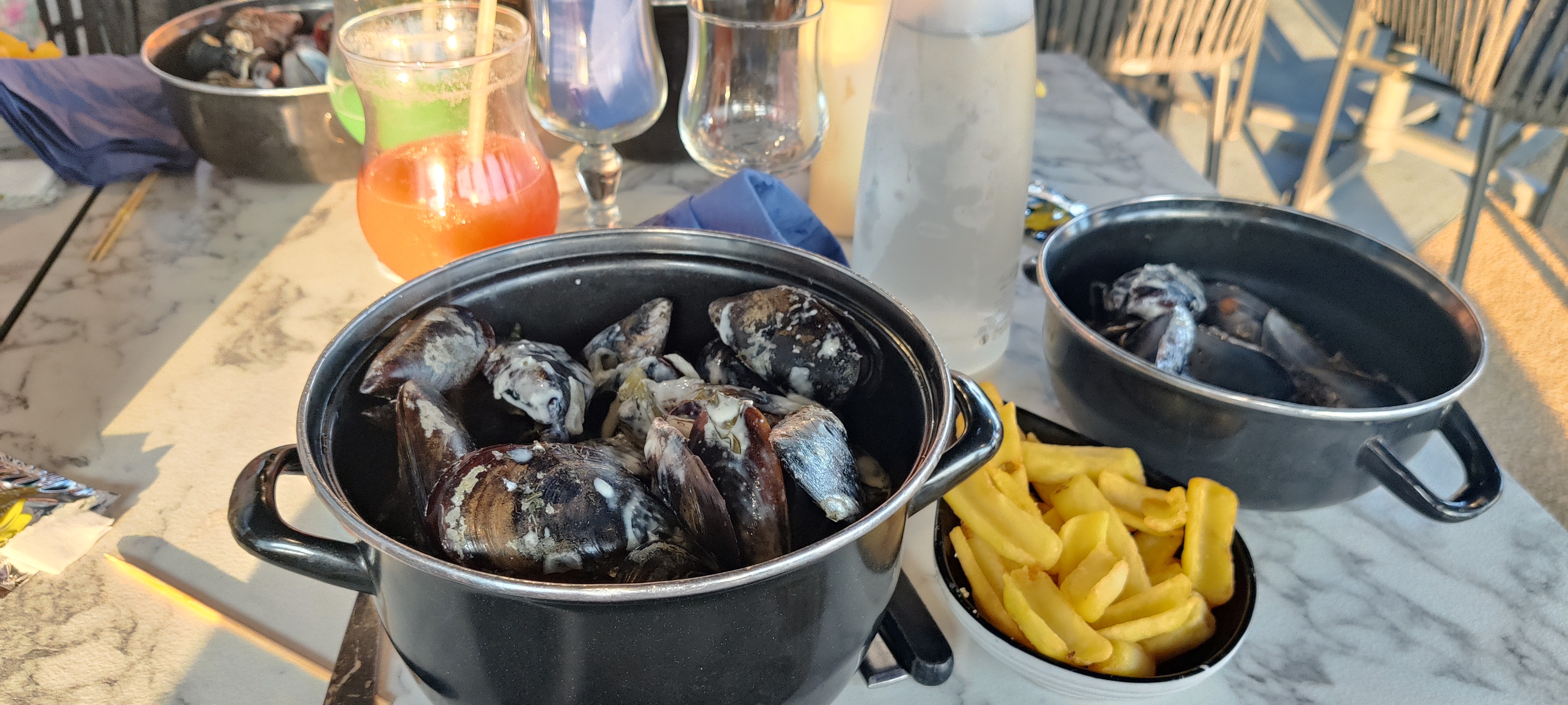 Nous avons pris des moules frites... Une catastrophe. Mon ami, à pris à la crème, des caillots , de l'eau mais pas de sauce proprement dite. Et pour moi c'était au curry, avec 5cm d'eau jaune au fond de la casserole. Les moules pas mauvaises en soi mais les 3/4 écrasées et des morceaux de coquilles absolument partout.... Quant aux frites, une minuscule portion....Point positif, le vin n'était pas mauvais.