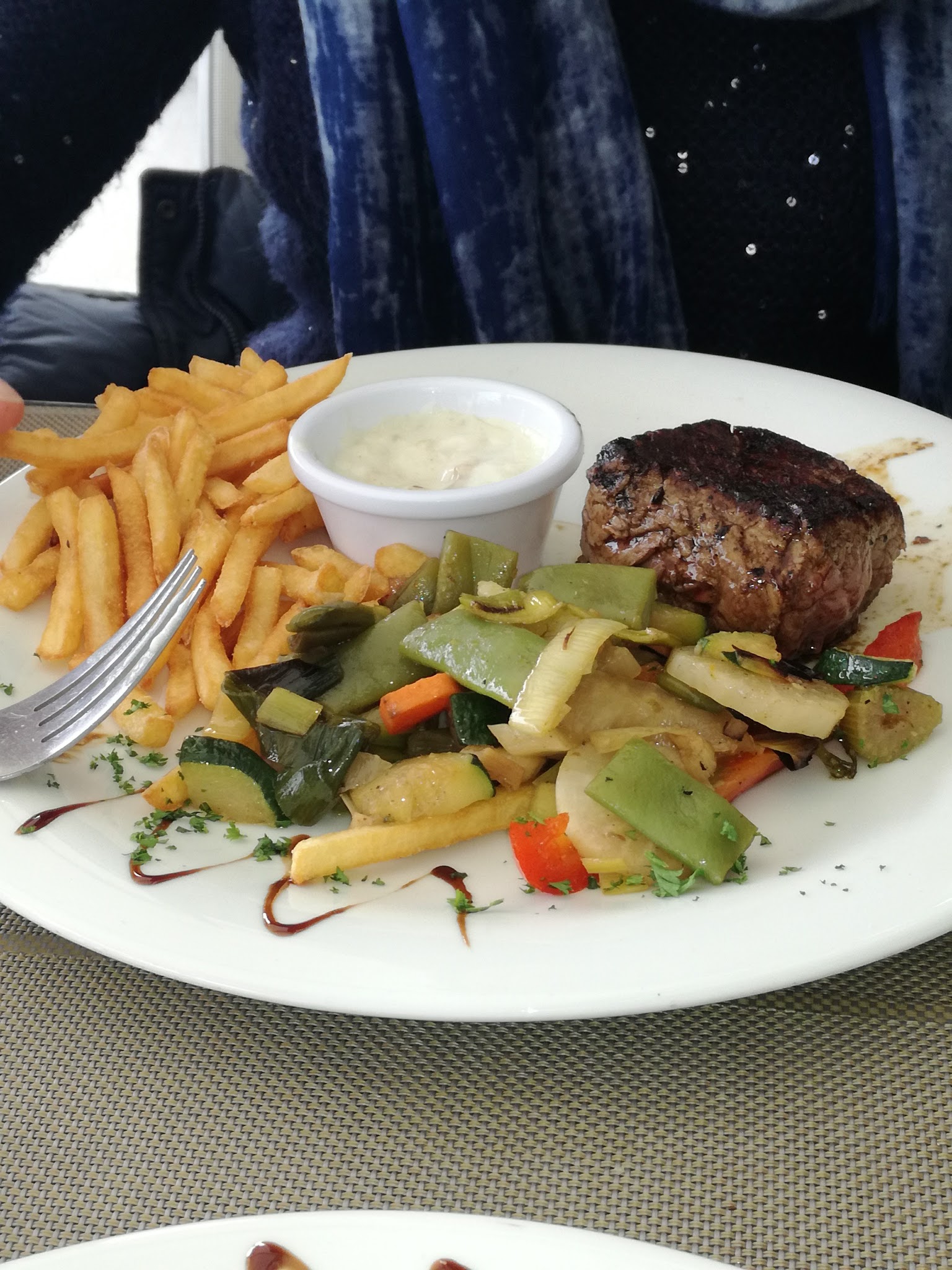 Le prix est correct, les serveurs sont aimables. J'ai pris un menu du midi avec mes amis, la pièce du boucher comme eux seulement ma pièce de viande était plus petite et très nerveuse contrairement à la leurs, les légumes était très bien préparé, la sauce fournit était fade, quant au dessert le biscuit était bon, et la glace bonne mais manque une petite décorations. Un très bon emplacement avec une belle vue