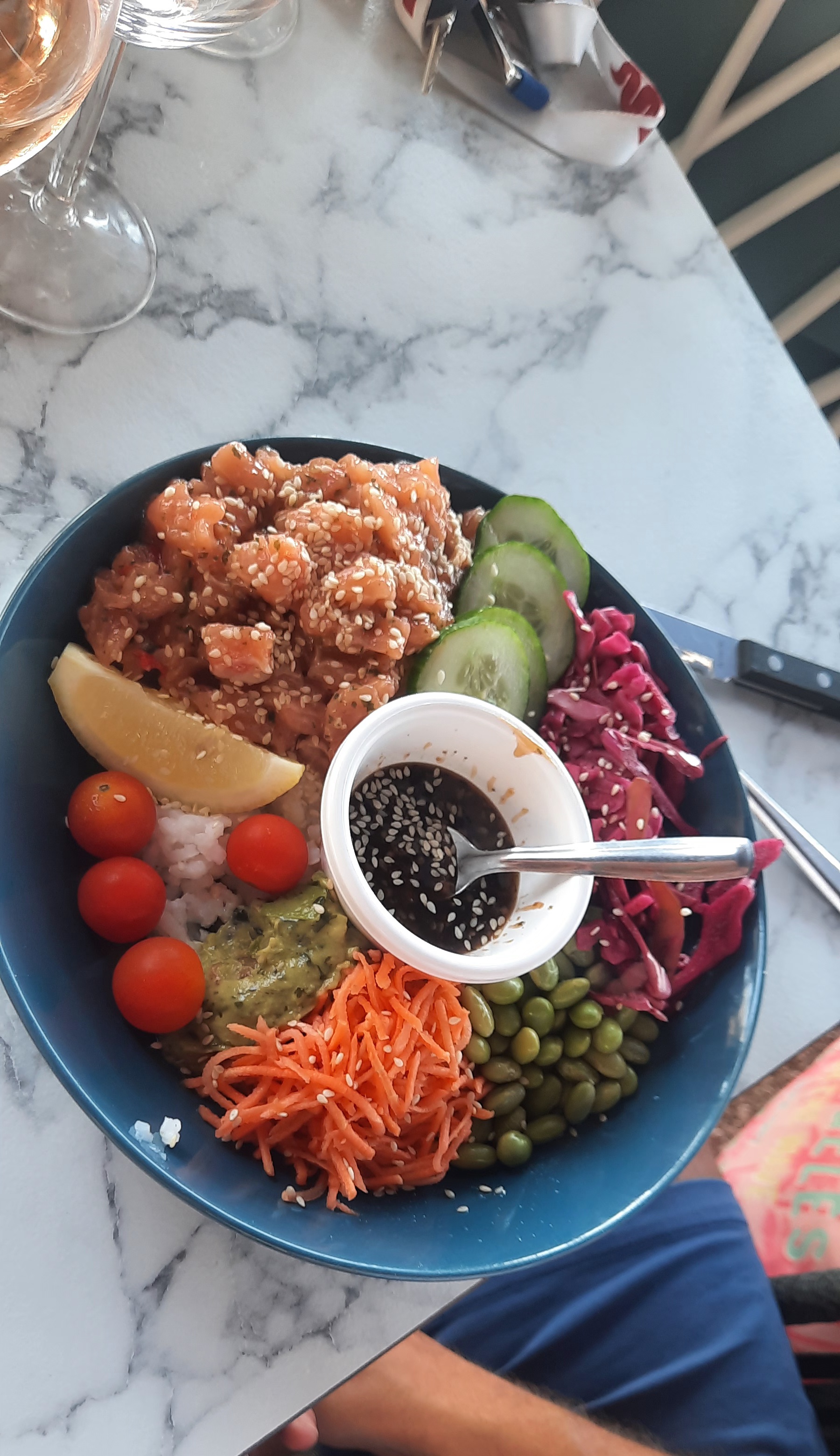 Un très bon choix de carte, même si tout à l'air trop bon et donc difficile de choisir (mais une carte courte ce qui est selon moi toujours un signe de qualité :) ) Heureusement le serveur très sympathique était là pour nous conseiller ! (Mention spéciale au sous-chef qui peut avoir les chevilles qui gonflent car sa cuisine est excellente ;) ). Nous avons été servis avec une bonne cadence entre les repas (et avec 3 enfants c'est important mine de rien). Et le cadre est vraiment très joli (rien que le carrelage dans les toilettes vaut le détour), on a adoré les petits plaids sur un des fauteuil (même s'il ne fait pas spécial froid, ça apporte une jolie touche cocooning). Sans doute accidentel, une mini panne de lumière nous a permis de pouvoir apprécier les couleurs du couché du soleil :) Un gros coup de coeur pour ce lieu :) A recommander à 100%