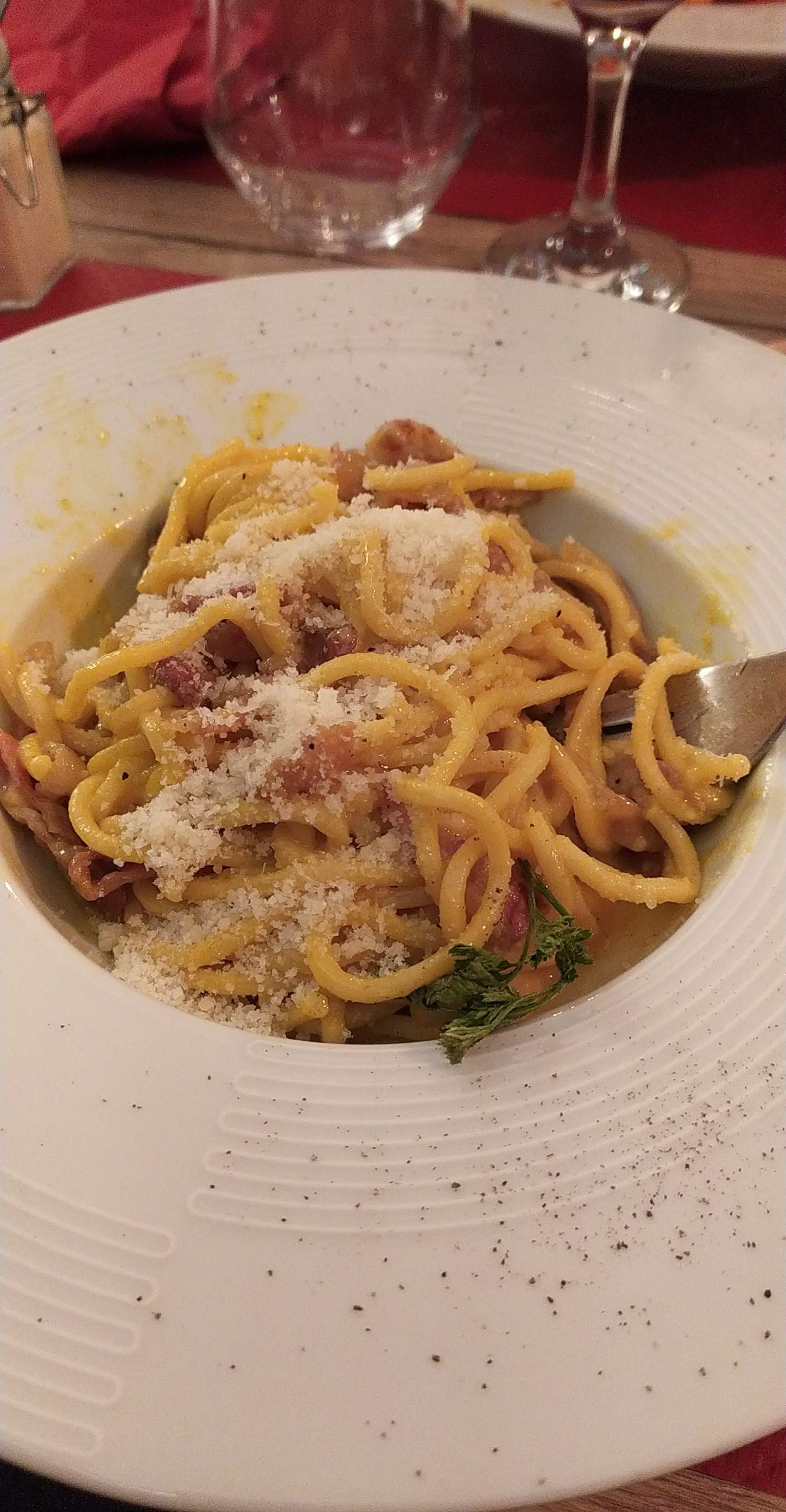 J aime bien cette esprit de respecter et donner la sensation d etre en Italie en proposant que des plats italiens. Leur pizza ont quelque chose de fascinante, elle change vraiment des traditionnels. J ai tester la vrai recettes des pâtes à la carbonara. Idem surprenant Malheureusement, il y avais pas grand-chose dans l assiette. Or la seconde fois que nous y avons été les assiette était bien plus remplie.