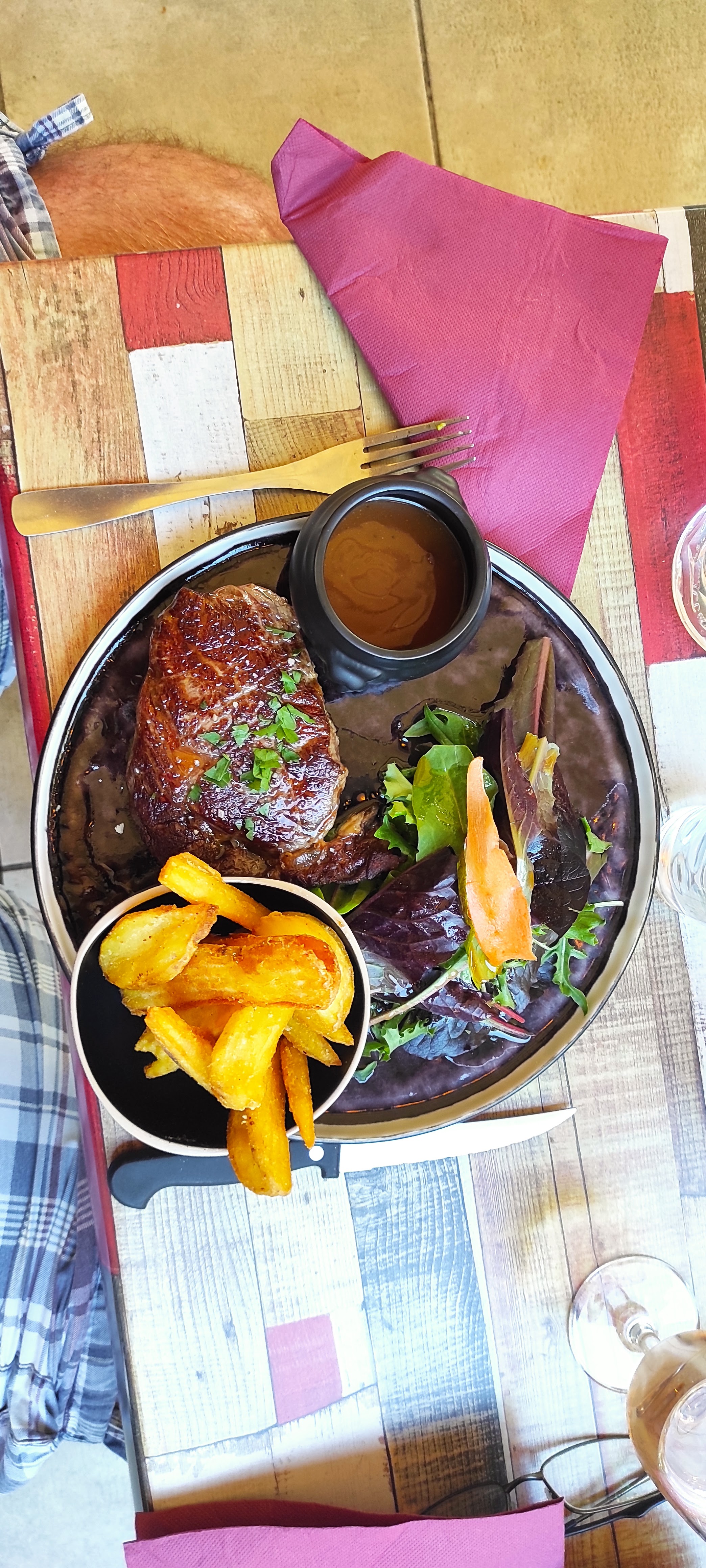 Cuisine copieuse et délicieuse.Personnel très attentif à la demande du client (cuisson de la viande demandée respectée chaque fois que nous y sommes allés). Nous sommes belges et voyageons en camping car et nous étions déjà venus en 2019 et nous y sommes revenus avec grand plaisir.N'hésitez pas à vous y arrêter vous ne le regretterez pas ! A recommander !