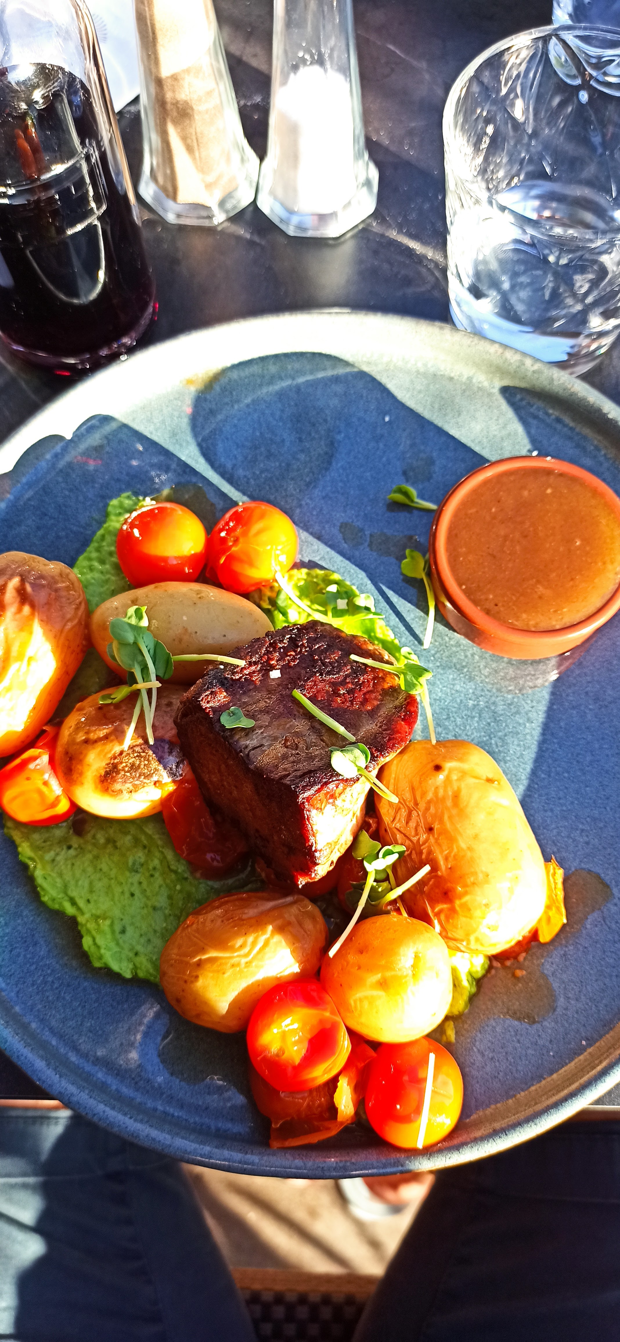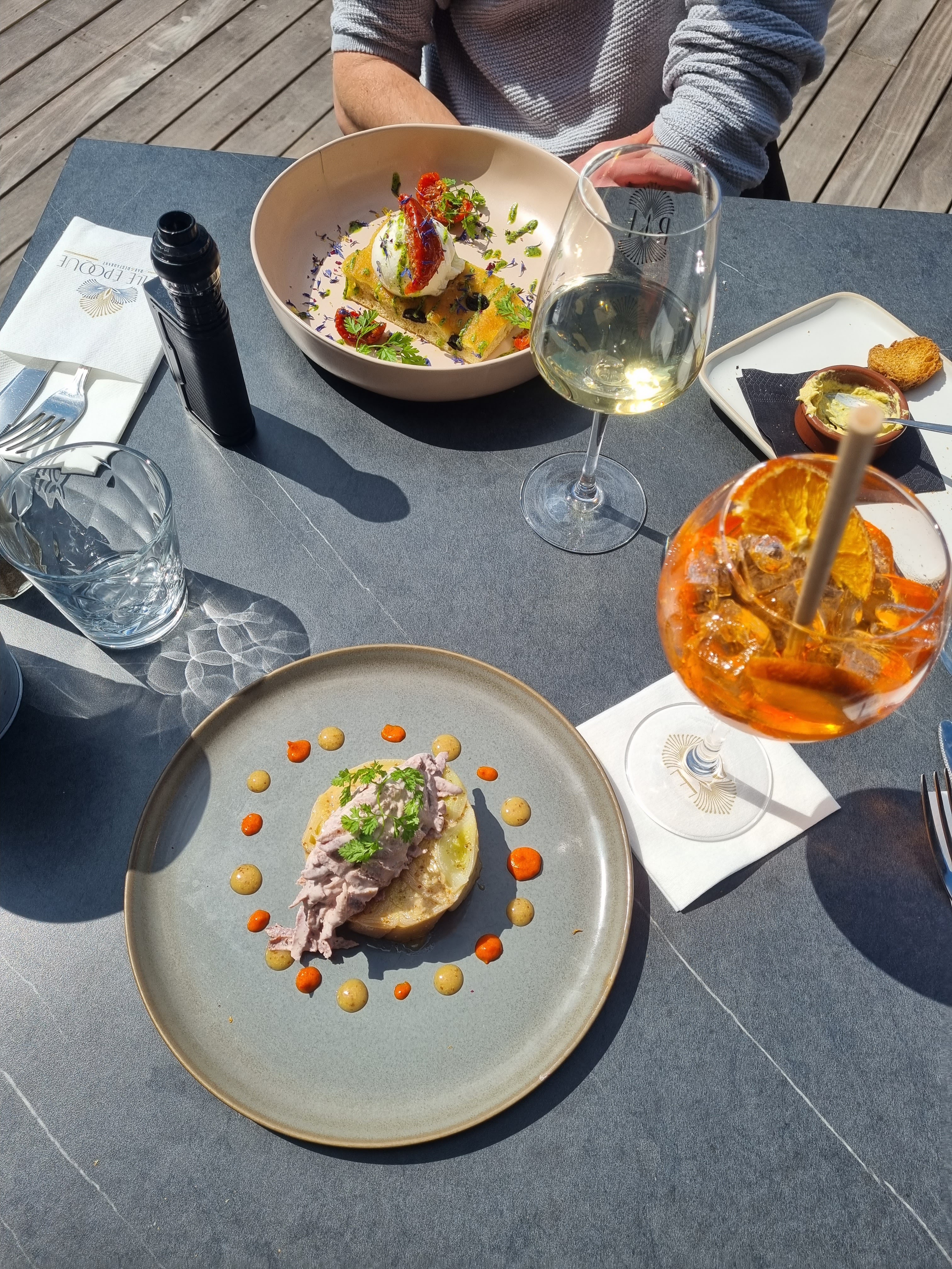 De passage en vacances : - Beaucoup beaucoup trop cher pour une cuisine trompeuse. - La cuisine est très décevante : Le saumon gravlax n'avait RIEN du gravlax. C'était juste 4 chutes de saumon crues à peine marinées, sans aucun parfum ; mais EN AUCUN CAS DU GRAVLAX. - Le filet de dorade était BEAUCOUP TROP CUIT, donc super SEC, du carton sous la dent. On pourrait penser que le filet de dorade a été plaqué sous une spatule dans la poêle pour qu'il cuise plus vite. Je pouvais le saisir entre 2 doigts à une extrémité et le filet tenait d'un seul bloc sans se démonter ! - Hormis cela, l'endroit est très agréable, le service très souriant et sympathique. Malheureusement, je ne recommande absolument pas ce restaurant.