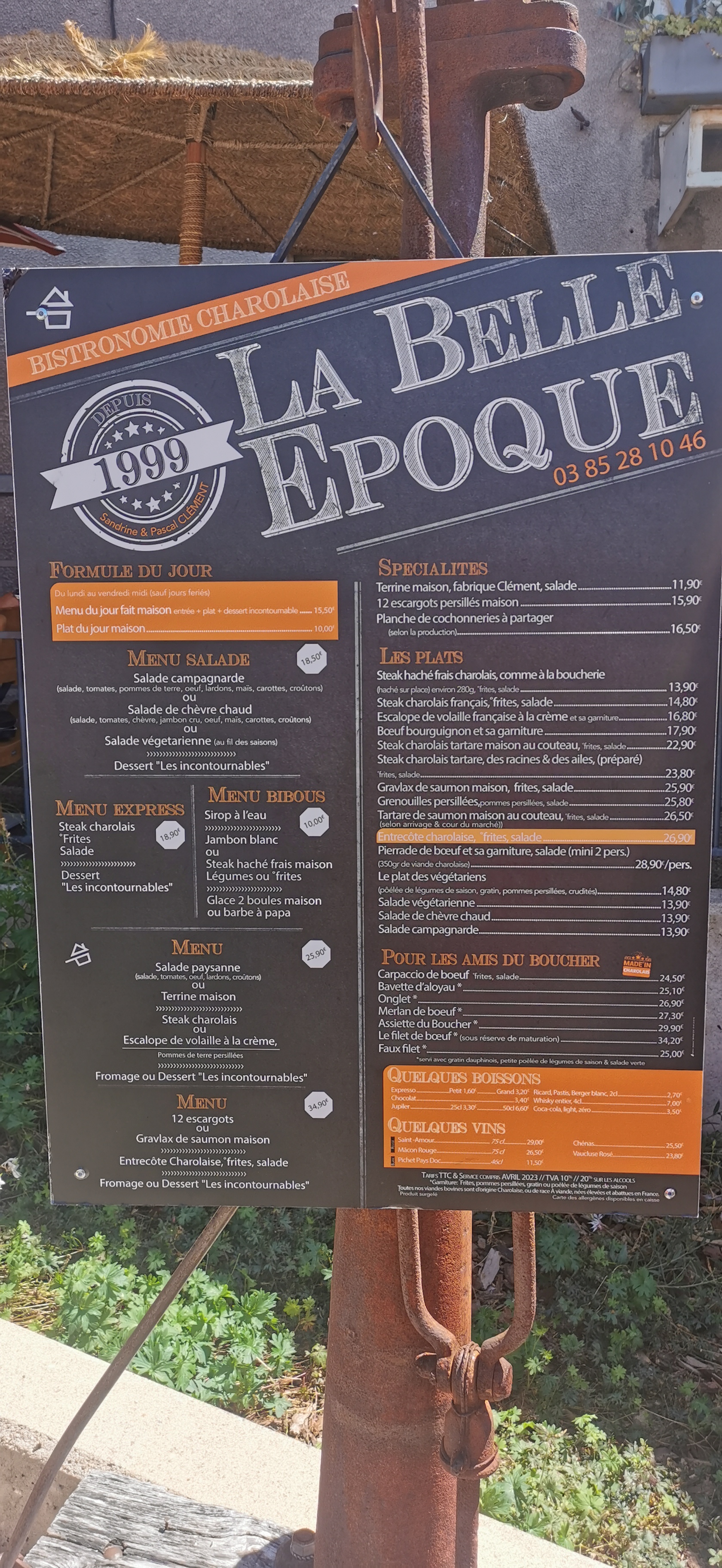 A la belle époque on se régale avec de la très bonne viande charolaise si l on est amateur ! Le cadre est très beau , surtout en terrasse face au château et le patron n hésite pas a jouer un air d accordéon pour votre anniversaire !