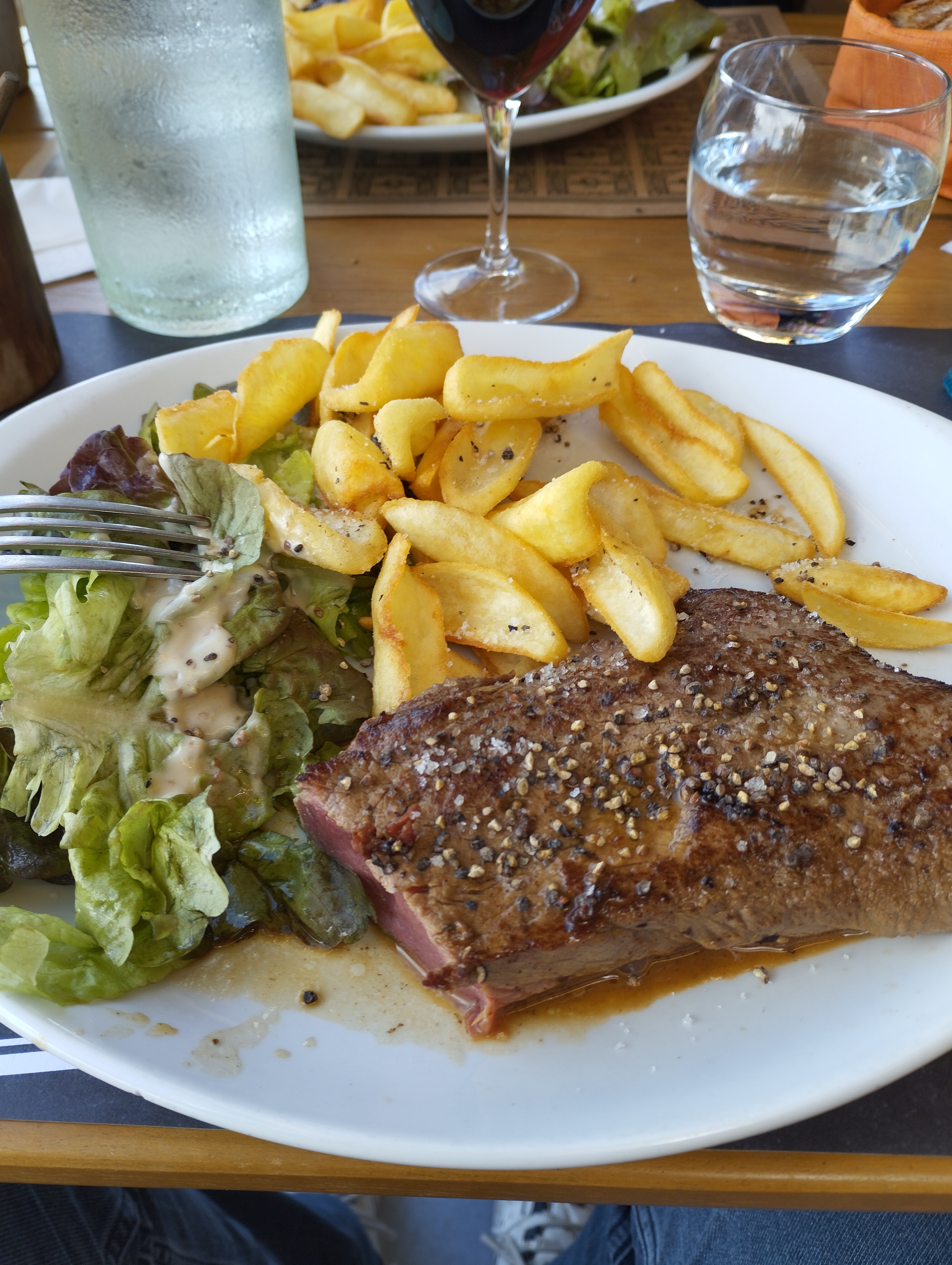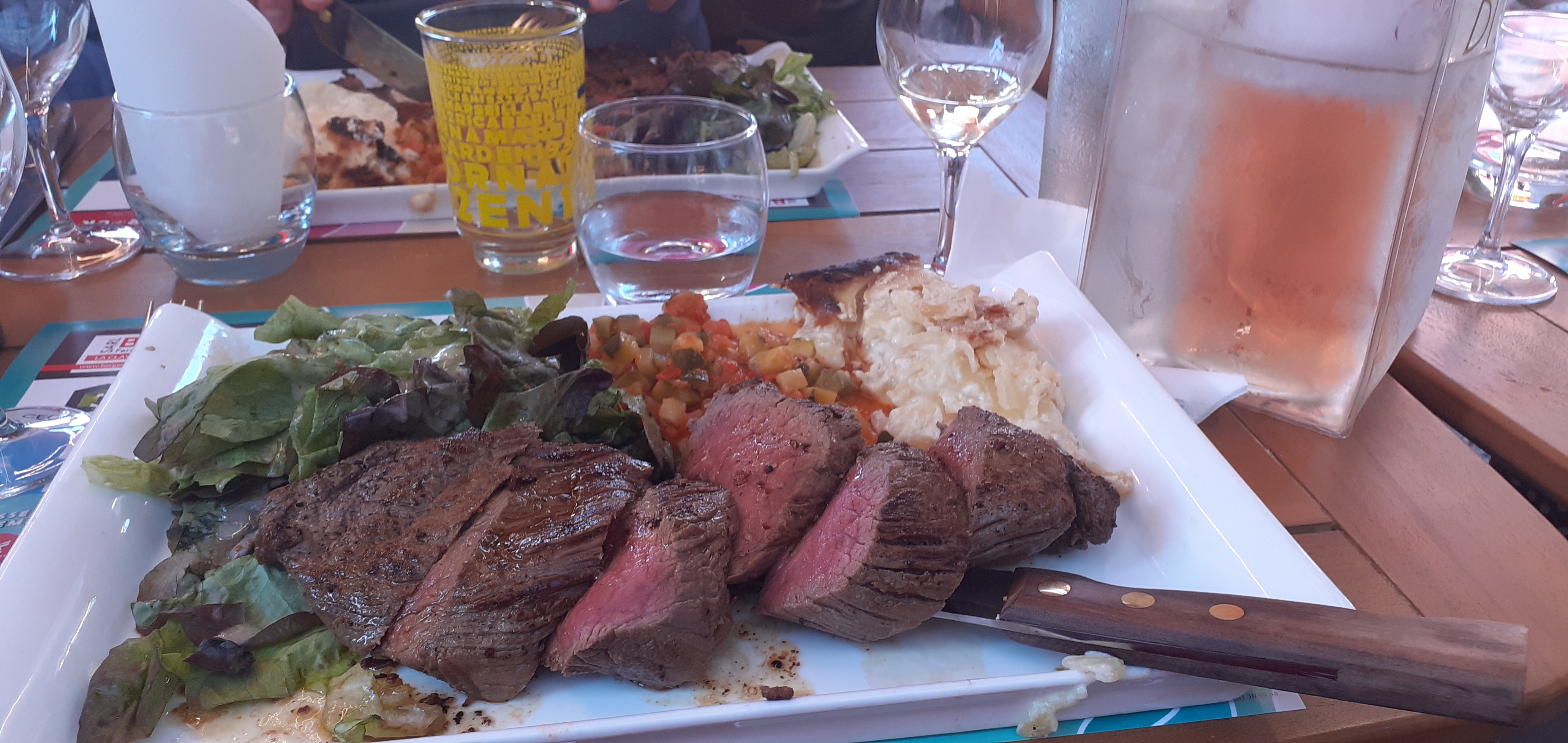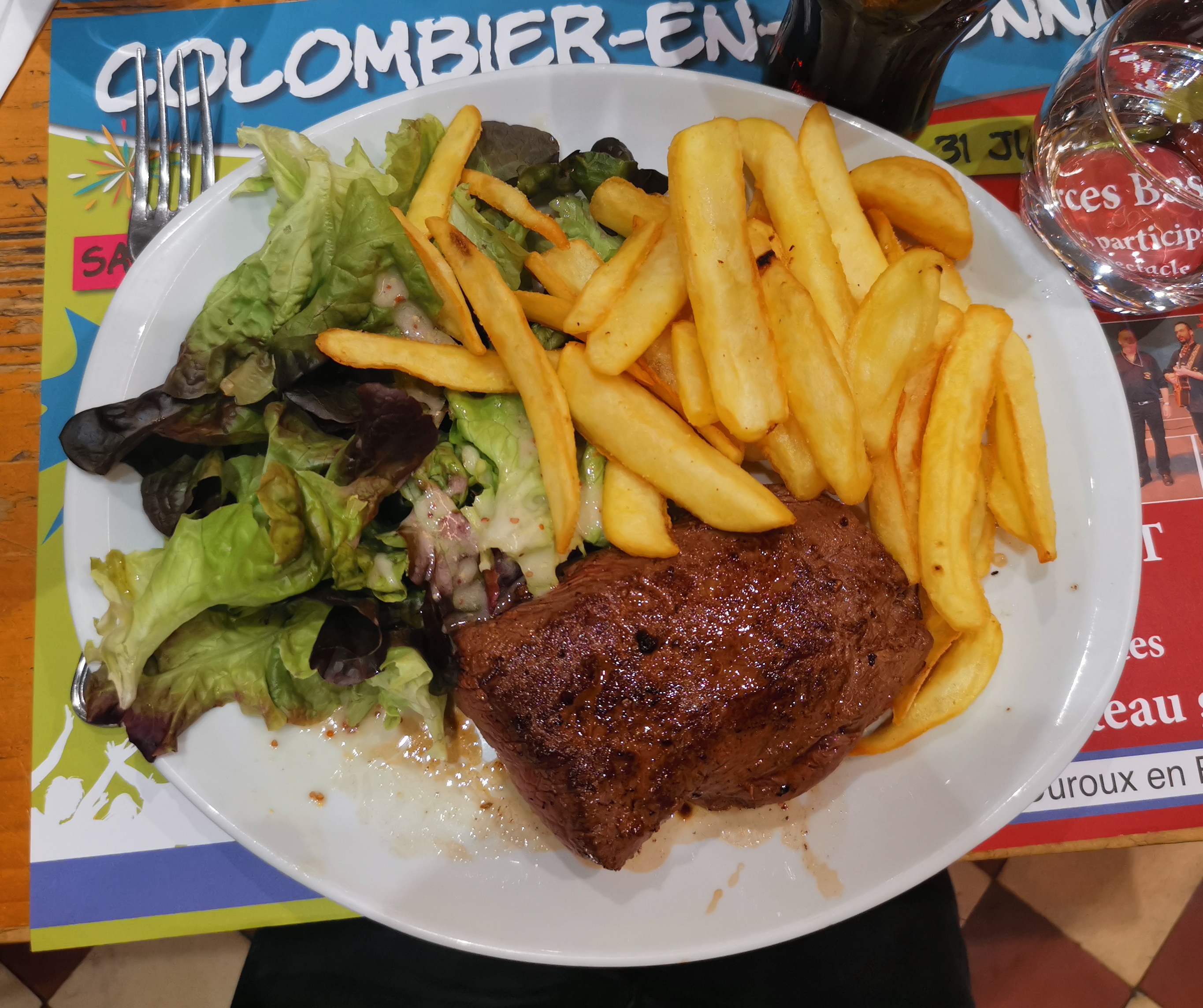 En face du château, une jolie déco, un service efficace, de la bonne viande …. Mais quel dommage de la servir avec des frites congelées cartonneuses et de la salade agrémentée de sauce diluée à l’eau ! Le patron encaisse les notes sans poser de question genre « cela vous a plu ? », c’est dire qu’il doit être conscient des quelques points faibles de son établissement …
