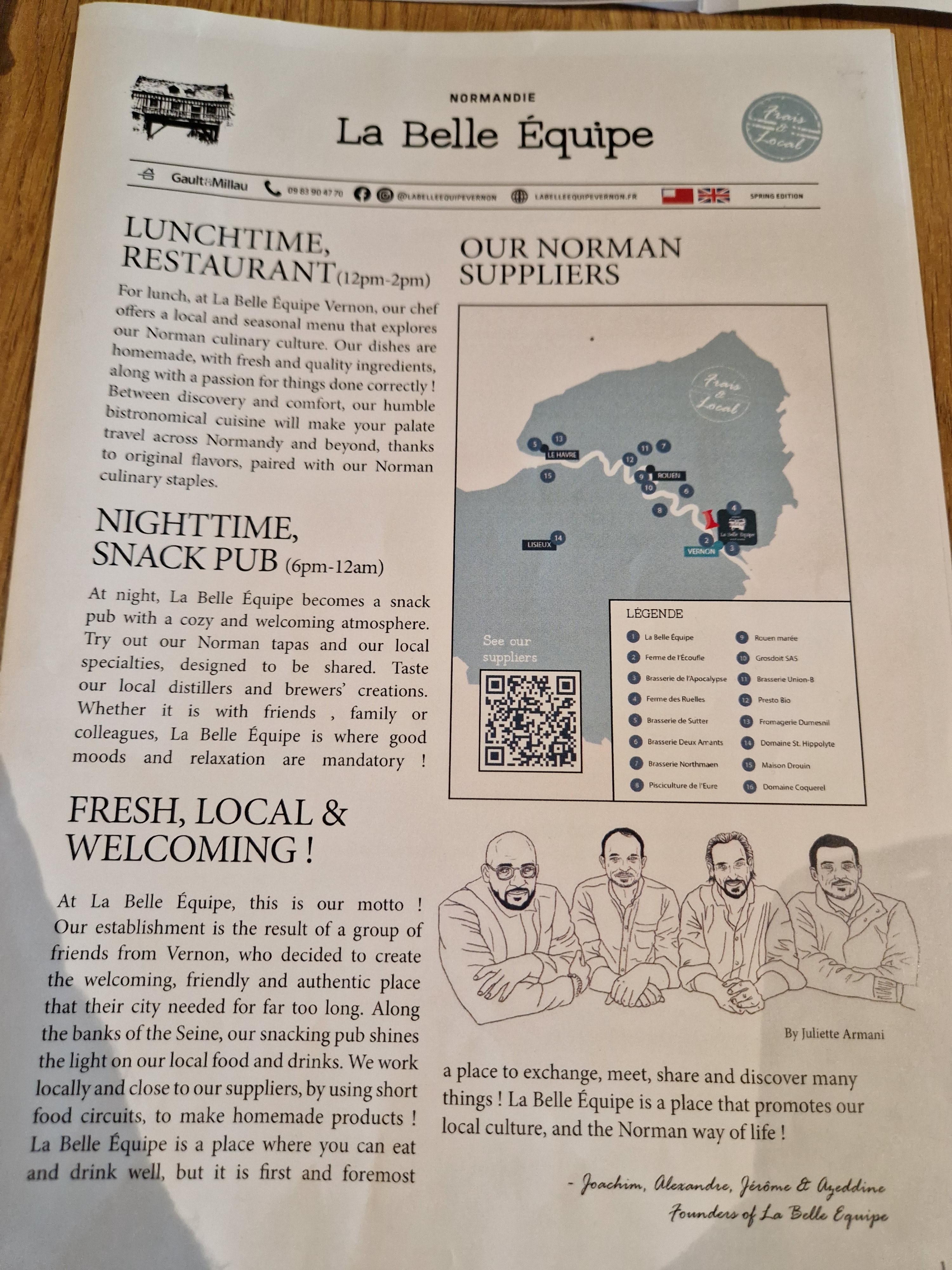 Une véritable pépite ! J'ai testé le bar à manger le soir c'était super. La sélection de bière est top, locale au maximum. Tout comme la nourriture, les quantités sont généreuses et c'était tellement bon. C'est tout bête, mais rien que le pain est bon et donne plaisir à manger. Et tout ça en gardant un prix tout à fait honnête. J'ai tellement aimé que je suis revenu tester le restaurant le lendemain midi, très bon aussi. En tout cas, si je repasse à Vernon, je reviendrai faire un arrêt à La Belle Équipe pour sûr !