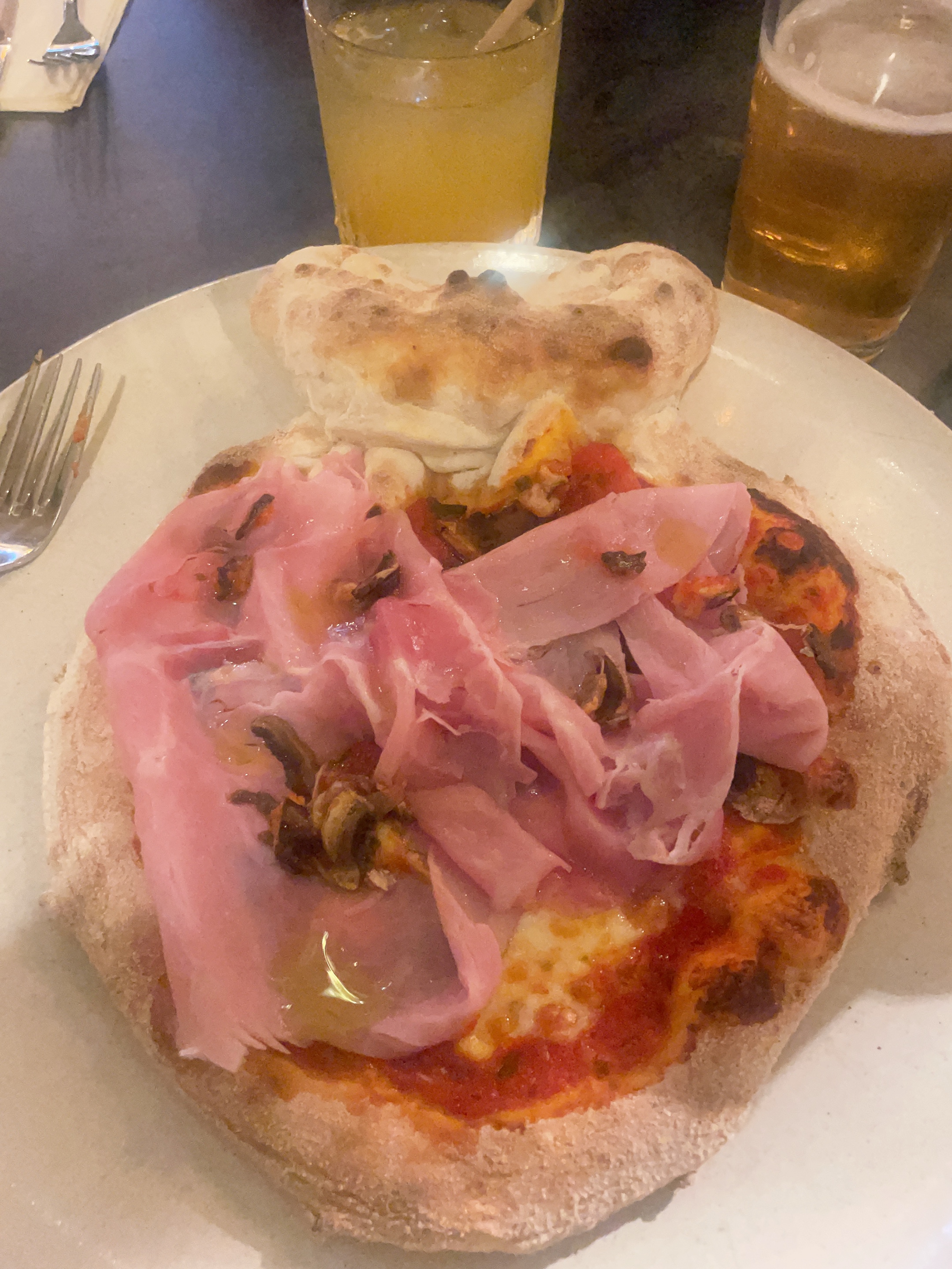 c'est la première visite de mon ami et moi-même à Paris - nous sommes arrivés vers 18 heures le soir du 23-5-24 et nous voulions un endroit proche de notre hôtel pour le dîner… nous avions réservé La Belle Ville à l'avance et quand nous sommes arrivés, nous avons été rapidement emmenés avec un choix de table… notre serveur (dont nous n'avons malheureusement pas connu le nom) était incroyable, il avait des lunettes et était extrêmement sympathique, il nous aidait à pratiquer et à commander en français et a rendu toute l'expérience si amusante. mon ami avait une pizza Burrata et moi-même la Regina avec des olives ajoutées, toutes deux délicieuses ! merci pour cette belle première soirée à Paris.