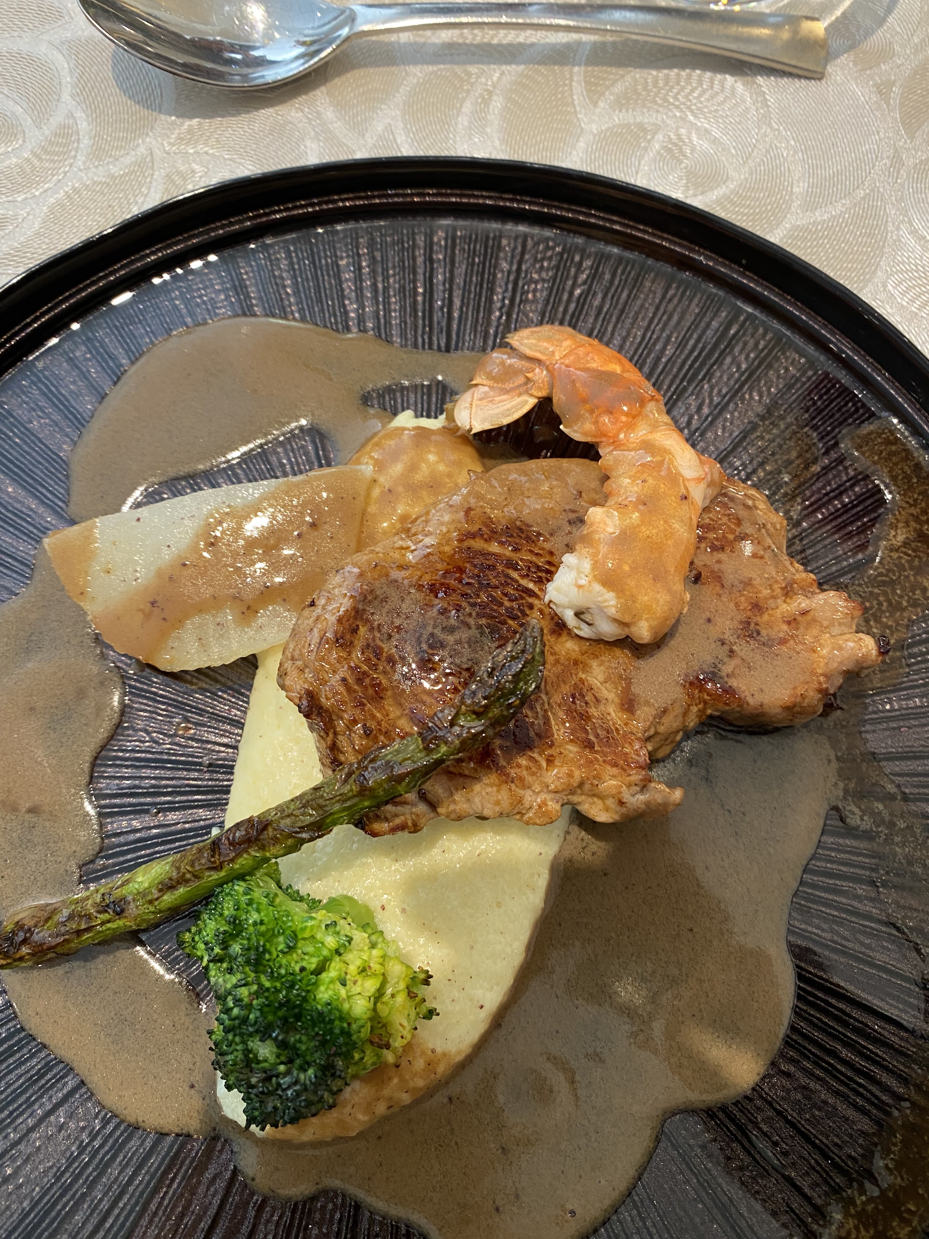En entrée c'est un buffet qui est bien frais et avec du choix . Ensuite diverses propositions de plats vous sont proposés. Très bon , bonne cuisson , mes papilles ont appréciées . Les desserts simples et bons . Je recommande .