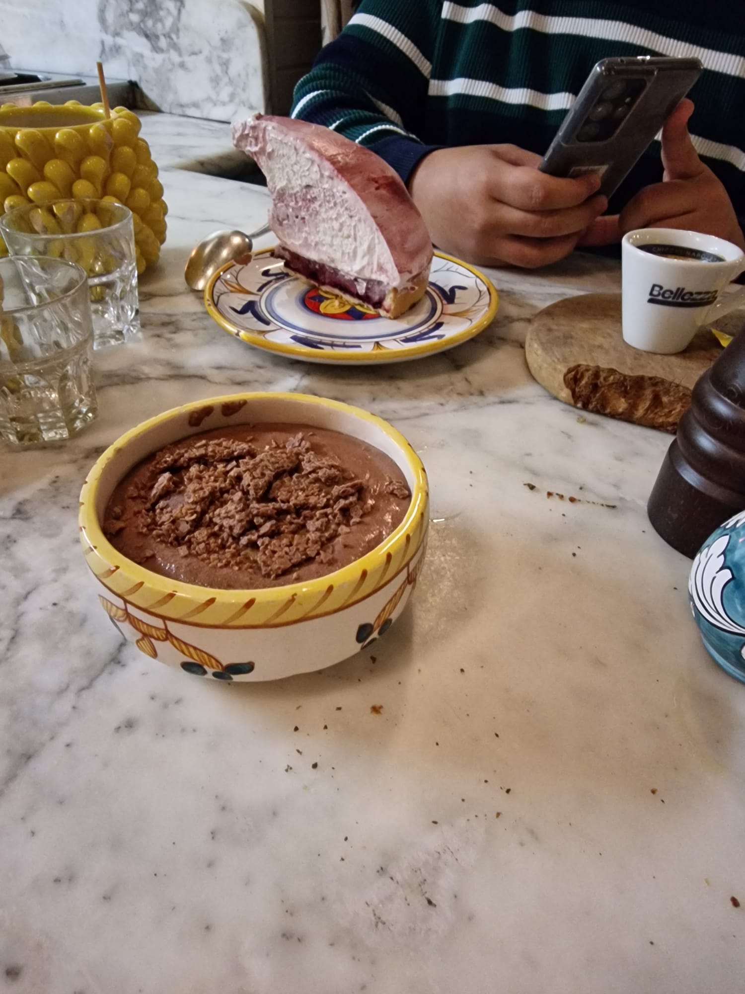 3eme visite pour nous qui considérons ce restaurent comme le meilleur italien de Lille. Nous sommes venus à l’occasion de la fête des mères en réservant à l’avance pour 6. Nous sommes arrivés avec un + 1 ce qui n’a posé aucun problème à l’équipe du restaurent. L’accueil est chaleureux, l’ambiance véritablement comme en Italie et les plats sont délicieux. Le rythme de service est juste comme il faut. Nous avons pris de délicieux cocktails accompagnés d’une stracciatalla et d’une bruschetta. Puis nous nous sommes régalés avec l’incontournable à commander : les pâtes aux truffes. Nous avons aussi testé les pâtes au pesto ainsi que les lasagnes végétariennes. En dessert, la tarte choco clap clap sur son lit de mascarpone légère est un pur régal. Les glaces sont également très bonnes. Malheureusement certains d’entre nous auraient voulu goûter la panna cotta et le dessert à la rhubarbe mais ces derniers n’étaient plus disponibles. (Nous avions réservé pour 13h15, la commande des desserts s’est effectuée vers 15h). N’hésitez plus à vous rendre à La Bellezza, vous ne serez pas déçus.