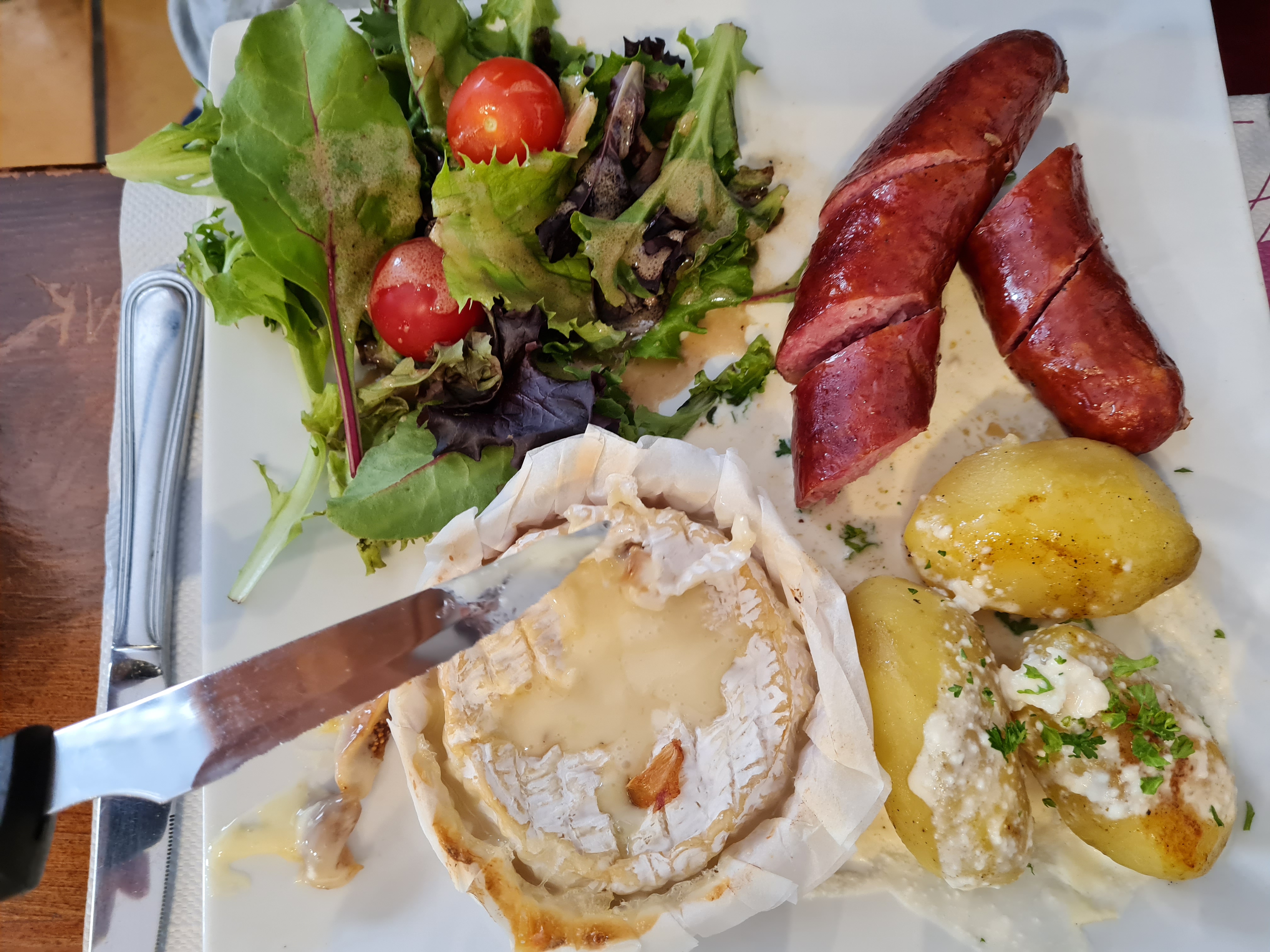 Une bonne raclette, avec du saucisson, des pommes de terre rôties et du fromage. Bonne attention. Nous le recommandons !