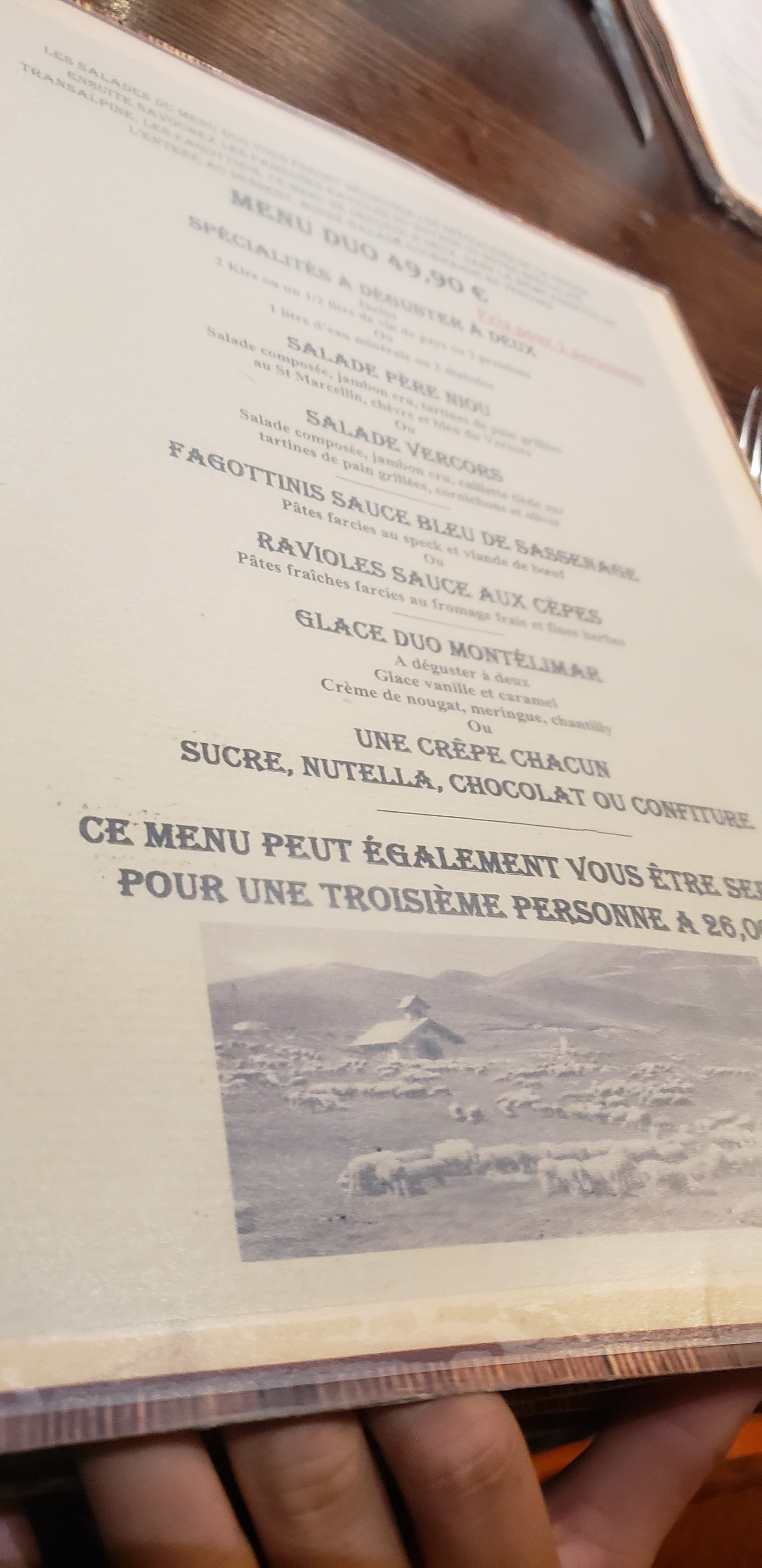 Nous avons passé une très agréable soirée à la bergerie et n'en déplaise aux commentaires négatifs , nous ne nous sommes pas sentis comme des moutons. C'est désobligeant envers les clients qui ont le droit d'avoir leurs propres goûts. Les serveurs étaient très sympathiques et très avenants. Tous ont eu des gentillesses envers nous. Le service était rapide malgré le monde. Le repas était excellent et le dessert aussi. Le patron nous a déclamé le menu et cela nous a beaucoup fait rire. Nous avons trouvé cela très dépaysant et très folklorique. Nous garderons un souvenir impérissable de ce moment. Ce repas était une tuerie mais nous sommes partis en vie et le ventre plein. Je recommande ++++++ Merci à eux . À bientôt peut être lors d'un prochain séjour dans le Vercors.