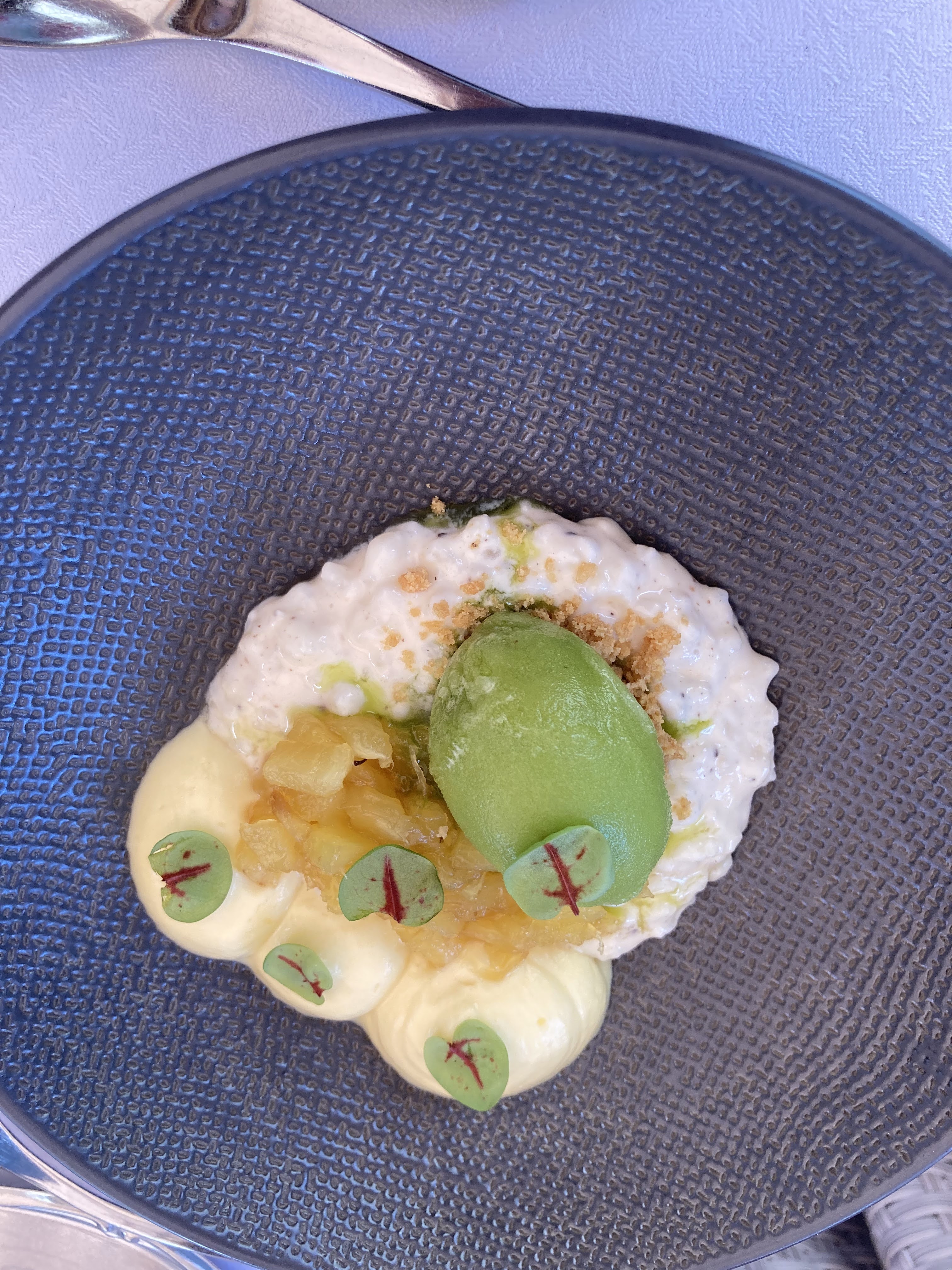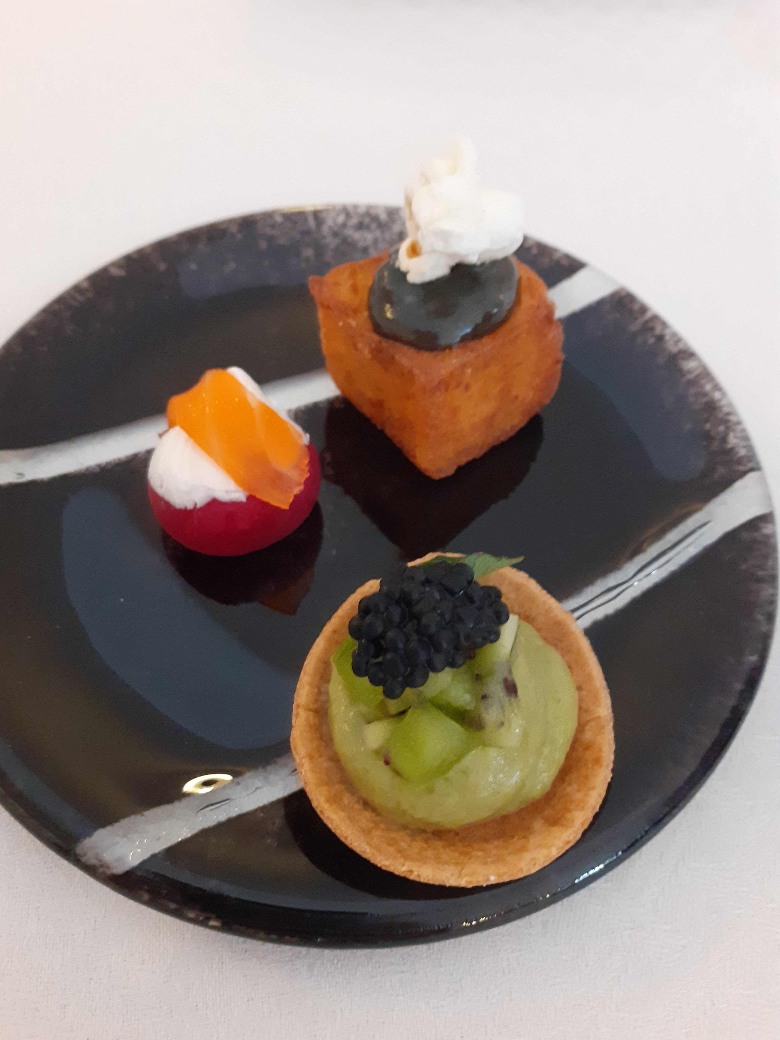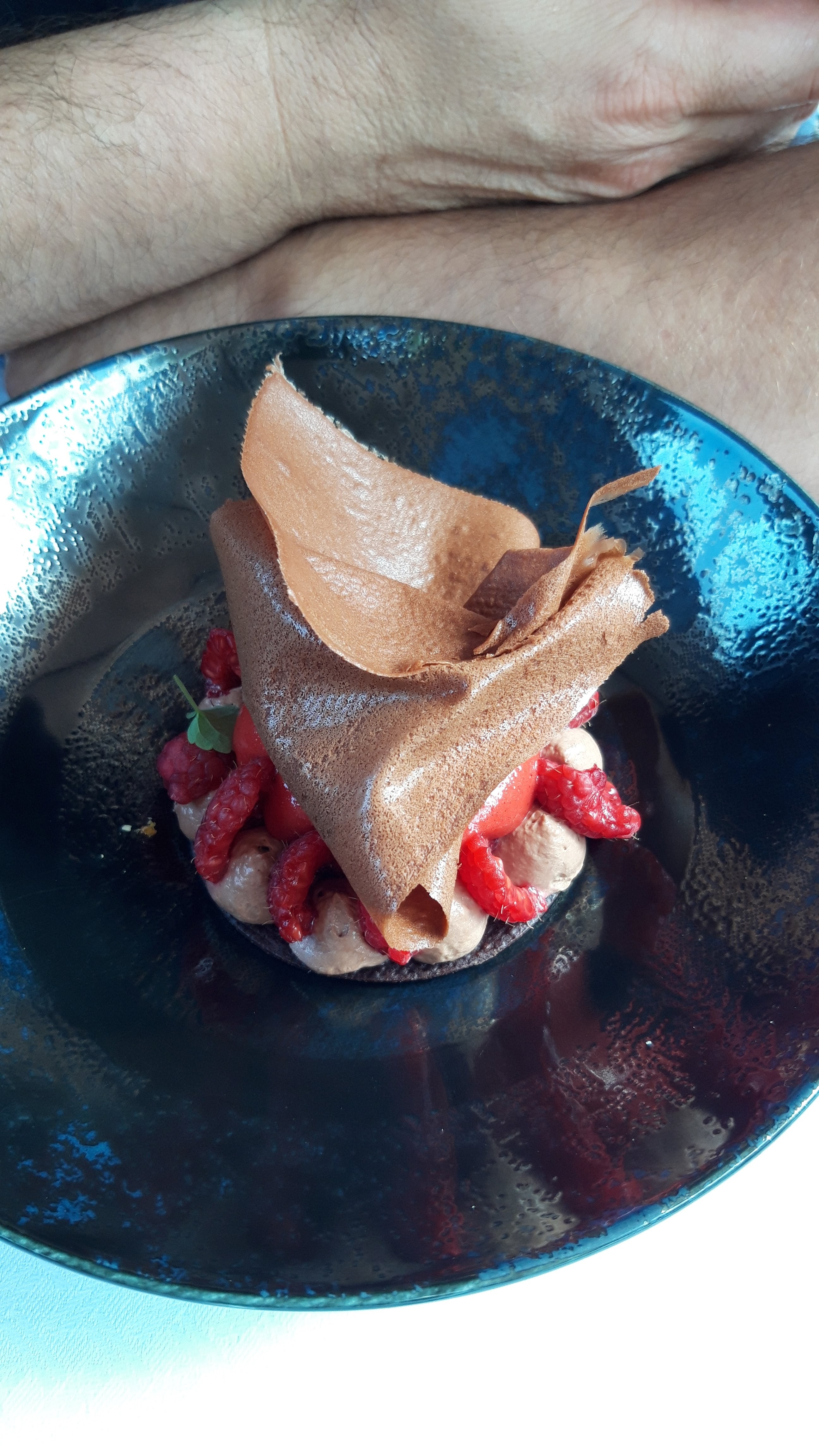 Une cuisine savoureuse et surtout audacieuse ! De très belles assiettes et de grosses prises de risques. Dressages millimétrés, explosion de couleurs et mélanges novateurs. Coup de cœur pour le maki de tourteau, avocat et kiwi. Belle surprise au moment du pré dessert « mystère » dans lequel se cachait un sorbet au curcuma… Délicatesse, fraîcheur et légèreté, un trompe l’œil qui joue parfaitement son rôle de transition entre le salé et le sucré ! Une adresse avec un énorme potentiel