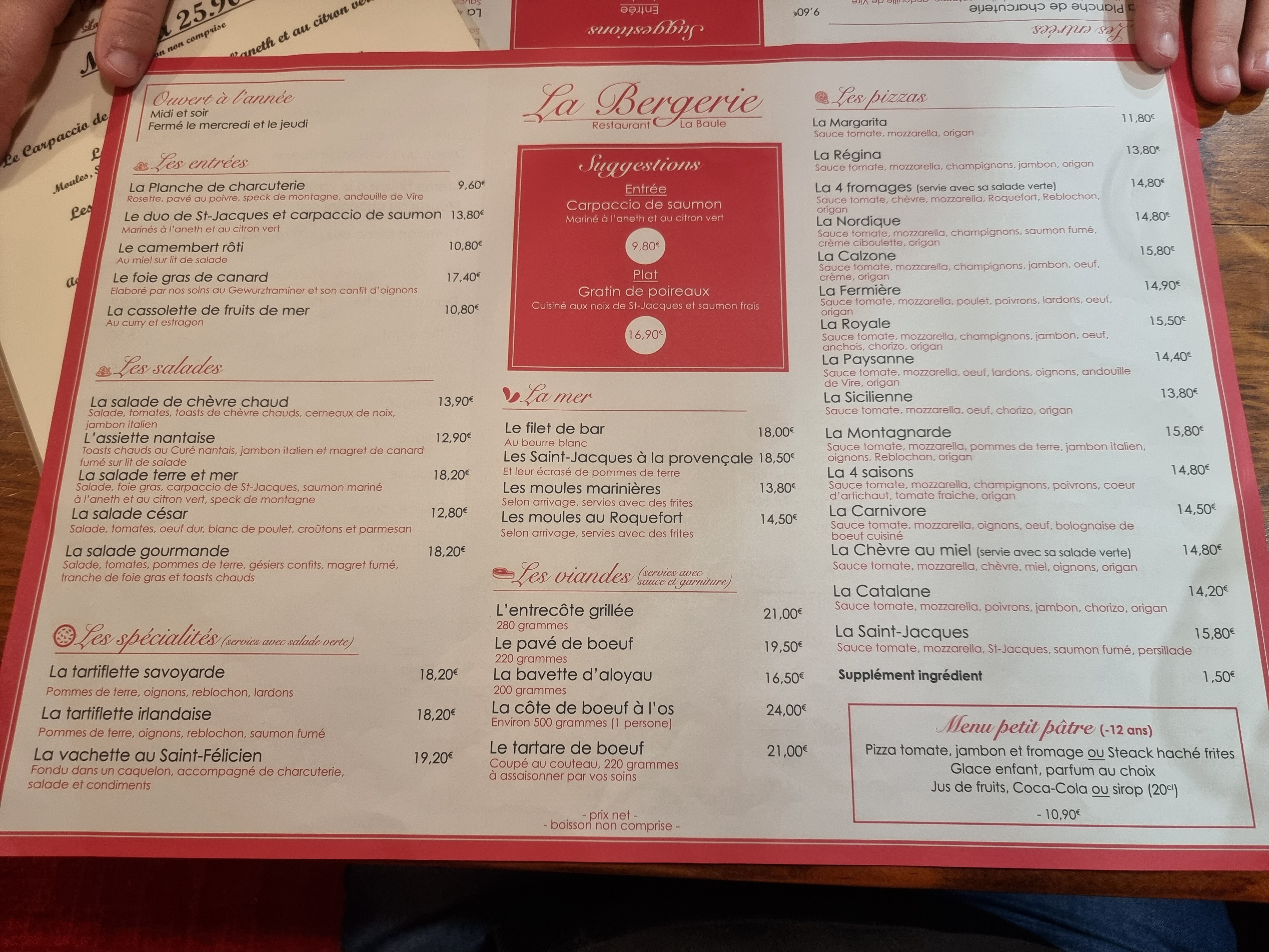 Accueil plutôt agréable, temps long nous avions connu la bergerie il y a quelques années ce n’est plus la même qualité de cuisine. Le steak haché dans le menu enfant dure comme de la pierre pas appétissant avec 12 frites oui oui on les a comptés… le poulet dans la salade César pas terrible d’ailleurs j’ai tout laissé les épices dessus prenaient le dessus . La salade chèvre chaud était bof bof pas De vinaigrette pourtant réclamée 2 fois les tomates coupées en petits cubes pour remplir l’assiette n’est pas une bonne idée! Sauce poivre plus un goût de crème que de poivre . Dommage ça été à l’époque un bon resto.