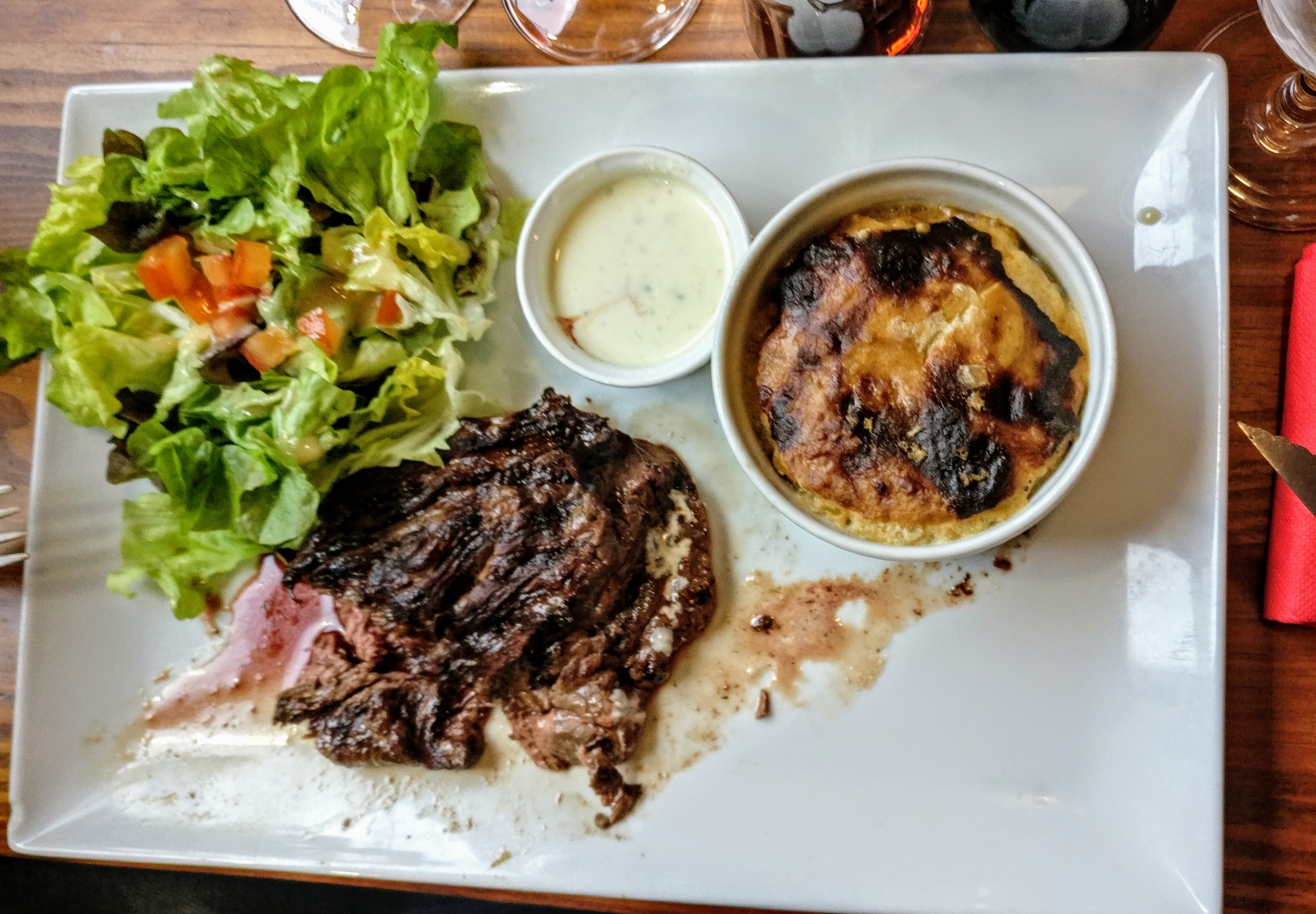 Dommage. Frite surgelés pas cuites, une sauce échalotes qui n'as pas vu une réduction avec le vin rouge. Une feuille de salade dans l'assiette. Une tarte au pomme fait sûrement par un enfant, je ne parle même pas de ce caramel industriel qui pique dans la bouche. 4 en cuisine, bravo 😡😡😡😡