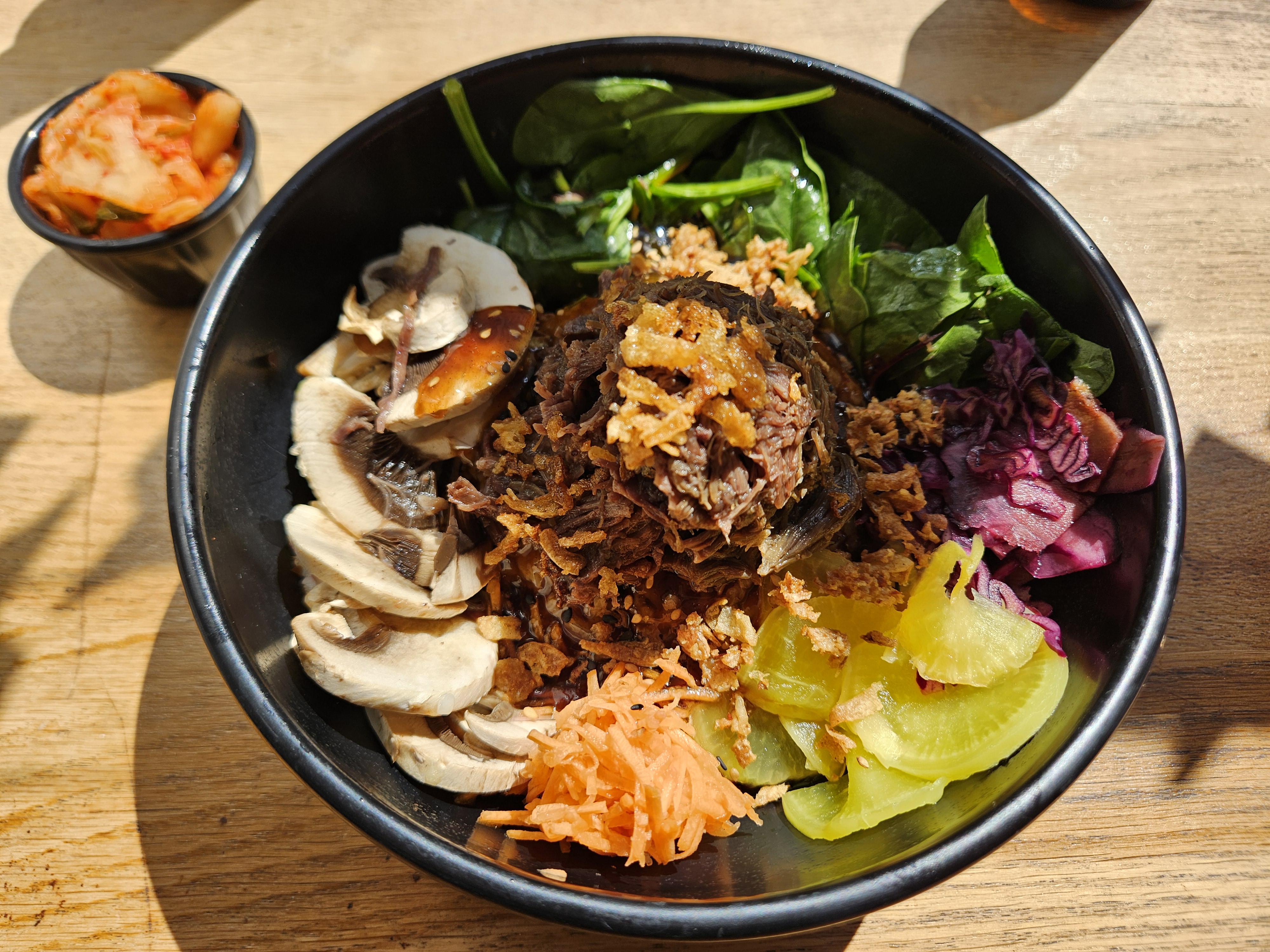 Le bibimbap est très bon. J'ai apprécié les instructions disposées ça et là qui permettent de savoir comment le déguster ainsi que les explications supplémentaires de la serveuse. Service rapide et agréable, lieu charmant. Petit bémol, j'ai trouvé que le rapport qualité-prix n'était pas forcément des plus intéressants. J'ai pris du kimchi en supplément et j'ai eu un tout petit pot, que vous pouvez voir sur la photo.