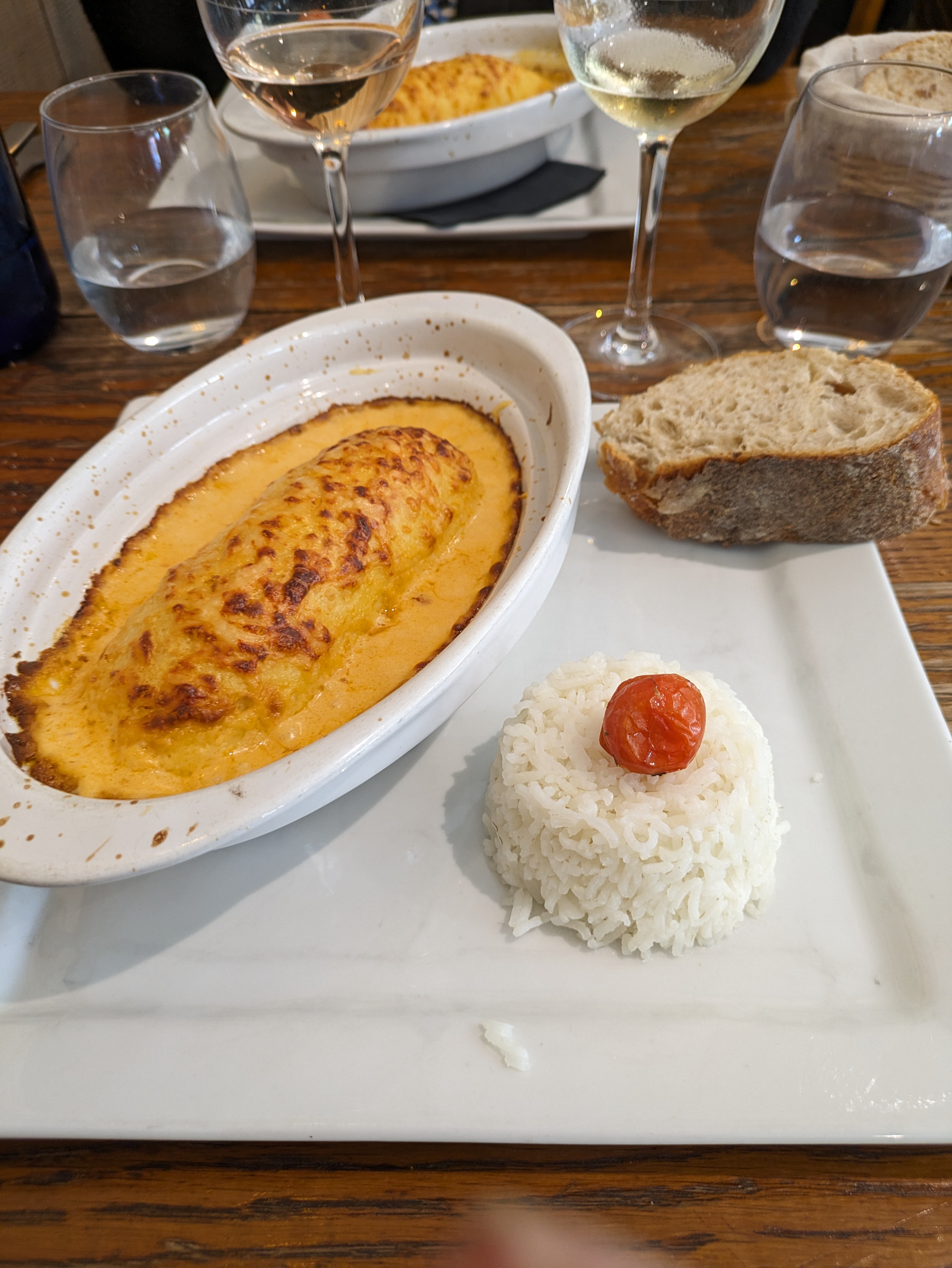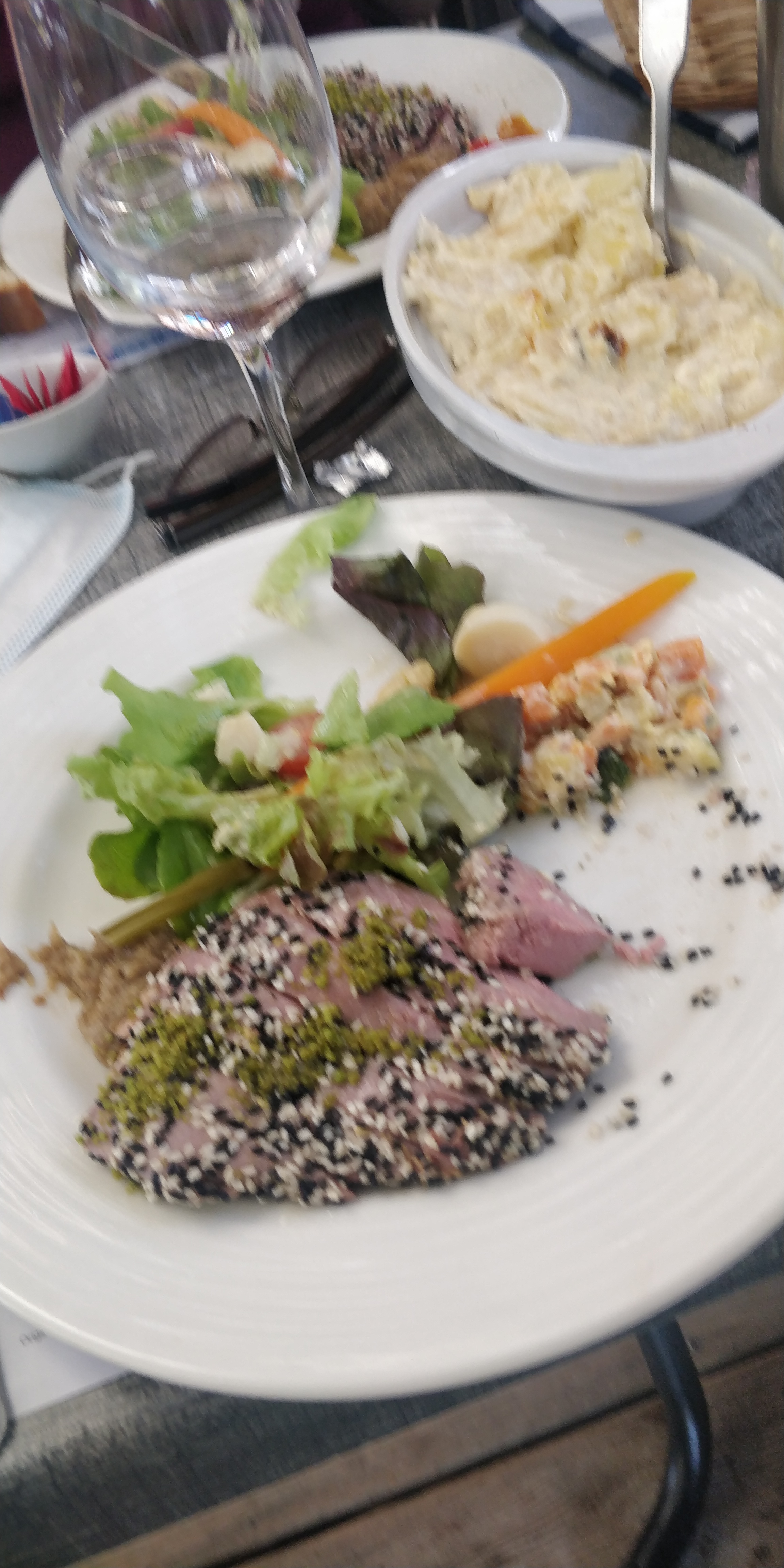 Nous avons attendu très longtemps, le service était laborieux et mal coordonné (ils viennent plusieurs fois pour la même chose et ensuite plus rien, on ne comprend pas qui fait quoi mais c'est très long). Les portions sont petites, d'autant que ce jour-là, l'accompagnement proposé avec tous les plats était du gratin dauphinois ; étant allergique aux produits laitiers, j'ai demandé si je pouvais avoir autre chose, par exemple des frites ou du riz (avec du poisson). On m'a fait cette réponse surréaliste : on n'a pas de frites, on n'a pas de riz. Donc après la petite salade riquiqui en entrée, j'ai mangé mon plat sans accompagnement, en 4 coups de fourchette c'était fini... je suis allée manger 1 kg de fruits en sortant lol. Bref, si tu es allergique aux produits laitiers (allergie pourtant signalée à la réservation), tu es puni!