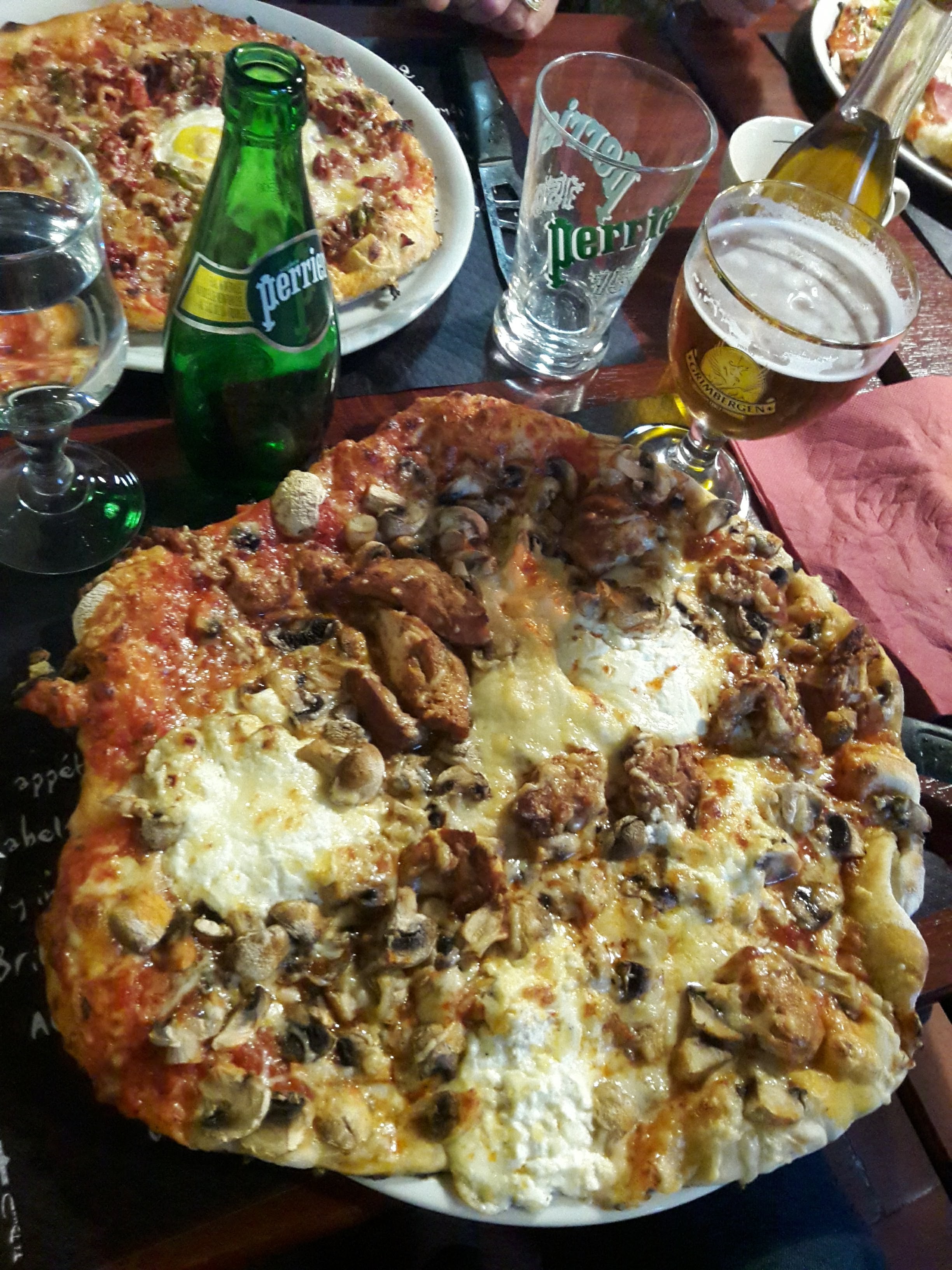 Pizzas délicieuses et... énormes. Heureusement les patrons (fort sympathiques) vous proposent un doggy bag. De quoi assurer l'apéro du dimanche matin, si bien sûr vous y mangez le samedi soir :) En plus vous pouvez recharger votre Tesla (ou votre Zoë, c'est selon) gratis aux bornes électriques sur la place attenante au restaurant (il devrait y avoir le même principe pour les diesels). Bref tout pour passer un super moment.