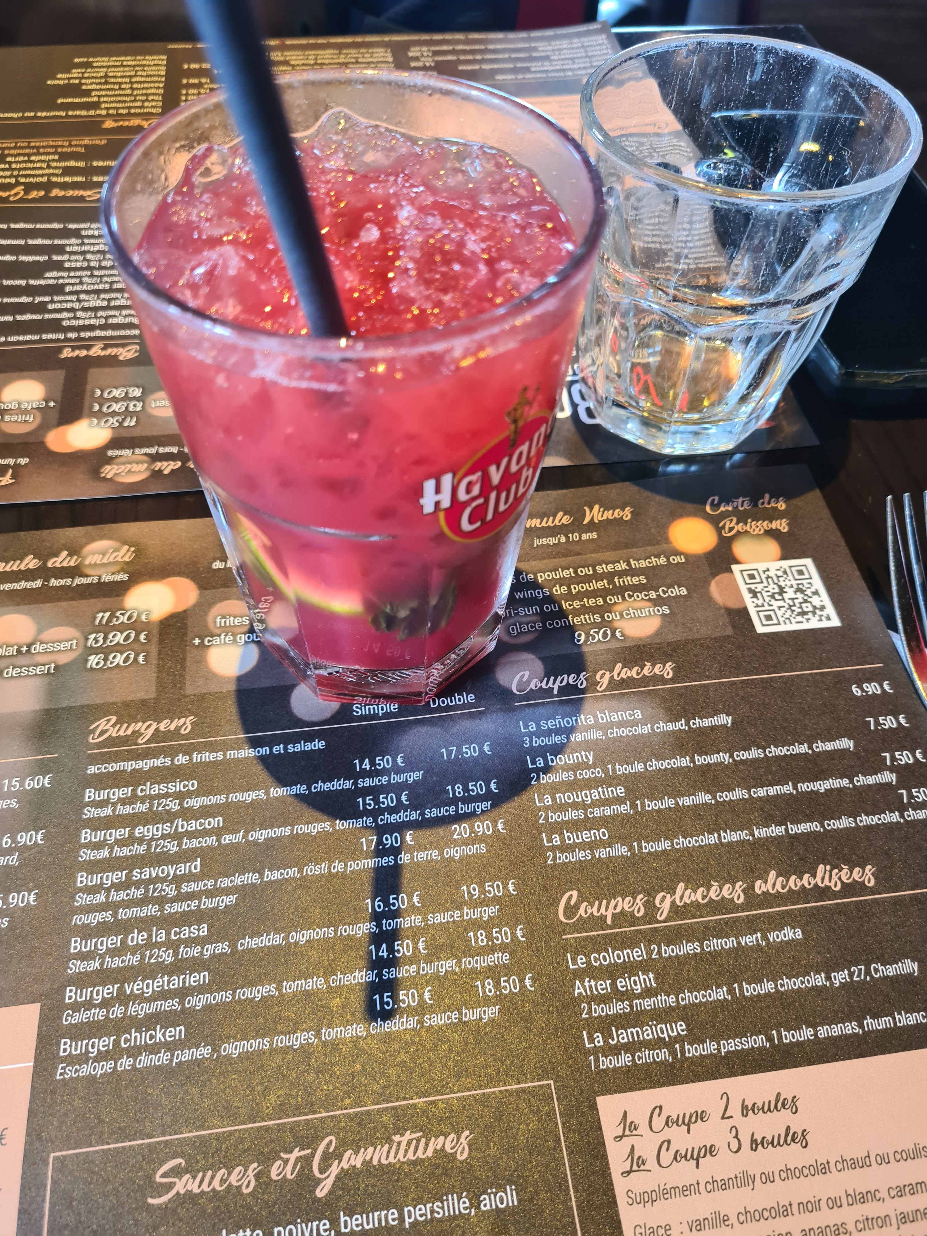 Nous sommes venus à la soirée des années 80 bonne ambiance Par contre niveau apéritif j'ai commandé un mojito qui était censé être aux fruits rouges goût que n'ai pas retrouvé et surtout bcp trop de glaçons et j'ai bu un verre d'eau aucuns goûts... la pinacolada idem .. la bière à la menthe trop de menthe et la sangria aucun goût Sinon la cuisine était bonne et quantité largement suffisante