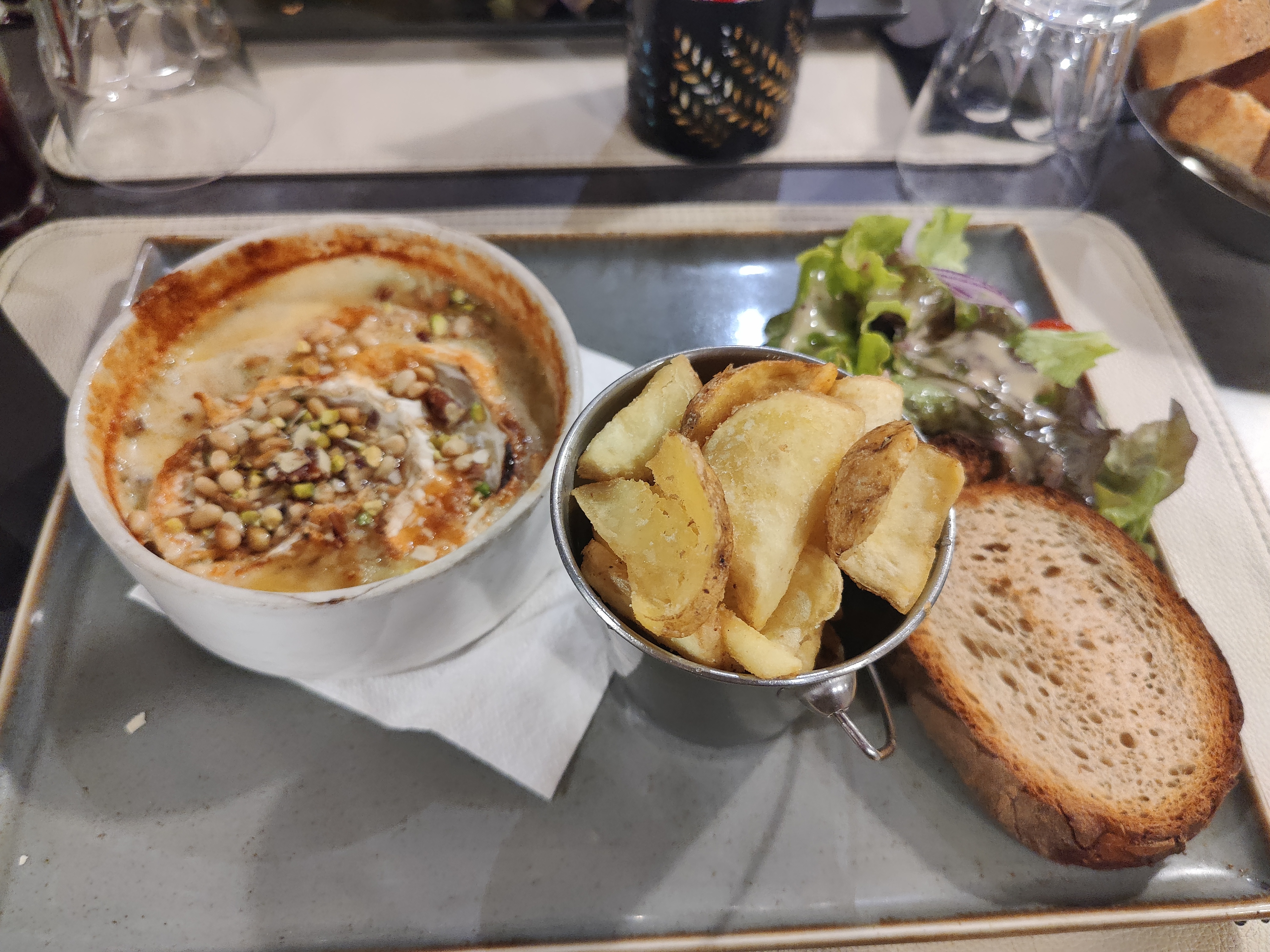 Arrivés début de soirée il faisait froid 🥶 nous avions envie de nous réchauffer et de prendre un verre et des apéros Le serveur qui nous accueille nous dit que ce n’est pas possible de se mettre à l’intérieur, c’est uniquement pour ceux qui viennent manger. Le restaurant est vide… donc nous ne comprenons pas vraiment. Nous nous mettons dehors, puis finalement 15min plus tard il revient en nous disant que c’est possible … nous avions pris un « demi camembert » je n’avais jamais vu ça, et le prix à côté de ça n’est pas coupé en deux. Nous avions prix également d’autres apéritifs, je passe les détails mais vraiment ni goût ni sentiments… je pense que c’est un resto de passage, pour manger un burger ou une pizza.