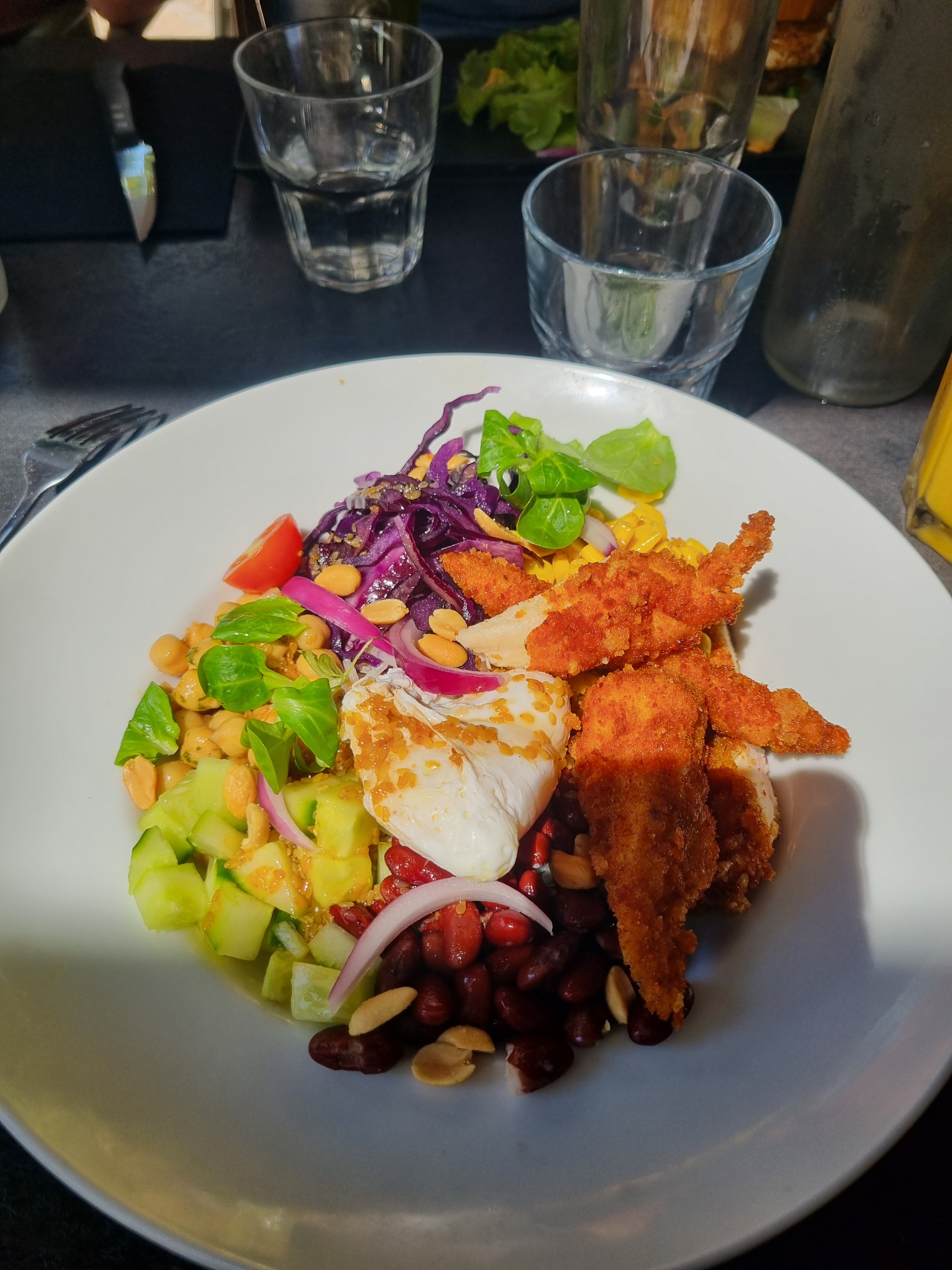 Accueil du personnel très aimable et professionnel. Endroit sympa, terrasse plaisante. Par contre, j'en avais un bien meilleur souvenir gustatif. J'ai certainement fait le mauvais choix : la salade Poke bowl saumon...rien de travaillé dans l'assiette. Maïs, pois chiches et oignons grillés en boîte, chou rouge et carottes râpées, rien de transcendant. Riz cuit, sans sel ni aucune épice, enfin saumon gravlax sans aucun goût (aneth, sel, poivre,sucre oubliés). Très déçue aussi par la vinaigrette de l'huile et...de l'huile( de qualité moyenne). Je n'ai pas terminé car ça trempait trop dans l'huile. Pour 17€, même le saumon ne les justifie pas. D'où les 3 étoiles, cette assiette n'en vaut pas plus, trop déçue désolée.