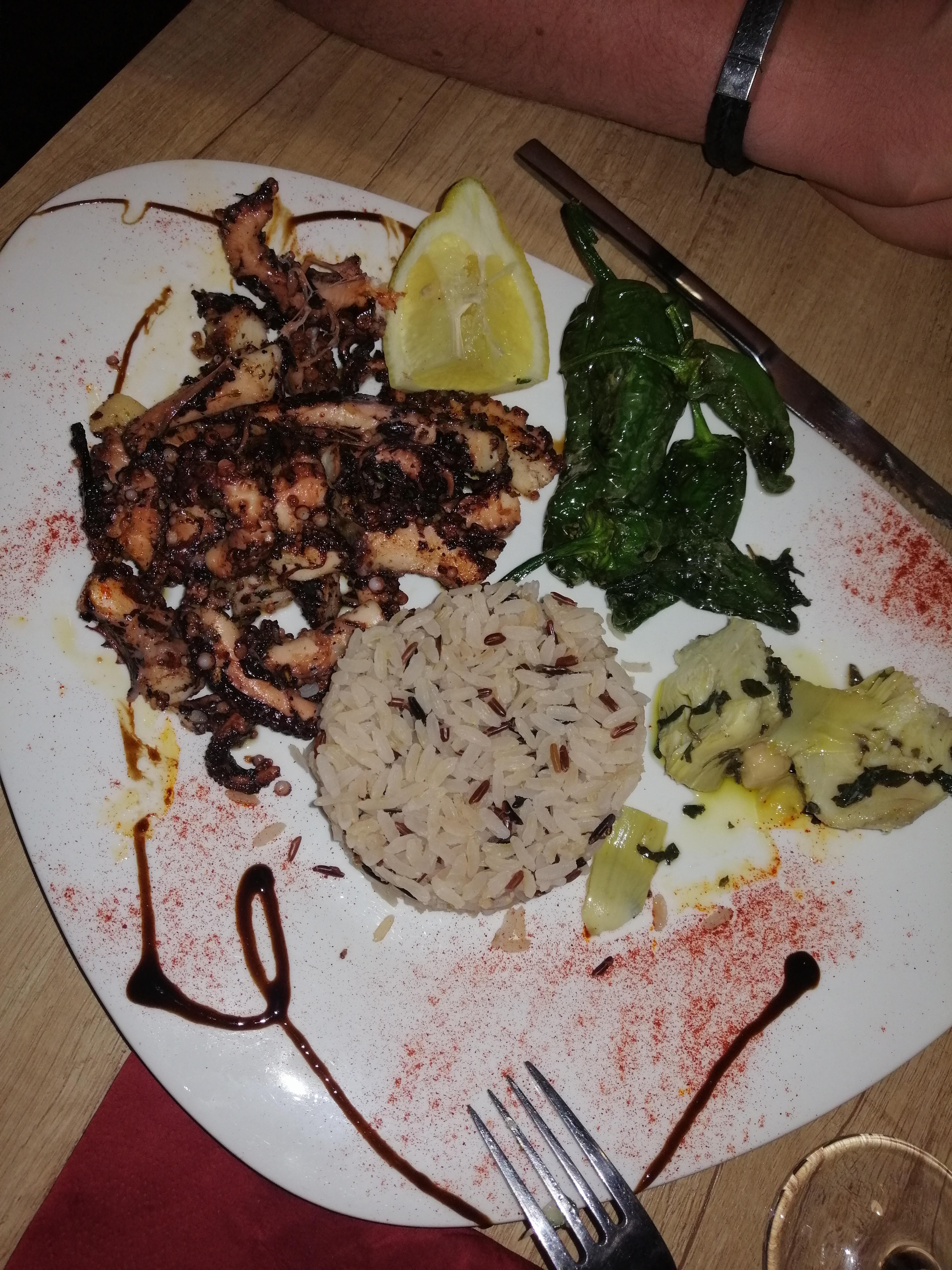 Poulpe grillé accompagné de riz safrané et poivrons grillé super bon prix correct seul bémol ne prend pas la cb....