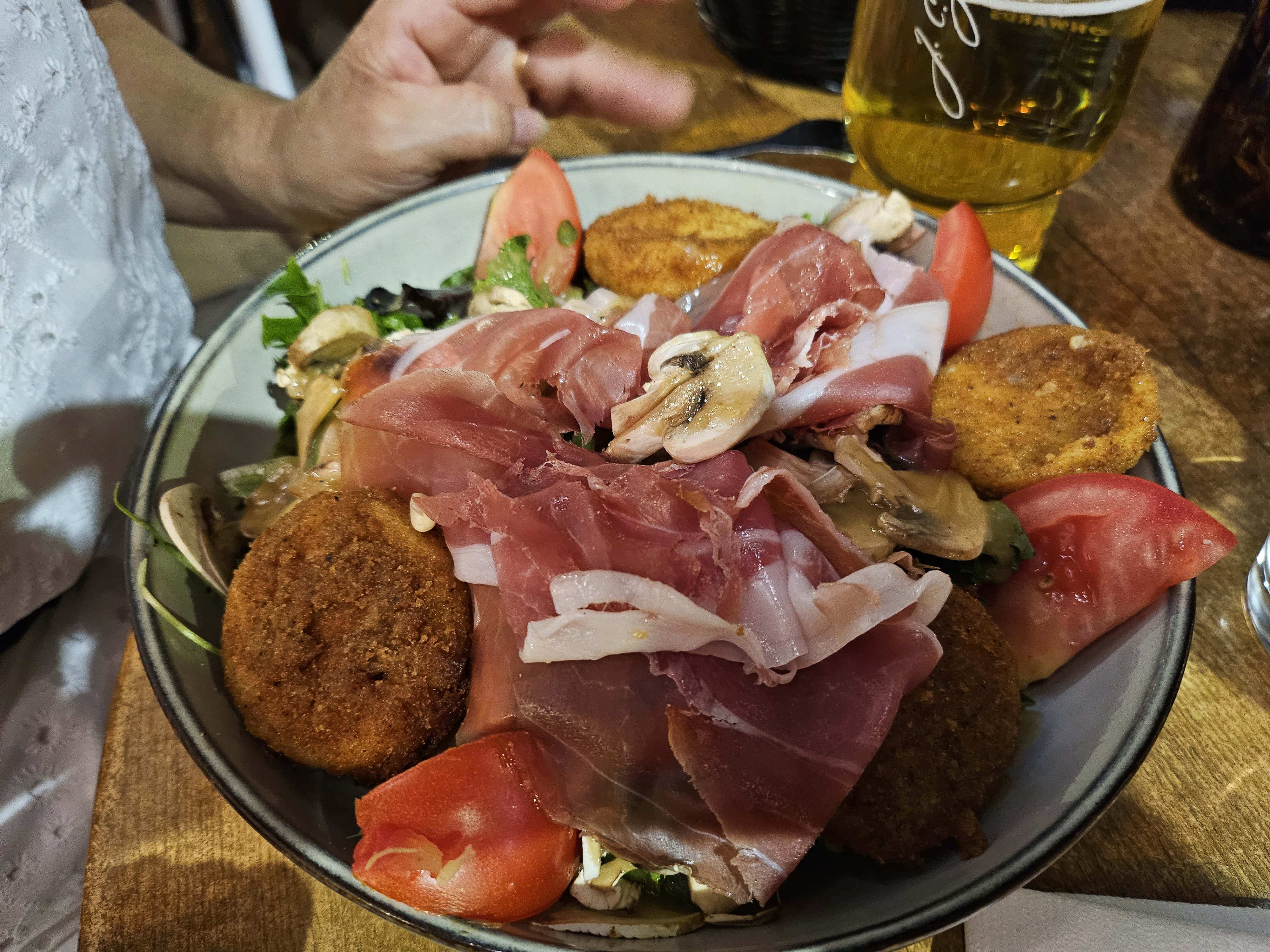 Pris salade chèvre chaud pané. Très bien avec 4 chevres. Salade nicoise avec du vrai thon mi cuit. Belle quantité. Serveurs hyper sympa qui a re rempli nos gourdes d eau fraîche. Je recommande.