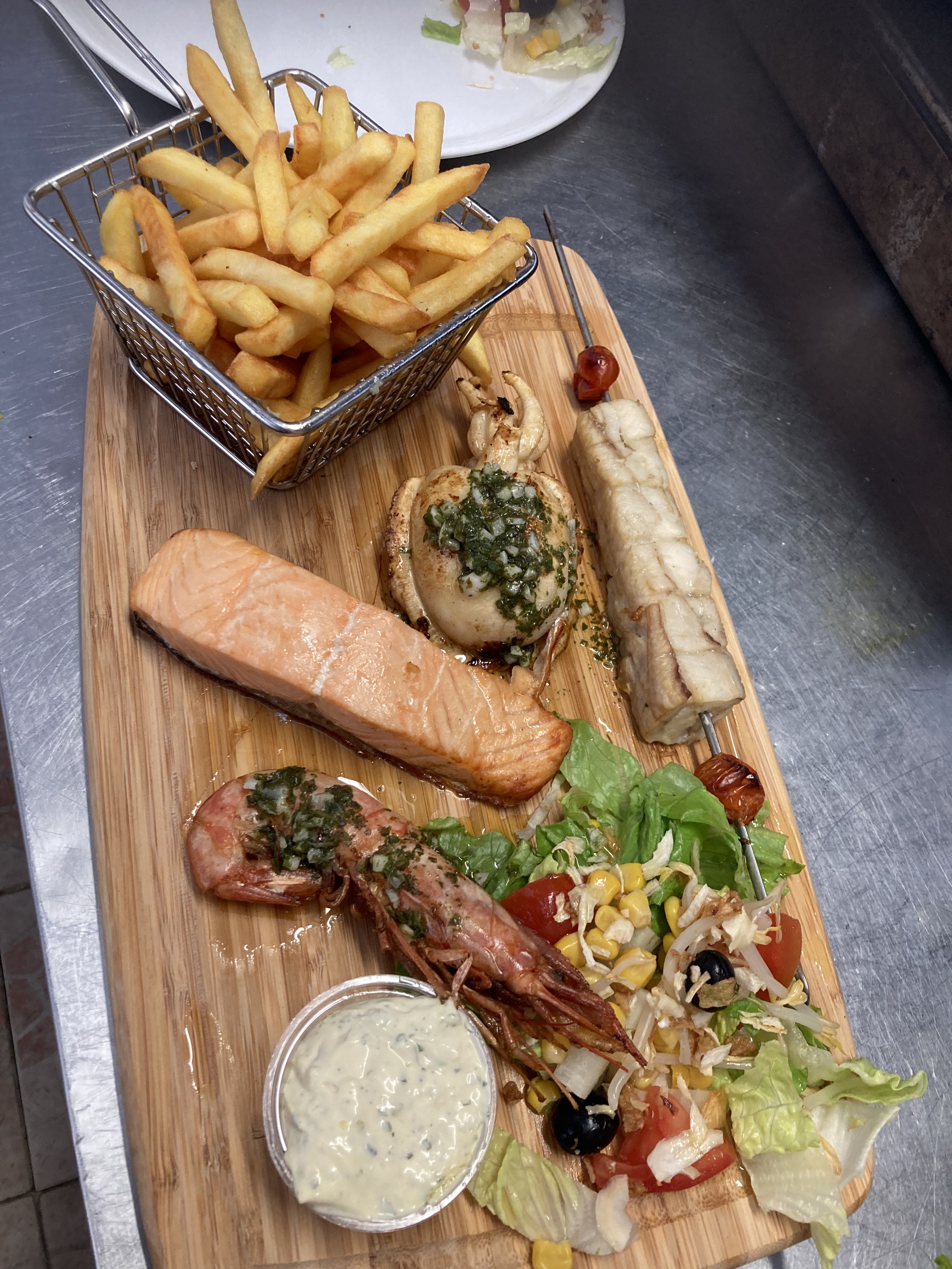 Temps d'attente long, oubli de l'assiette tapas, les plats avaient été préparés avant, du coup ils ont ramenés les tapas puis nous ont servis une heure plus tard les assiettes déjà préparées avant les tapas. Biensur ils ont été mis au micro onde et le saumon remis sur la poêle. Pain trop cuit mais le serveur fait une blague douteuse sur leur couleur