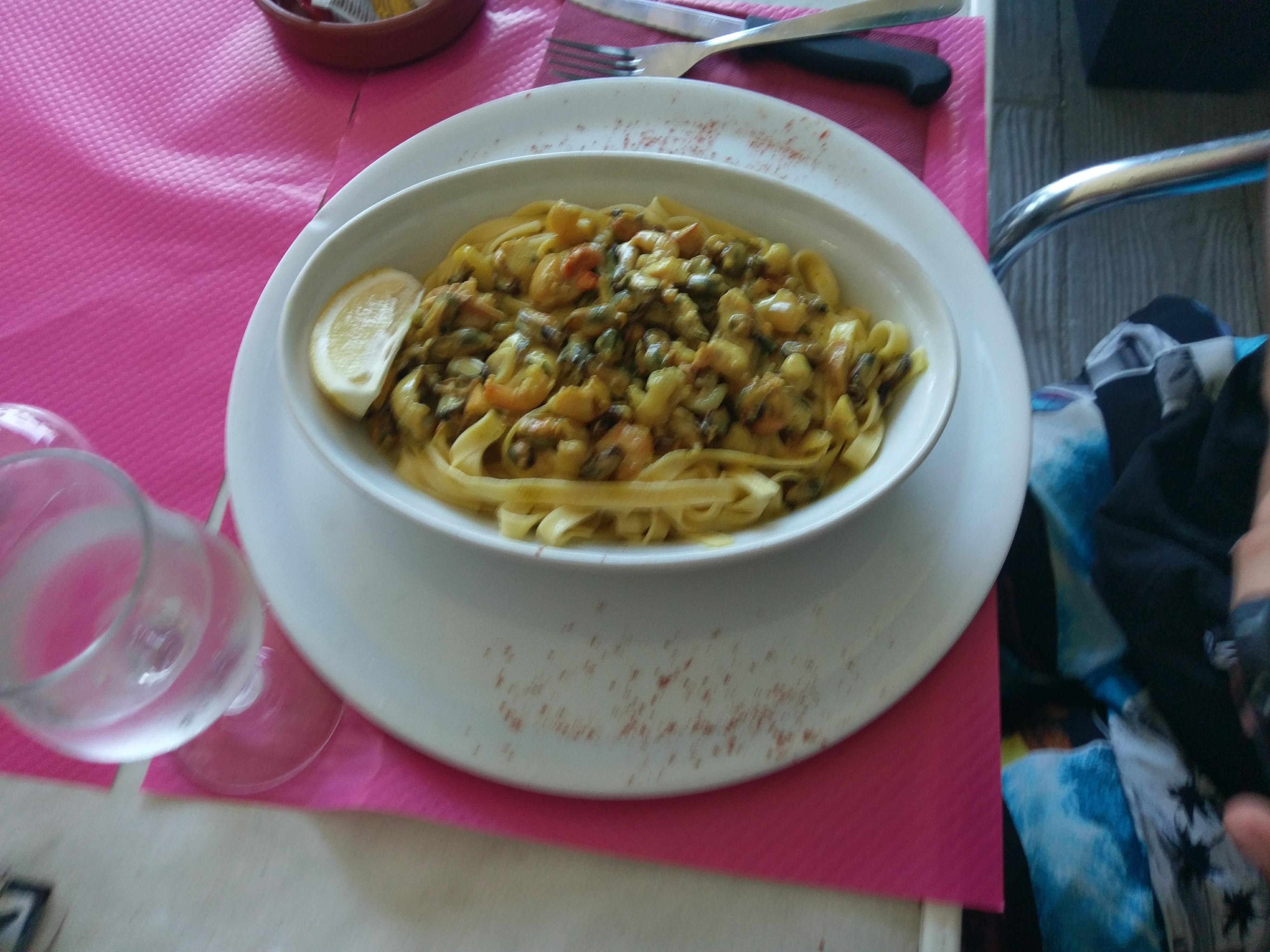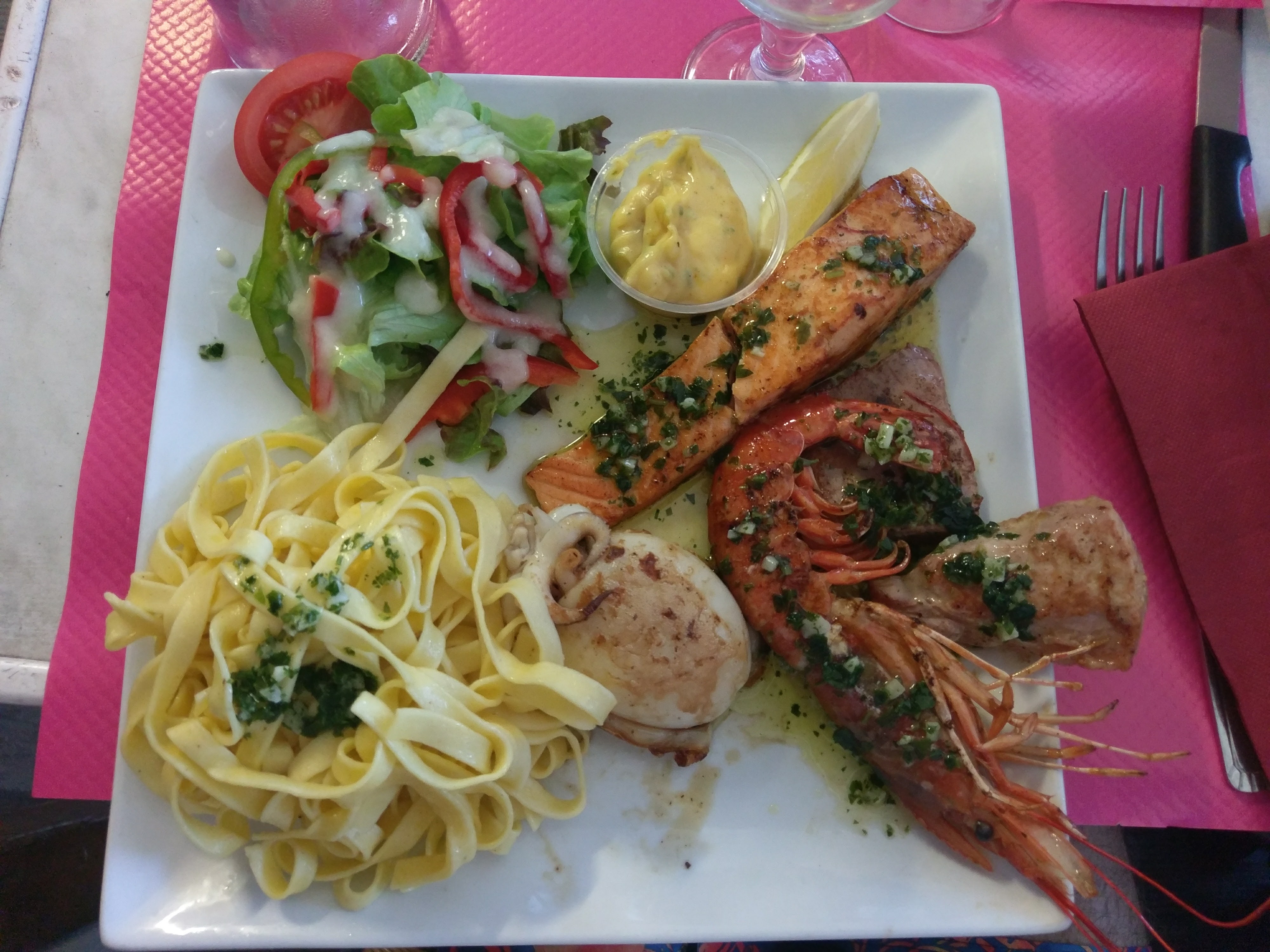 Déçu de la qualité du repas malgré les quantités généreuses les assiettes étaient sans goût les pâtes aux saints Jacques étaient trop cuite la salade de riz sans saveur la planche à tapas juste bof et pour fini pour l accompagnement des ses brochettes mon mari a demander des pâtes… et bien il a eu une assiette avec frites salades puis ils lui ont enlevé les frites pour lui rajouter des pâtes à l’eau et pour finir lui ont apporté un bol de sauce aux fruits de mer avec une crevette perdu à l intérieur tout ceci pour accompagner une brochette de bœuf grillée bref le seul point positif est le service assuré par un petit jeune très agréable mais malheureusement sans expérience quand à la serveuse expérimentée elle vous regarde en fumant en plein service et envoi le jeune homme comme une marionnette de table en table sans compter que le tarif de la note pour ce que nous avons mangé était très élevé je ne vous recommande pas cet établissement
